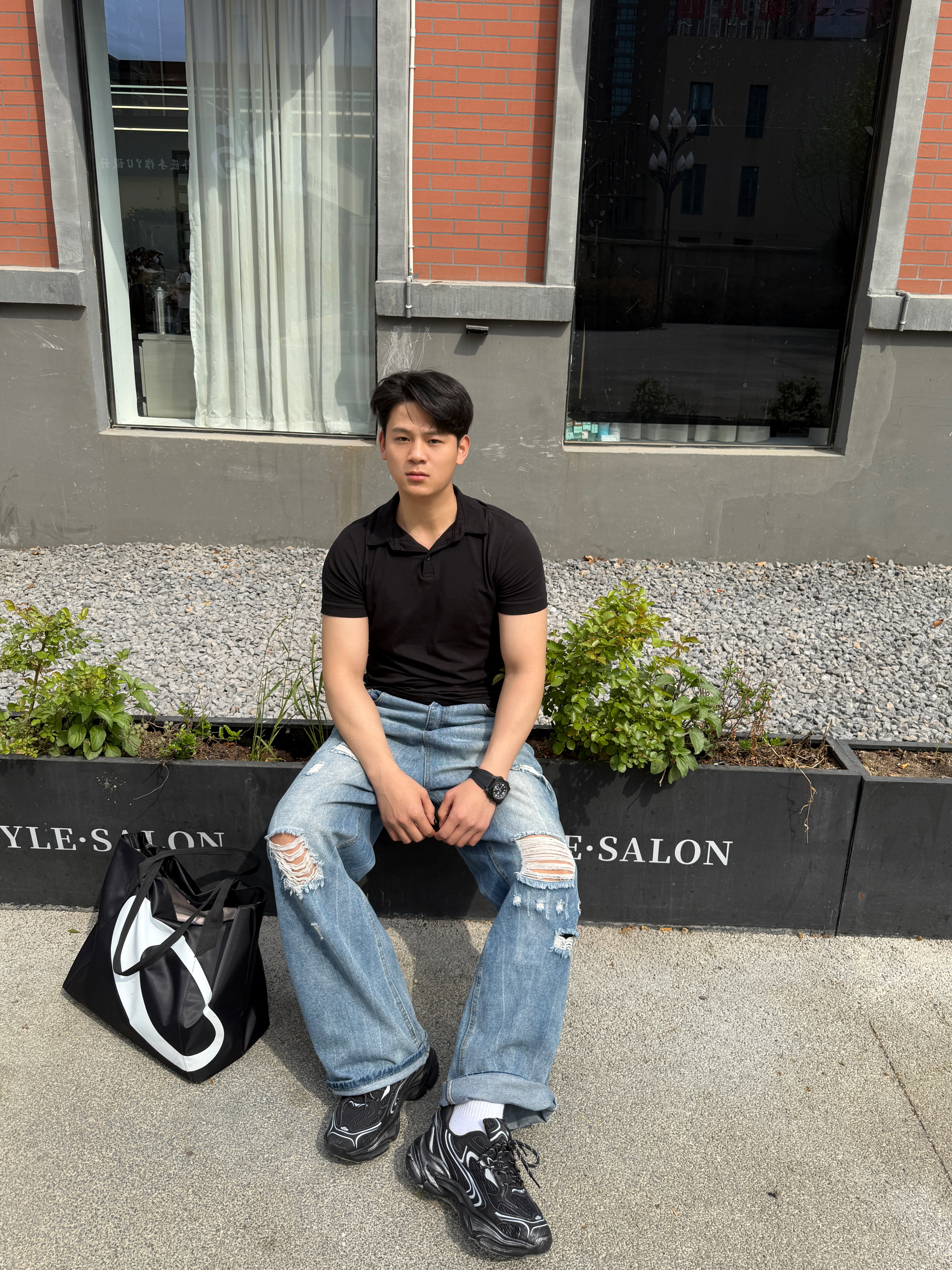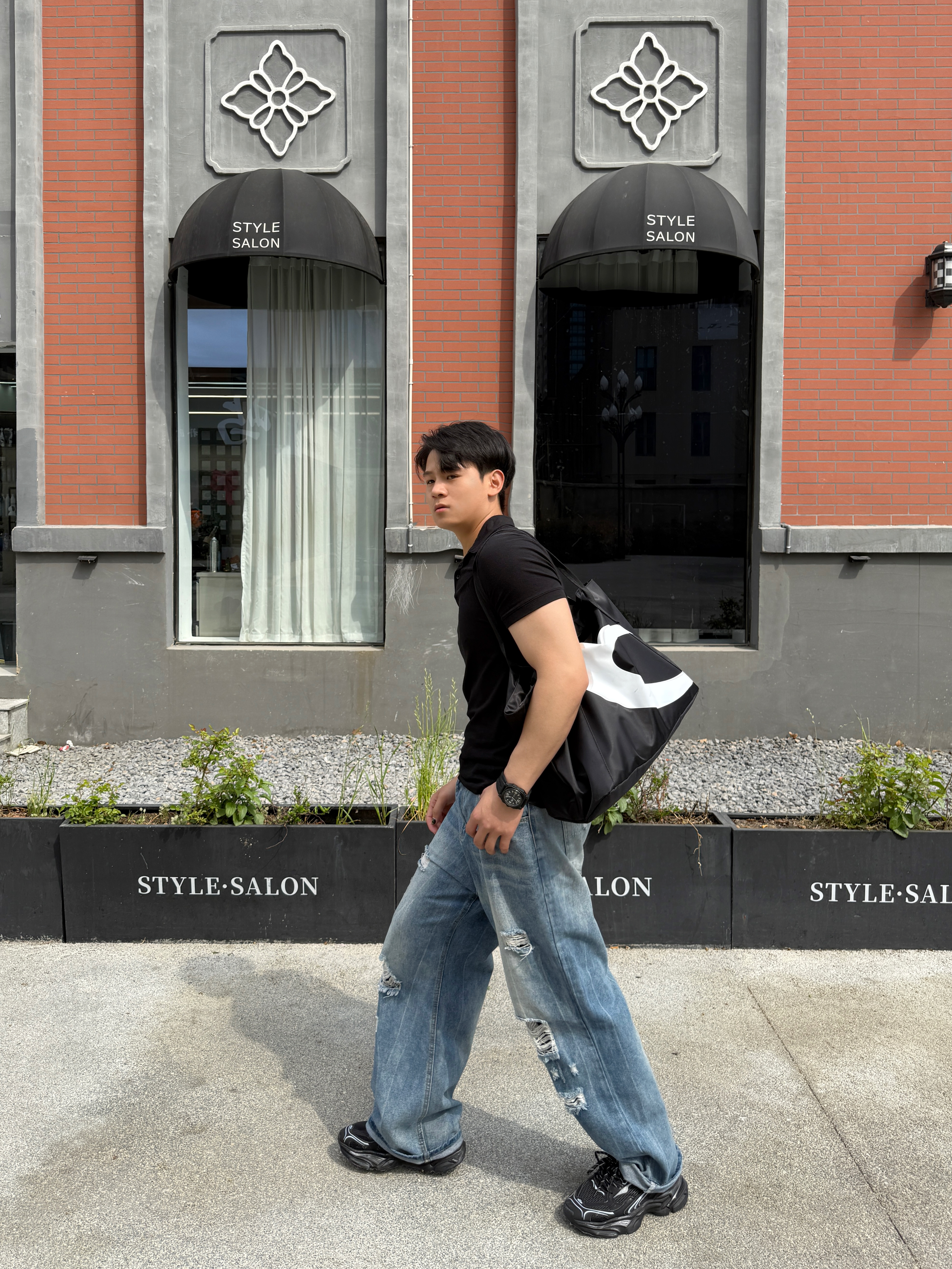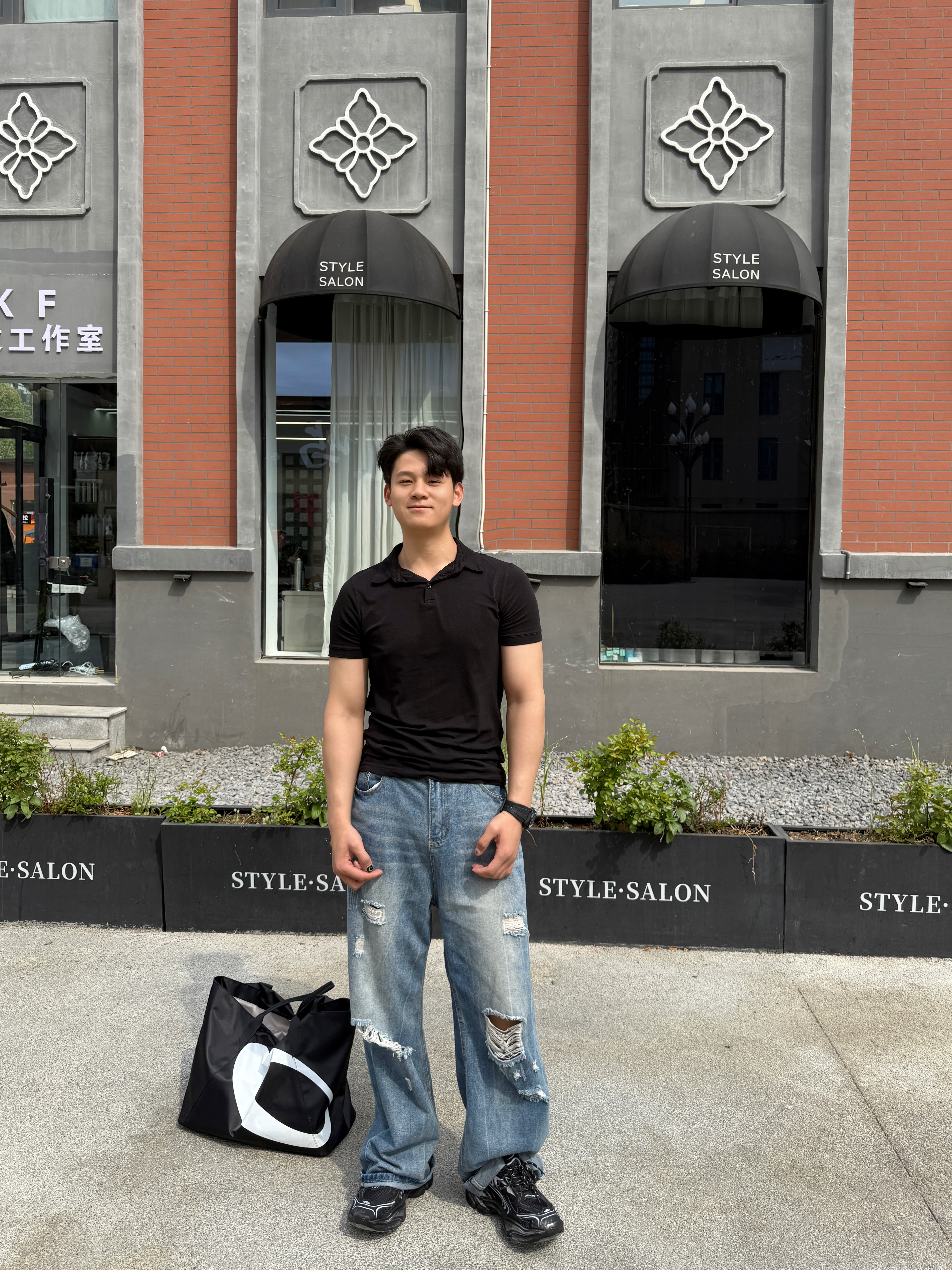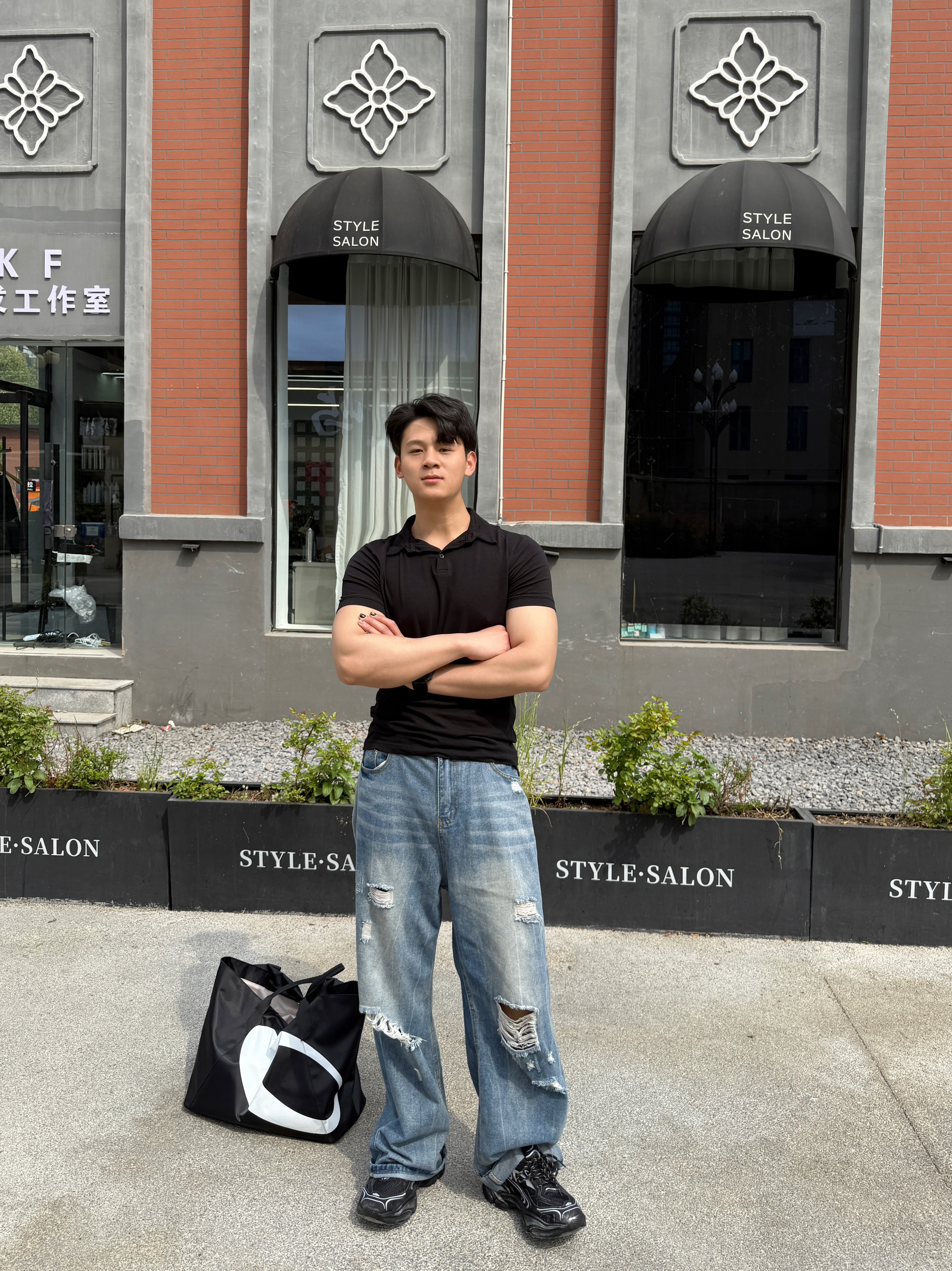 鞋子的选择对穿搭也至关重要 上衣我选择一件紧身翻领商务短袖 修身正肩版型上身有型还显壮 裤子我选择一件宽松蓝色破洞牛仔裤 鞋子我选择一双增高老爹鞋 再拎一个黑白托特包增长层次感 整体一身下来美式通勤感多一点