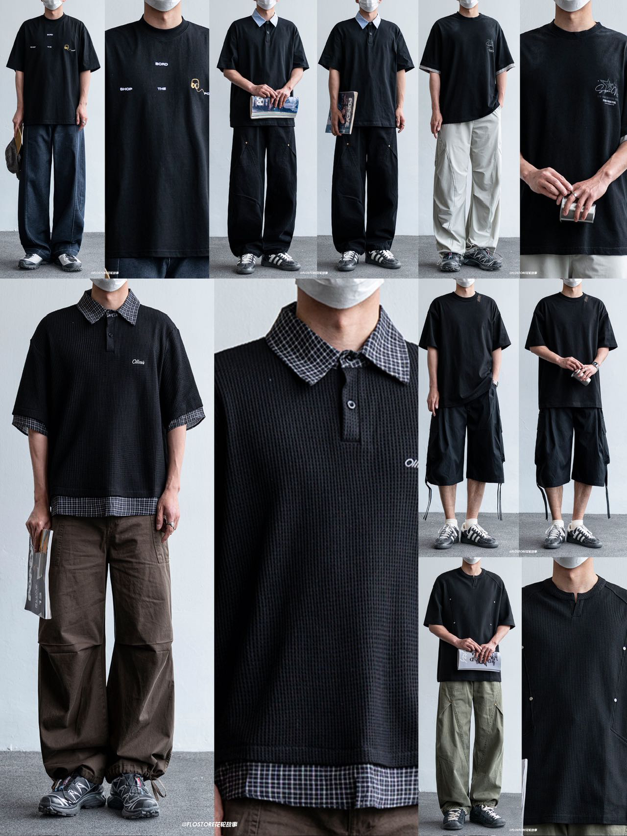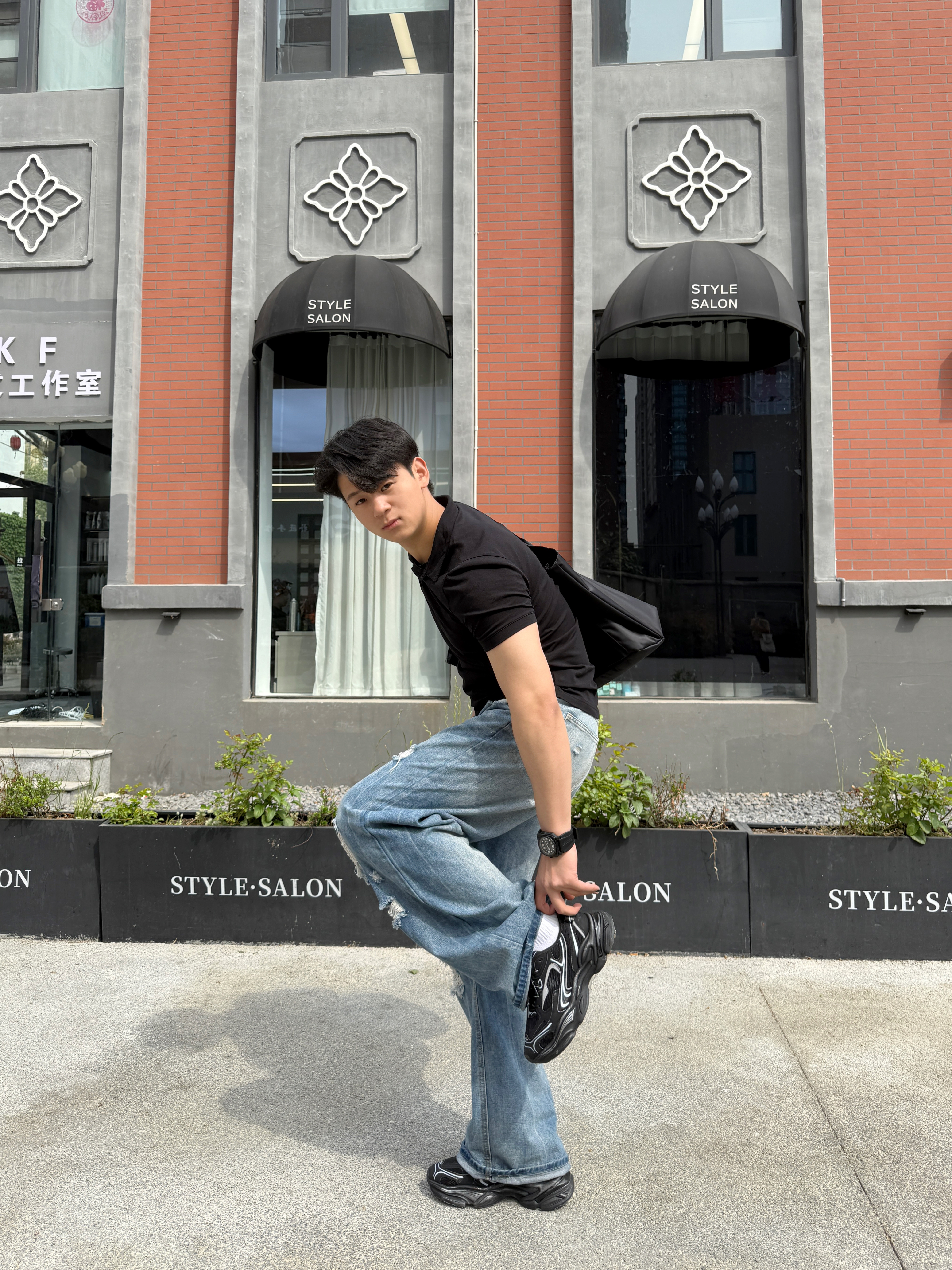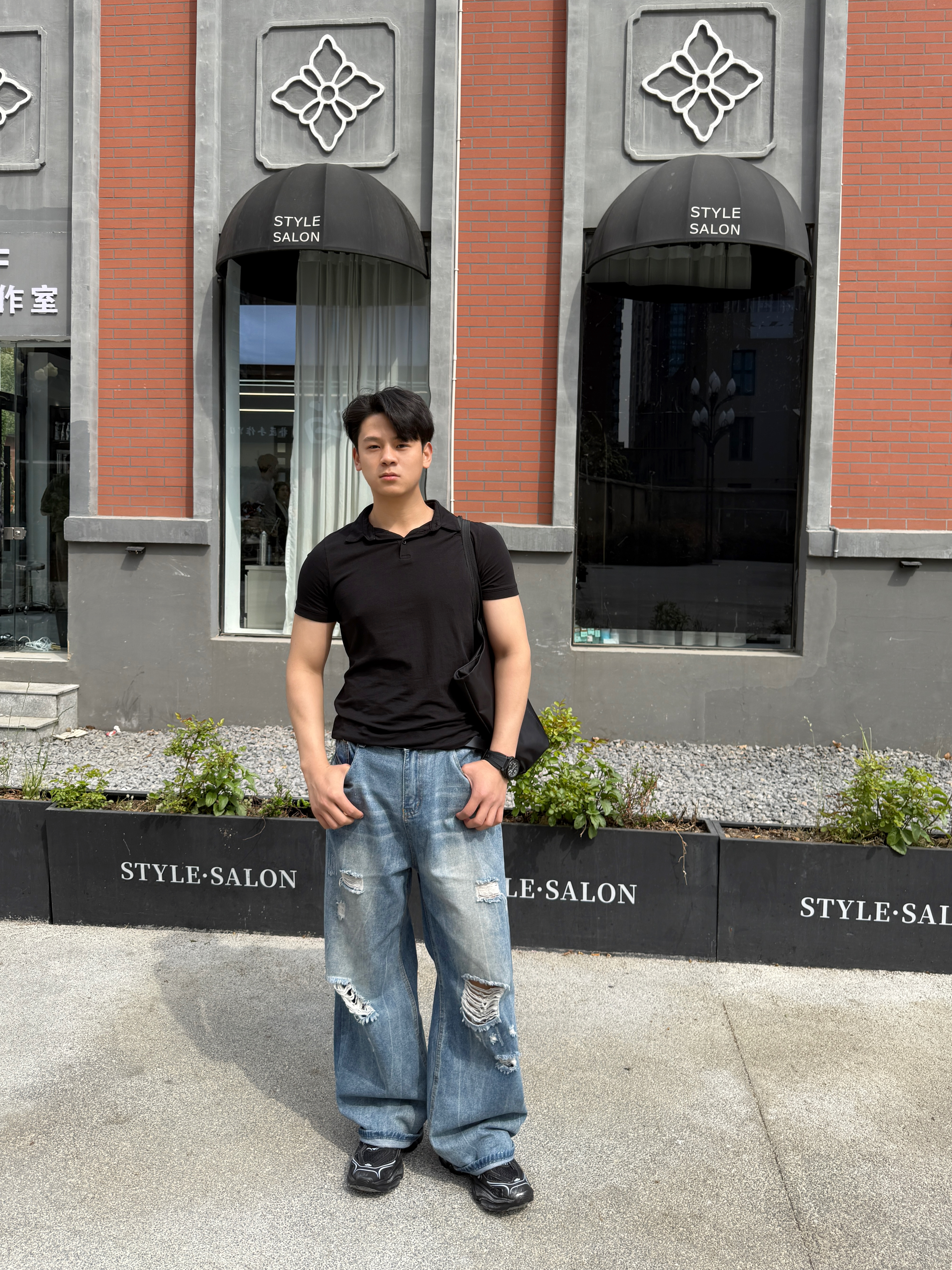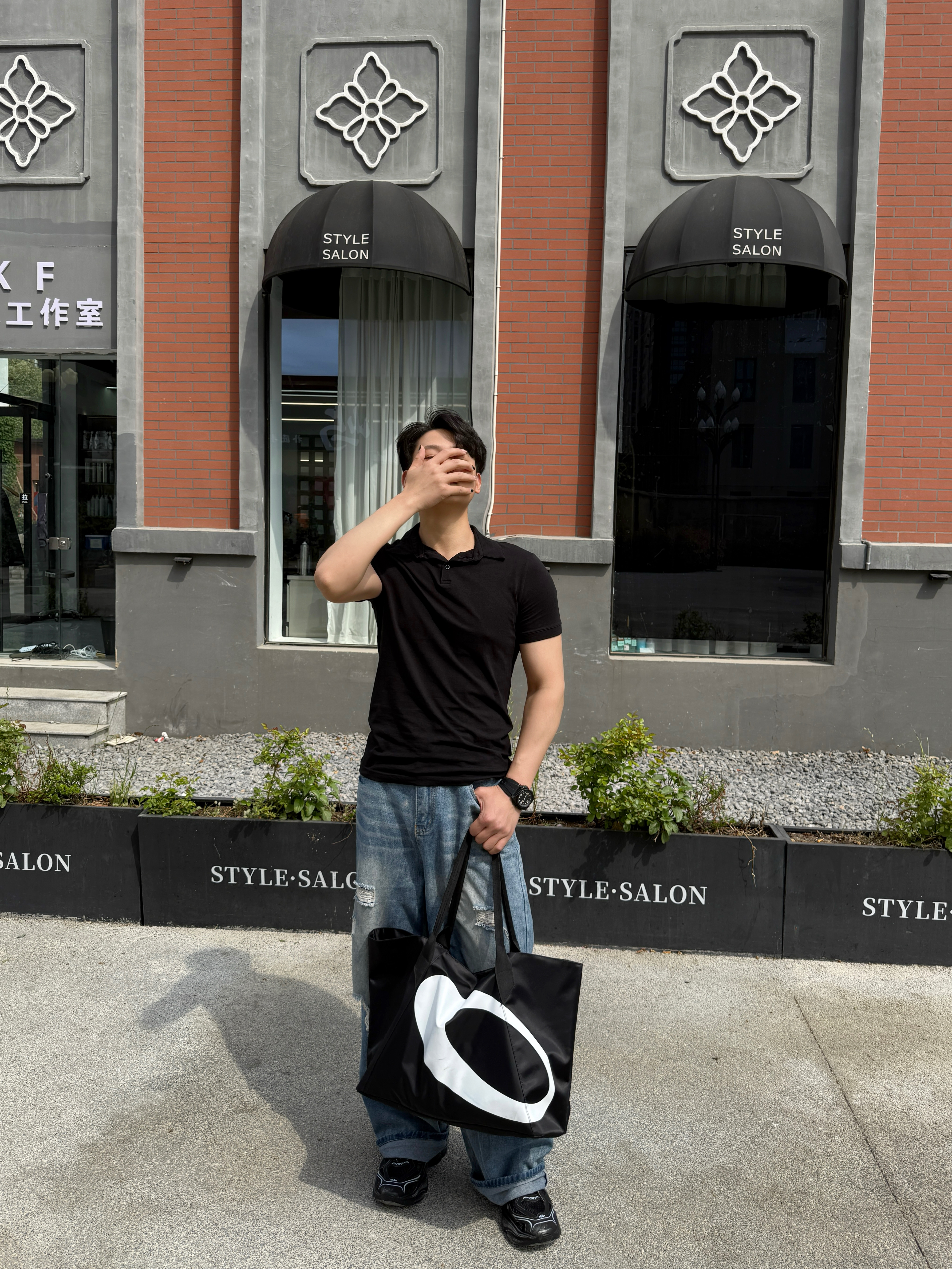 鞋子的选择对穿搭也至关重要 上衣我选择一件紧身翻领商务短袖 修身正肩版型上身有型还显壮 裤子我选择一件宽松蓝色破洞牛仔裤 鞋子我选择一双增高老爹鞋 再拎一个黑白托特包增长层次感 整体一身下来美式通勤感多一点
