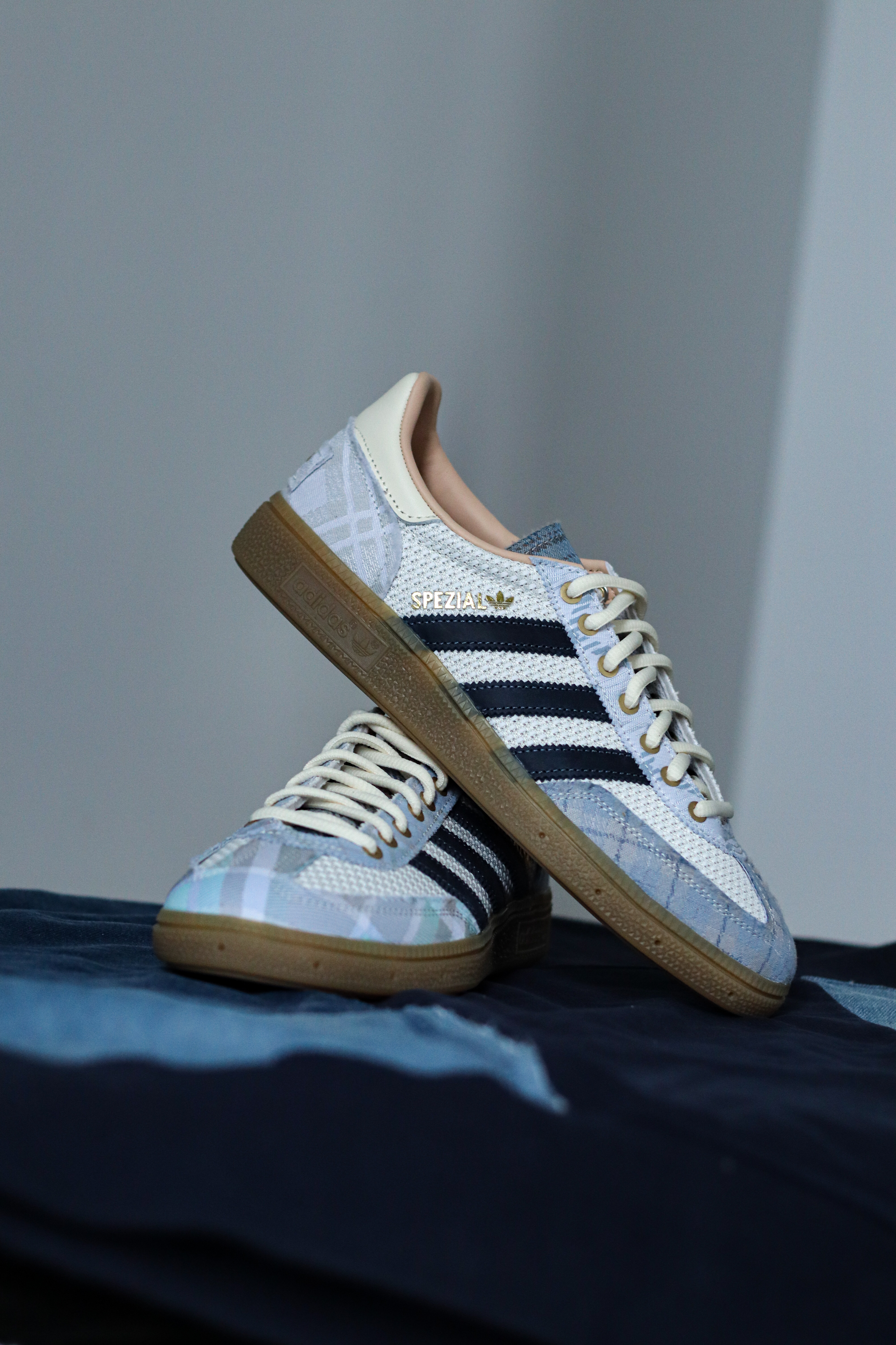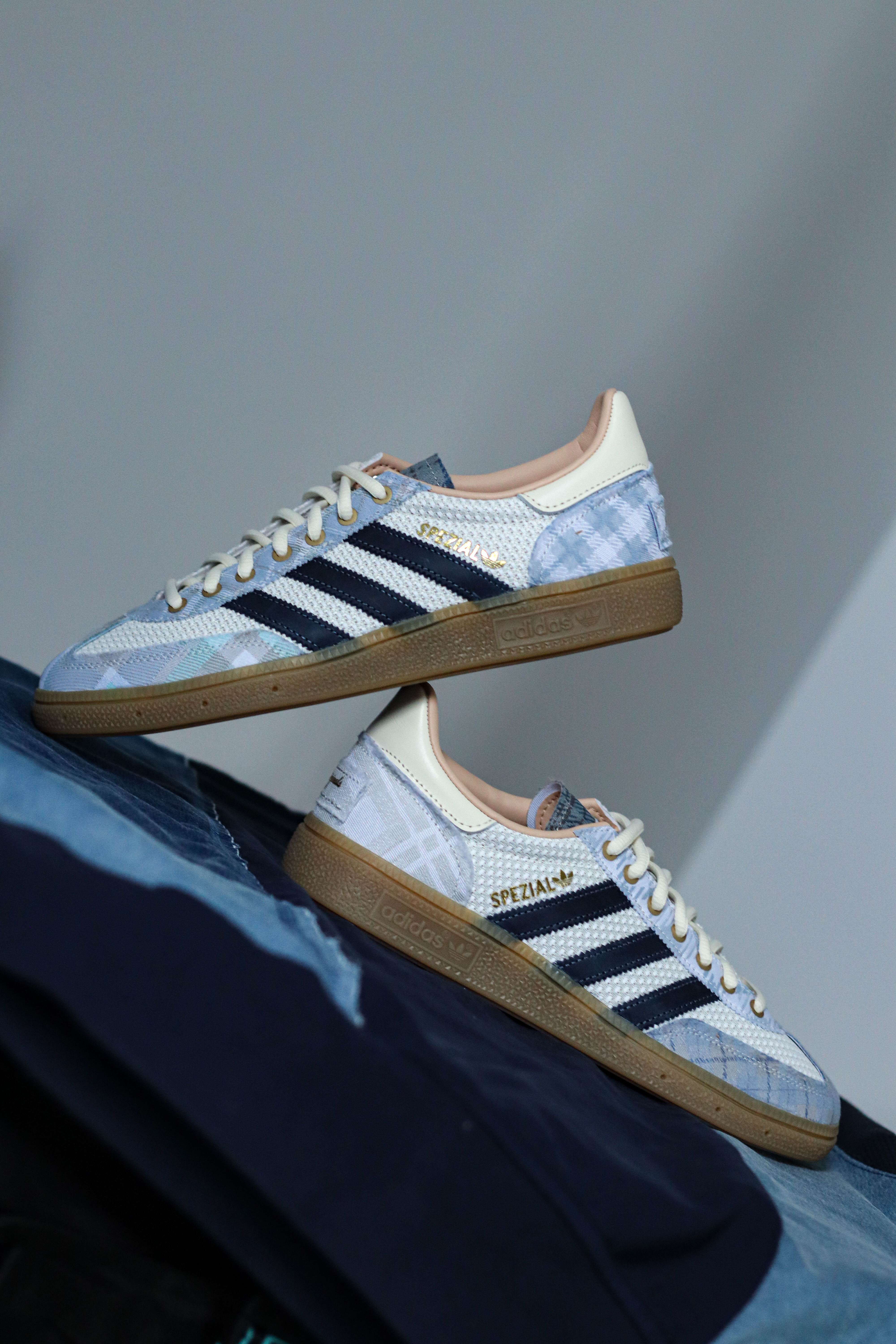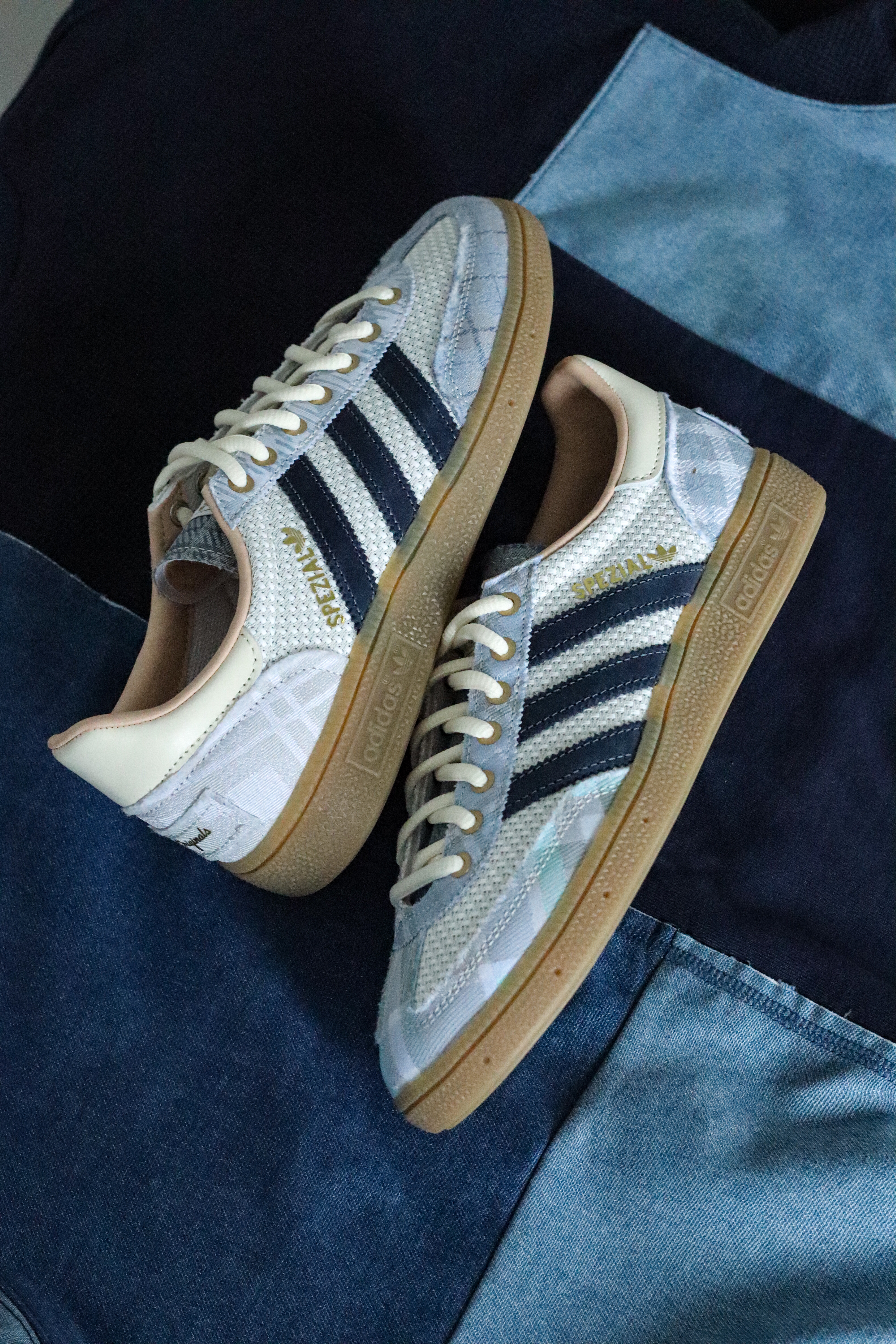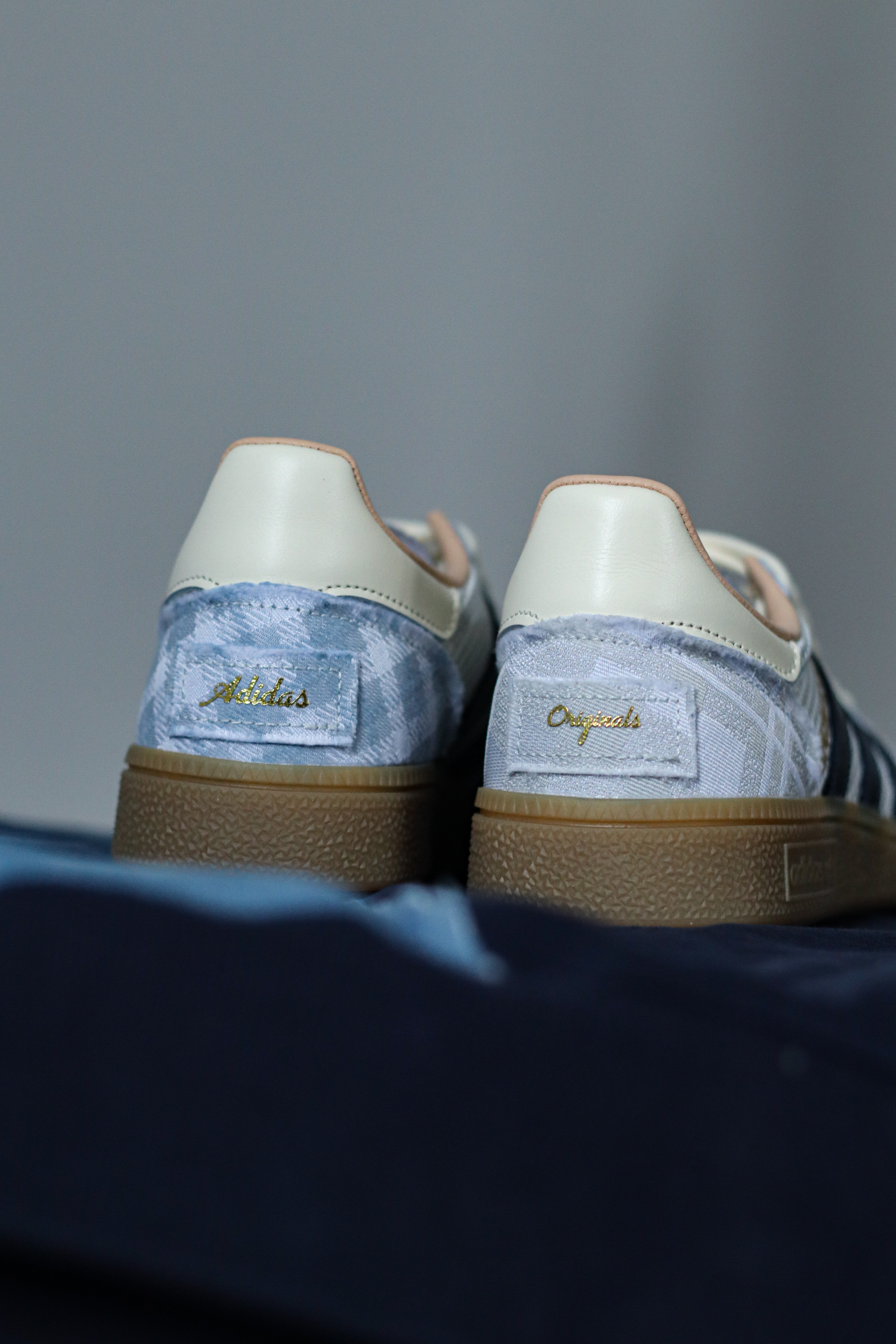 德训鞋除了Samba,我觉得HANDBALL SPEZIAL这个鞋型也很复古好看~ 整体也是经典的T头搭配修长的薄底鞋型,上脚很优雅秀气~ 这双的配色和材质也挺特别的,深浅不一的蓝色格纹牛仔布,拼接白色网眼,颜值高,质感也不错~ 金色的鞋眼孔,以及鞋侧和后跟的金色小标,有点复古小高级~ 日常通勤和出街搭配穿都很不错~不知道大家鞋柜里的宝藏德训鞋是什么呢?