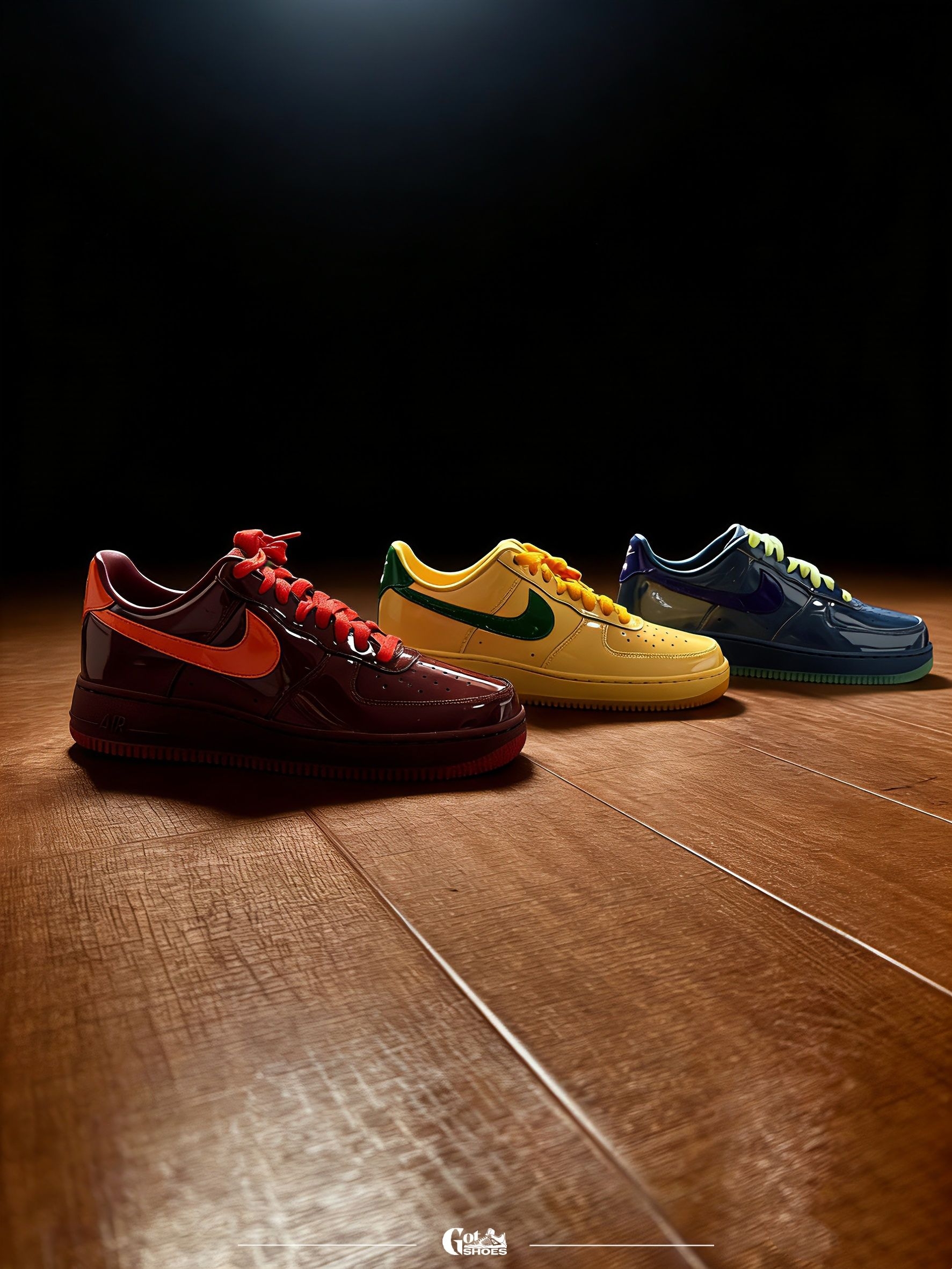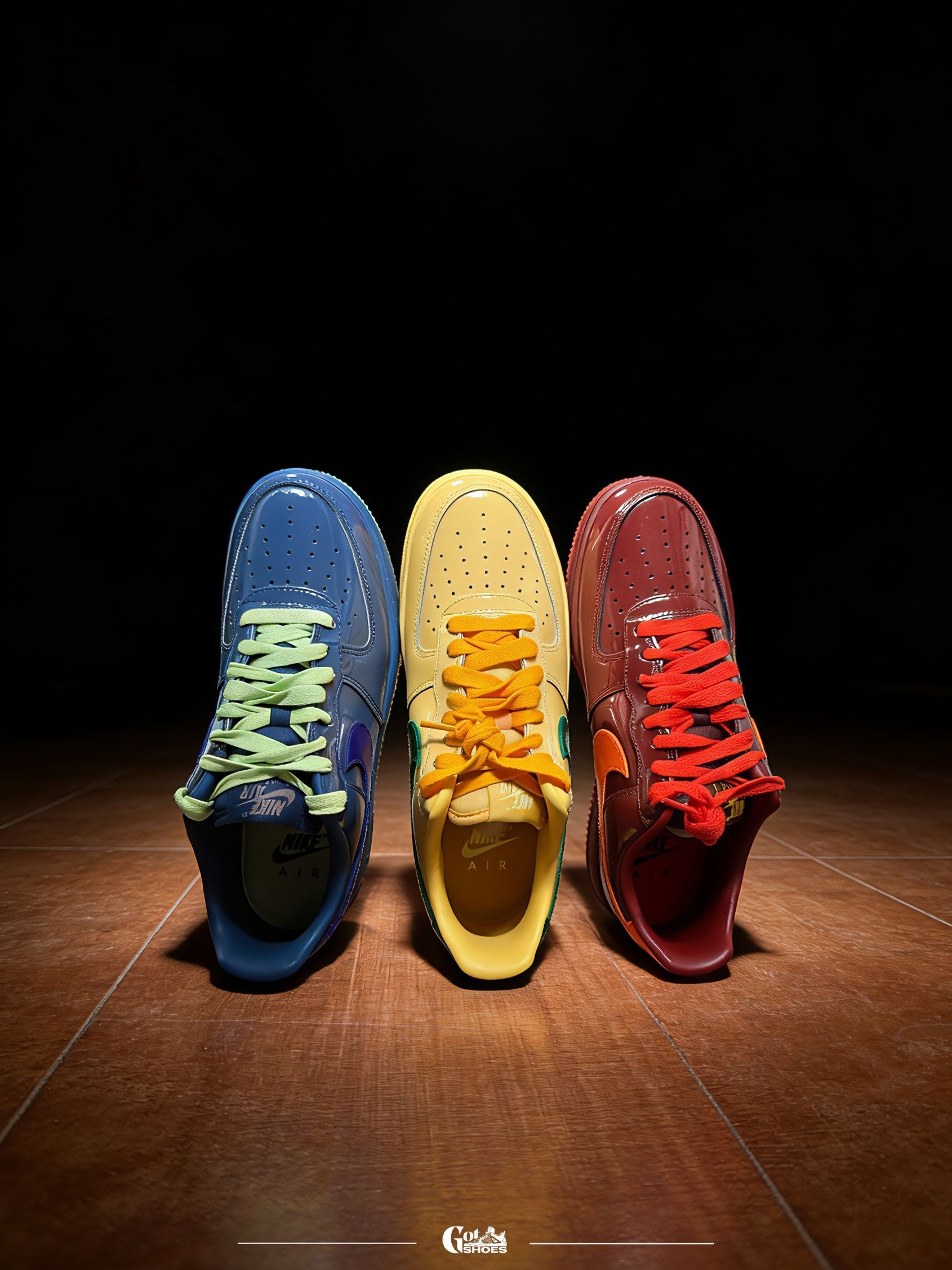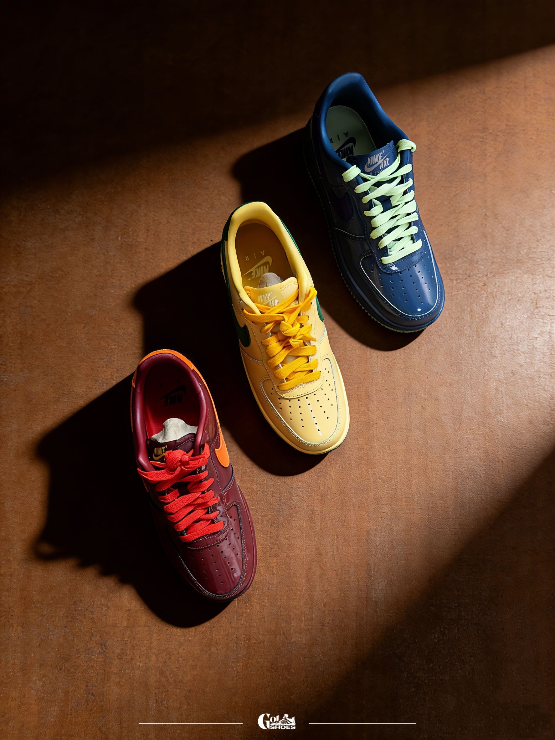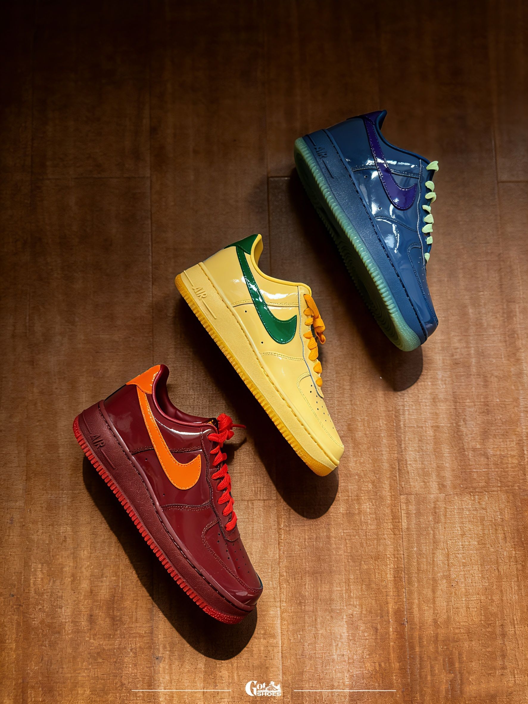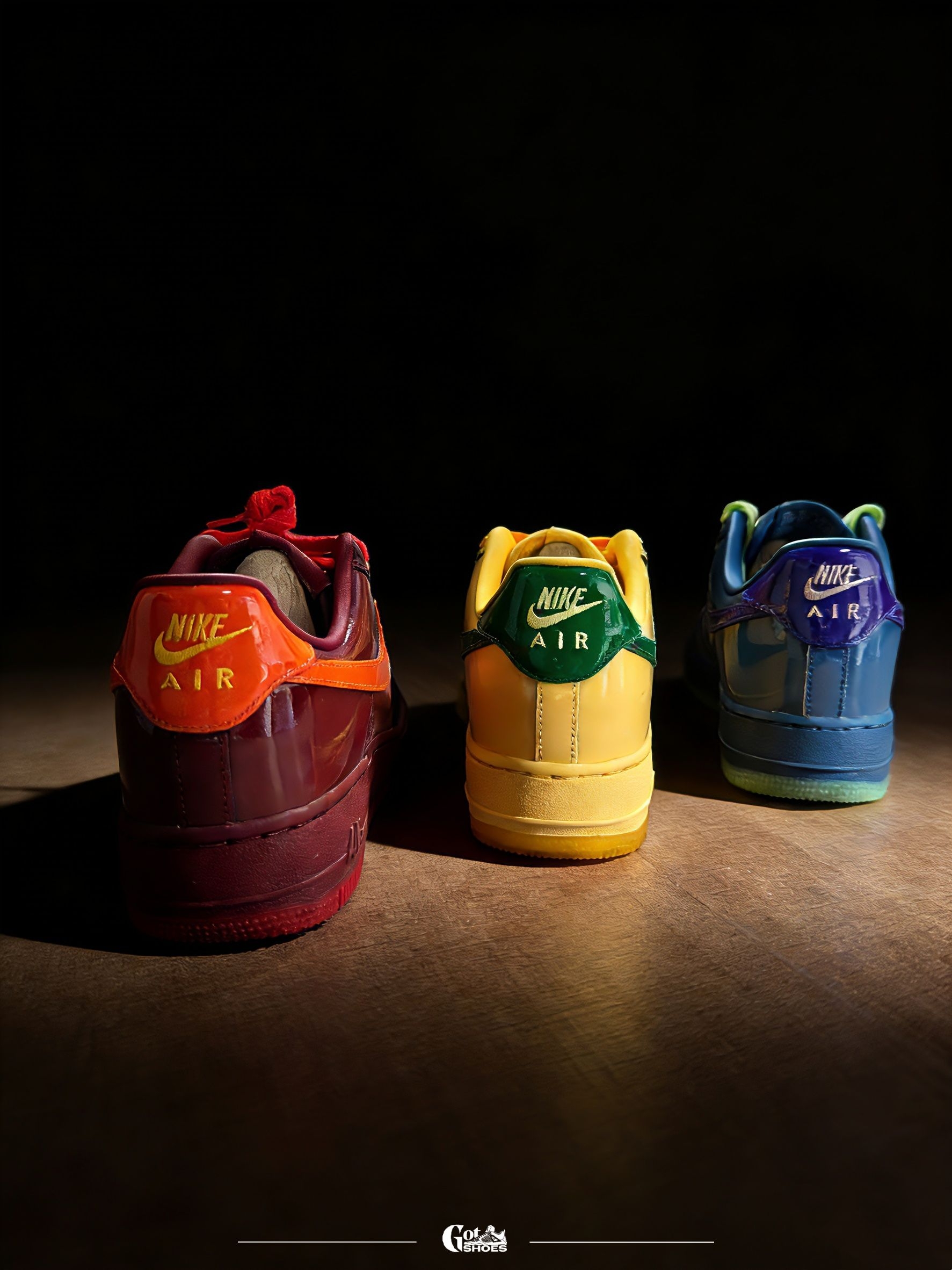 这三双漆皮AF1真的把「复古玩色」玩明白了😭 亮面漆皮自带高级光泽感,每一双都是视觉暴击: 🔴 酒红橙撞色:复古美式感拉满,上脚就是街头焦点 🟡 黄绿撞色:活力感爆棚,春夏穿搭的点睛之笔 🔵 蓝紫撞色:冷调高级感,小众不撞款,氛围感直接拉满 经典Air Force 1鞋型+漆皮材质,上脚硬挺有型,不管是日常通勤还是出街炸街都能打,鞋型不挑脚,百搭所有风格!