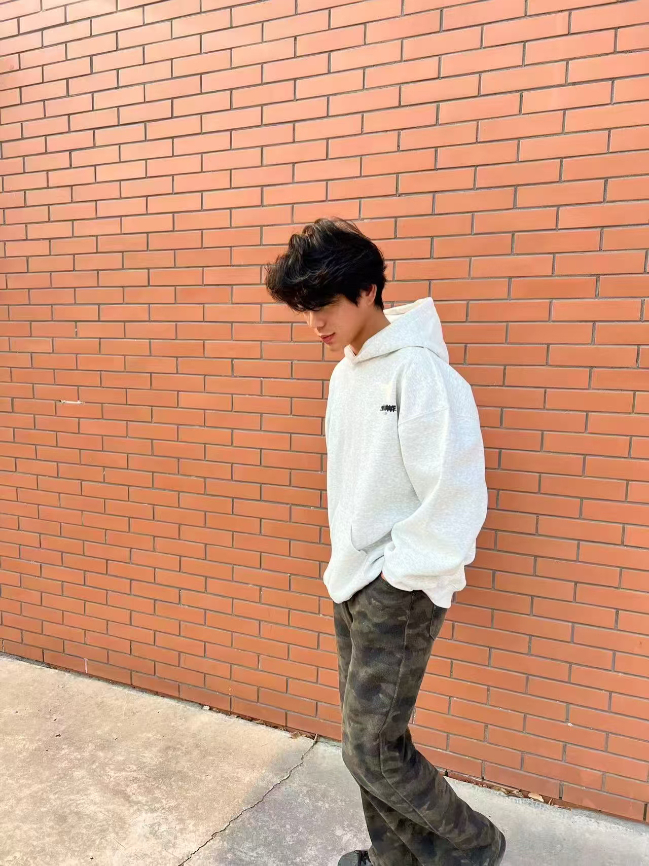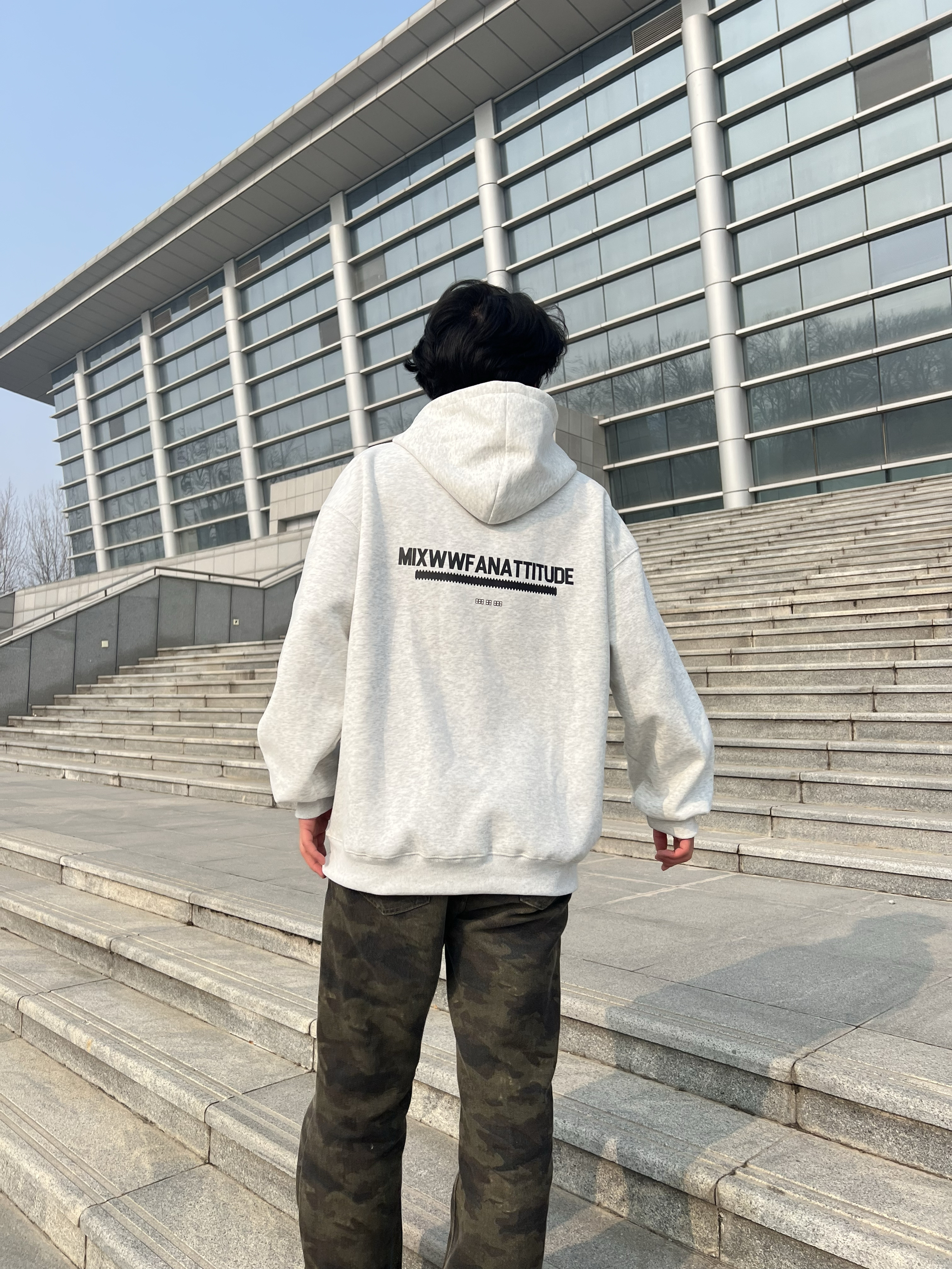 上身这件浅灰色连帽卫衣,面料厚实柔软,贴身穿很舒服,完全没有束缚感。背后的字母印花设计简约又有个性,给基础款增添了不少细节感。宽松的版型不挑身材,对各种身形都很友好,日常穿随性又自在。