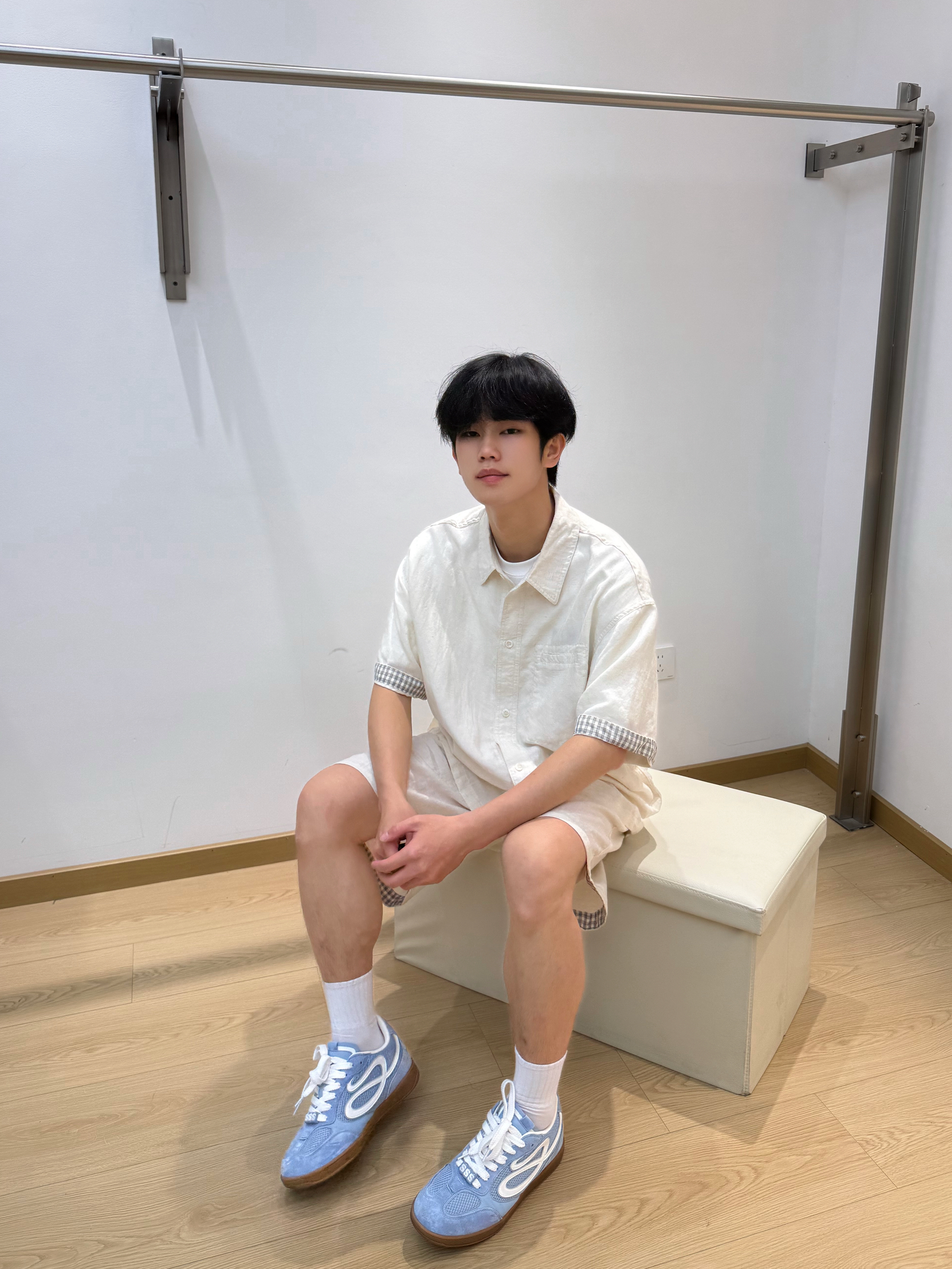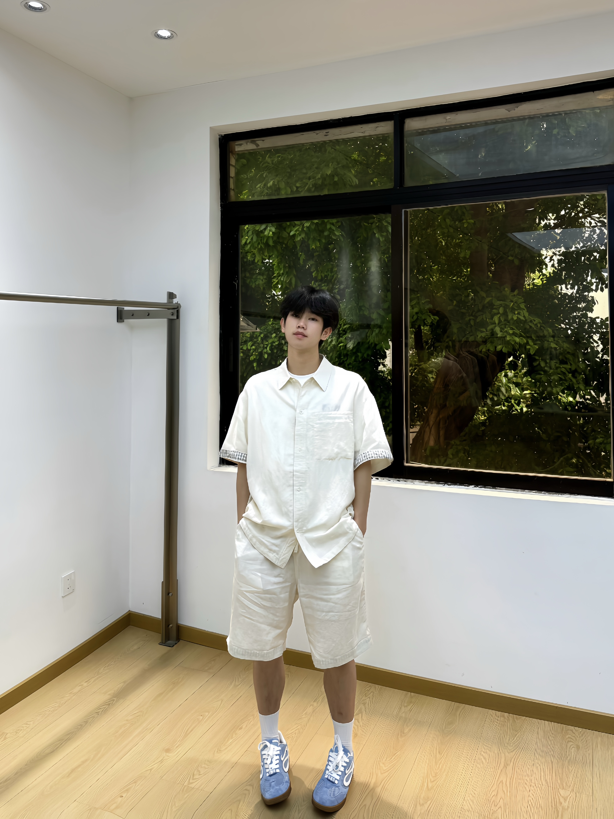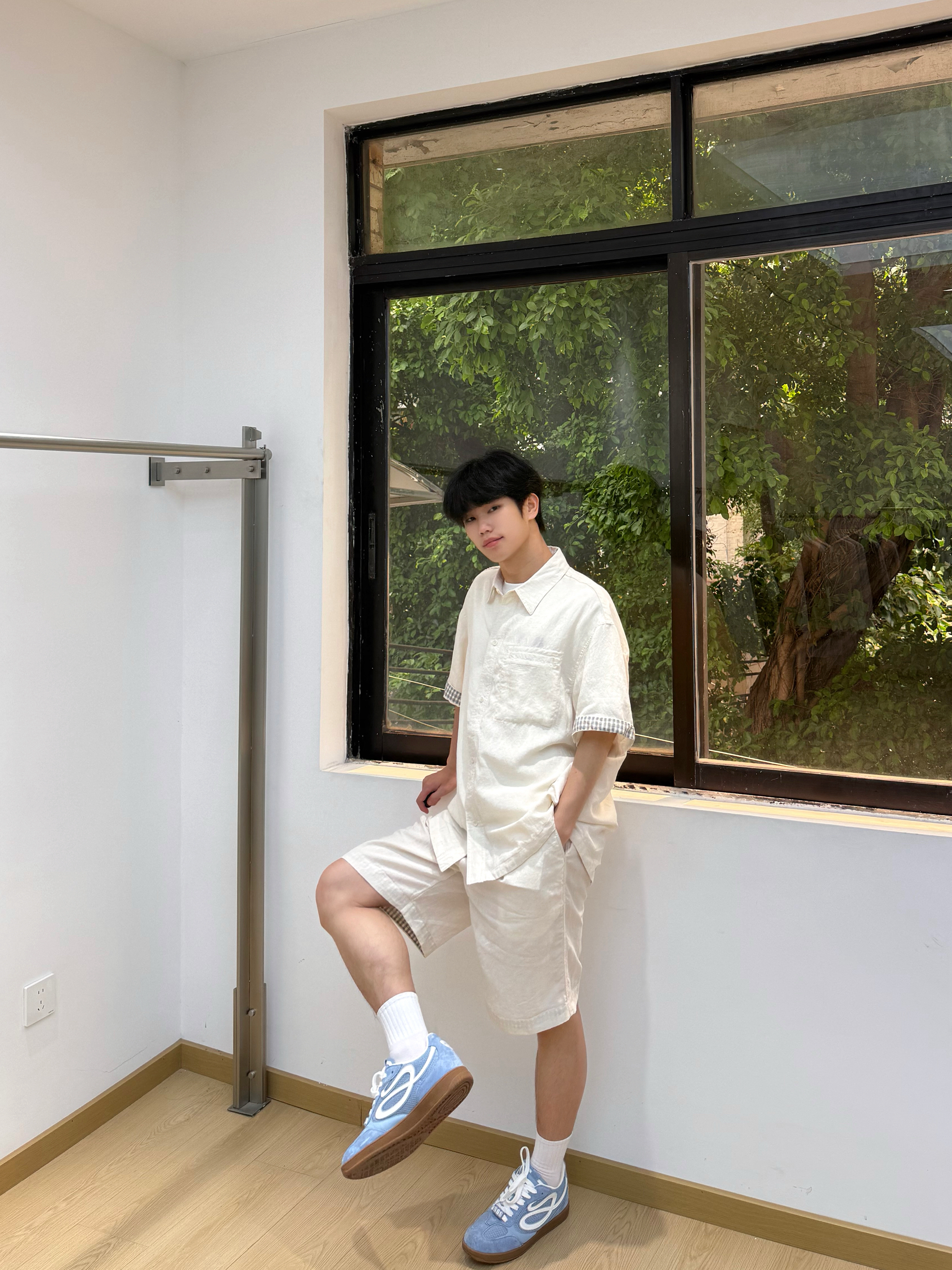 米白套装真的是懒人福音 宽松版型不挑身材,随便一套就很干净 蓝鞋一搭,清爽感直接拉满 男生夏天这么穿,谁看了不心动!