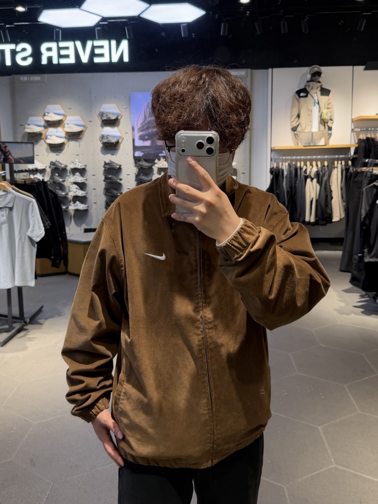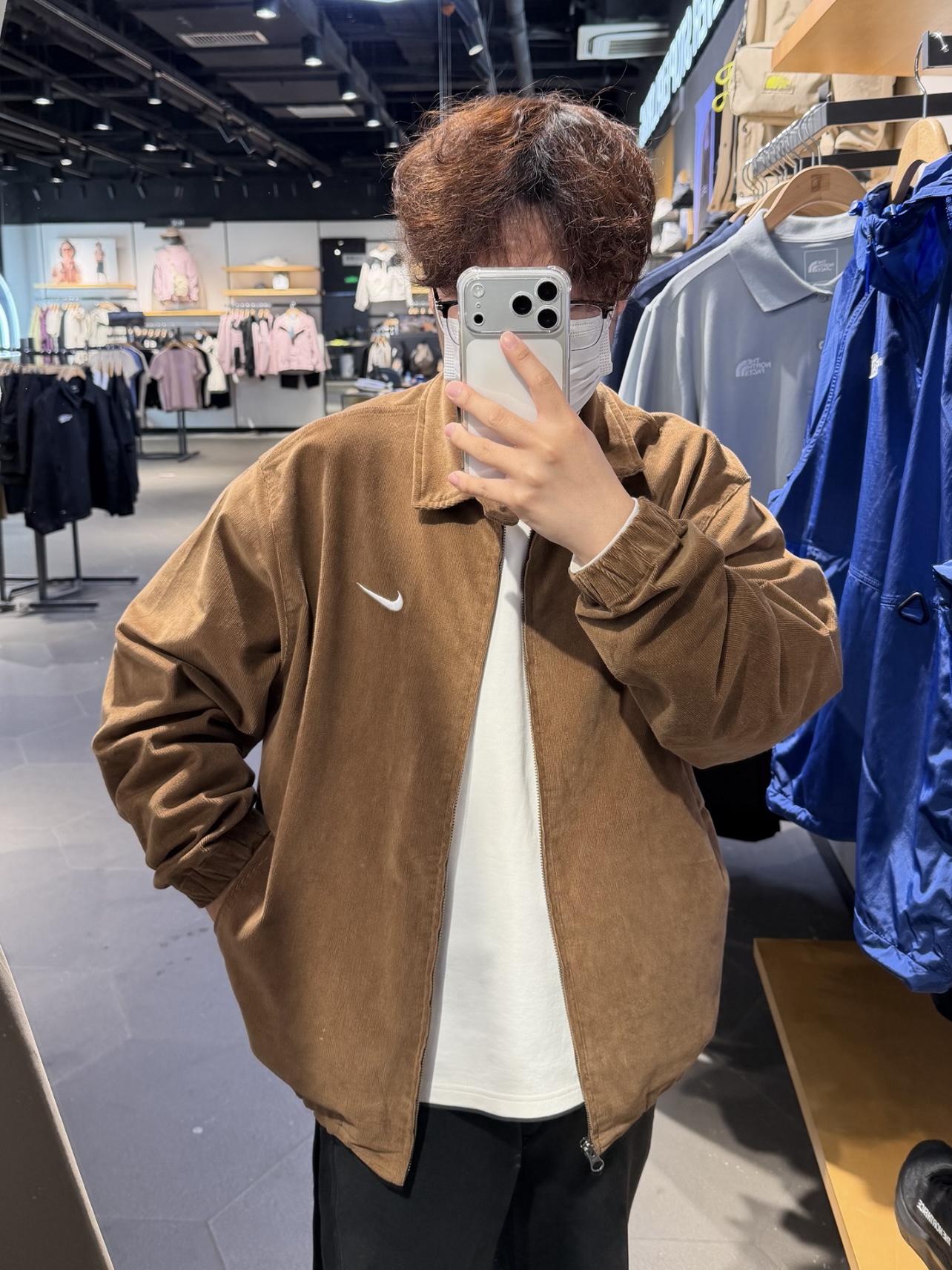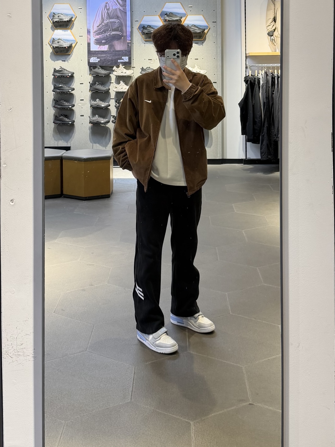 Nike这件基础款棕色麂皮绒外套我的最爱 宽松版型➕弹性收腰下摆 显瘦No.1 踏春出游绝对出片男女穿都酷酷帅✌️ 内搭白T即可黑色长裤加白灰运动鞋 170/130斤 👔 L 👖 M