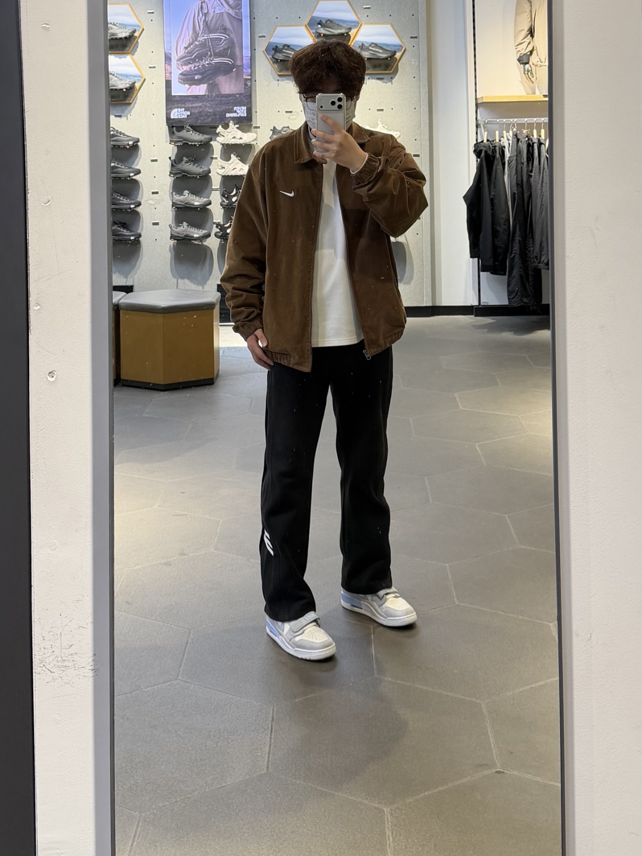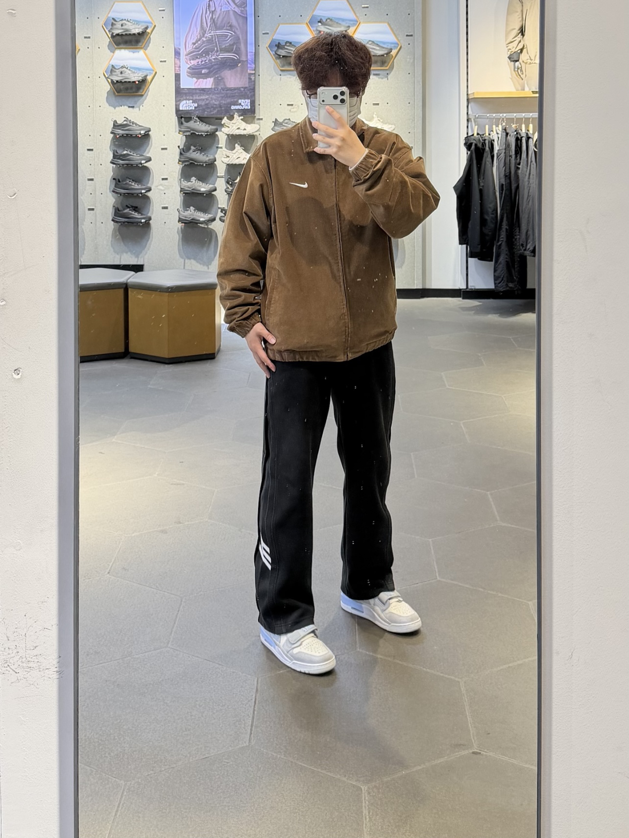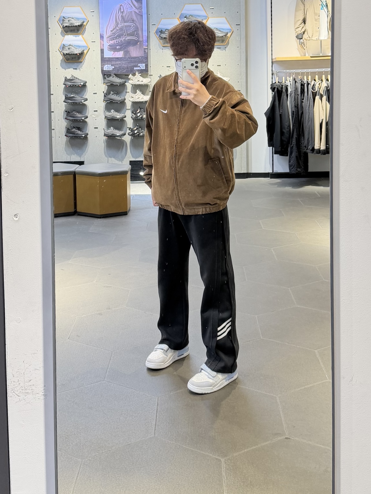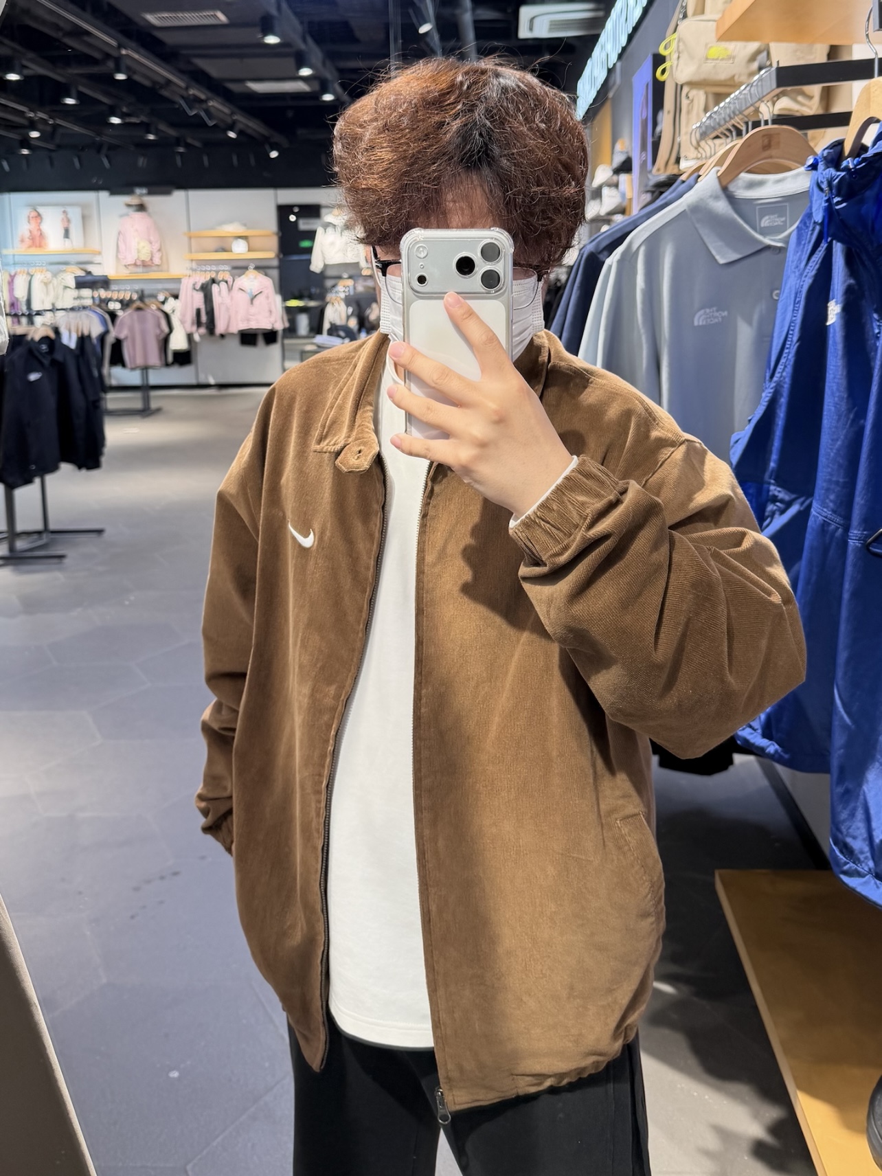 Nike这件基础款棕色麂皮绒外套我的最爱 宽松版型➕弹性收腰下摆 显瘦No.1 踏春出游绝对出片男女穿都酷酷帅✌️ 内搭白T即可黑色长裤加白灰运动鞋 170/130斤 👔 L 👖 M