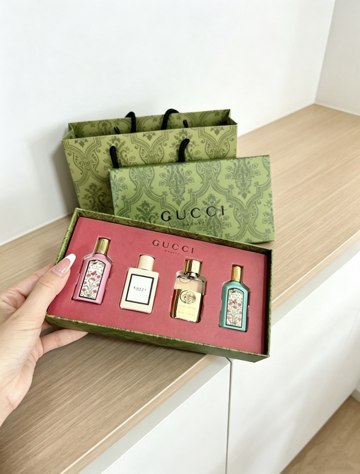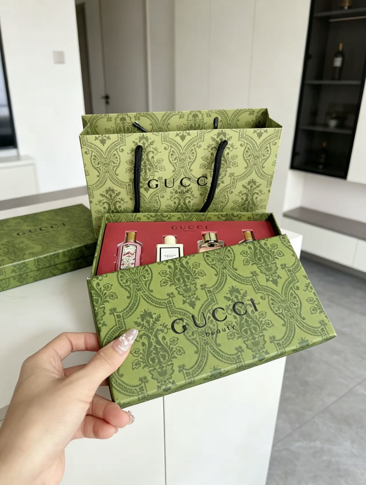 就系介个Gucci的香水小样礼盒✌🏻 打开是4支不同香型的香水 每个味道都好好闻 淡淡的花香比较适合日常喷 留香时间也不错 我觉得初春开学喷适好合适 经典永不过时 Gucci香水礼盒,一次集齐4款人气香 每一瓶都是质感与香气的双重暴击 自用彰显品味,送礼尽显心意 精致女孩的香水清单,把高级直接穿身上了