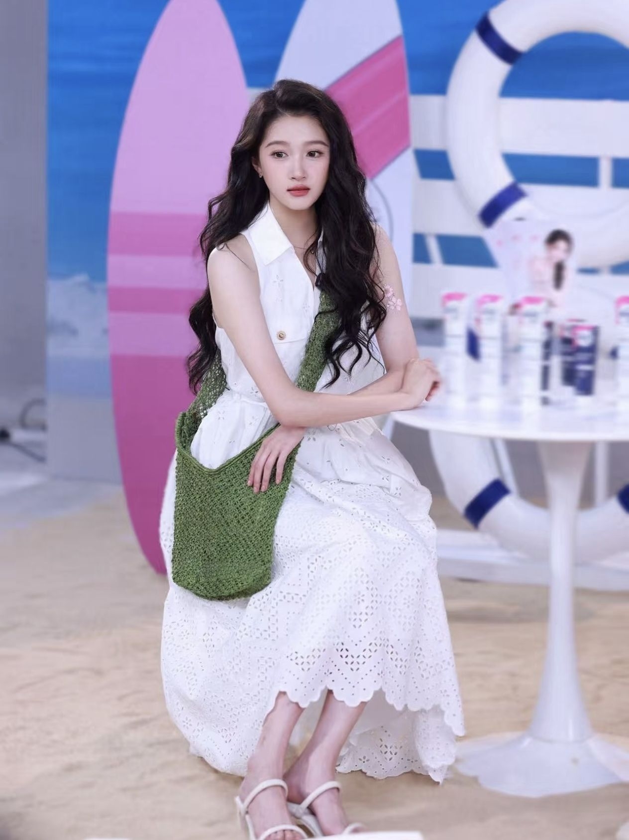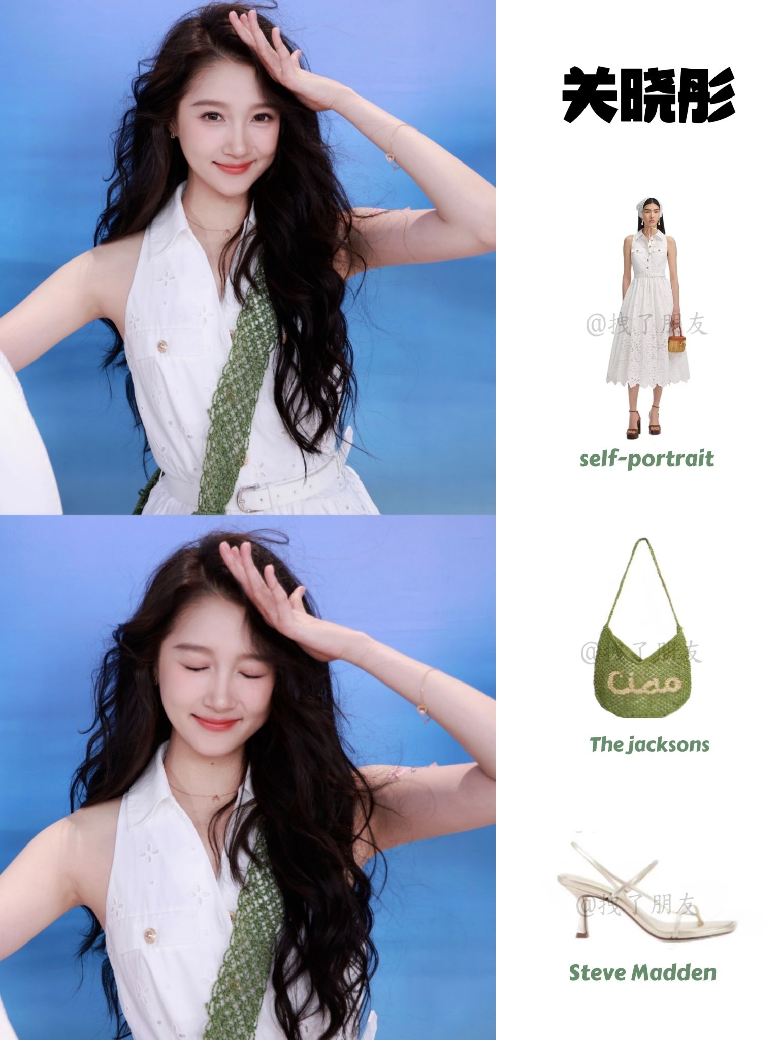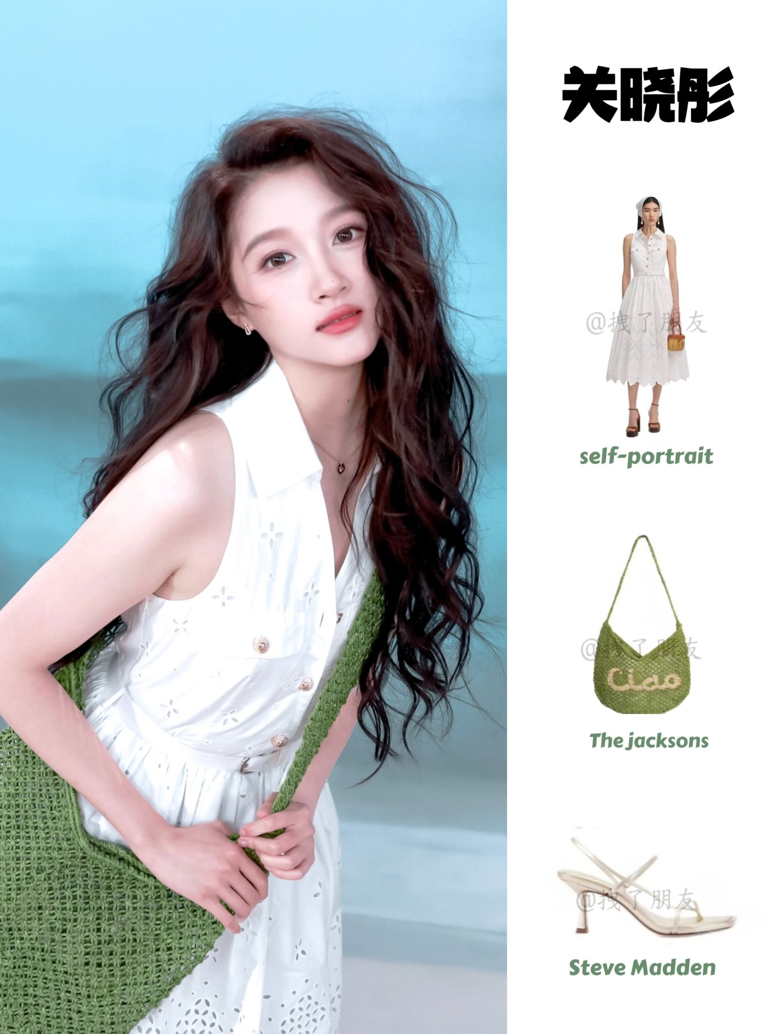 ⭐self-portrait白色镂空无袖连衣裙,清新又显气质 The jacksons草绿色编织包,自带海边度假氛围 Steve Madden细带凉鞋,清爽又显腿长 夏日氛围感直接拉满