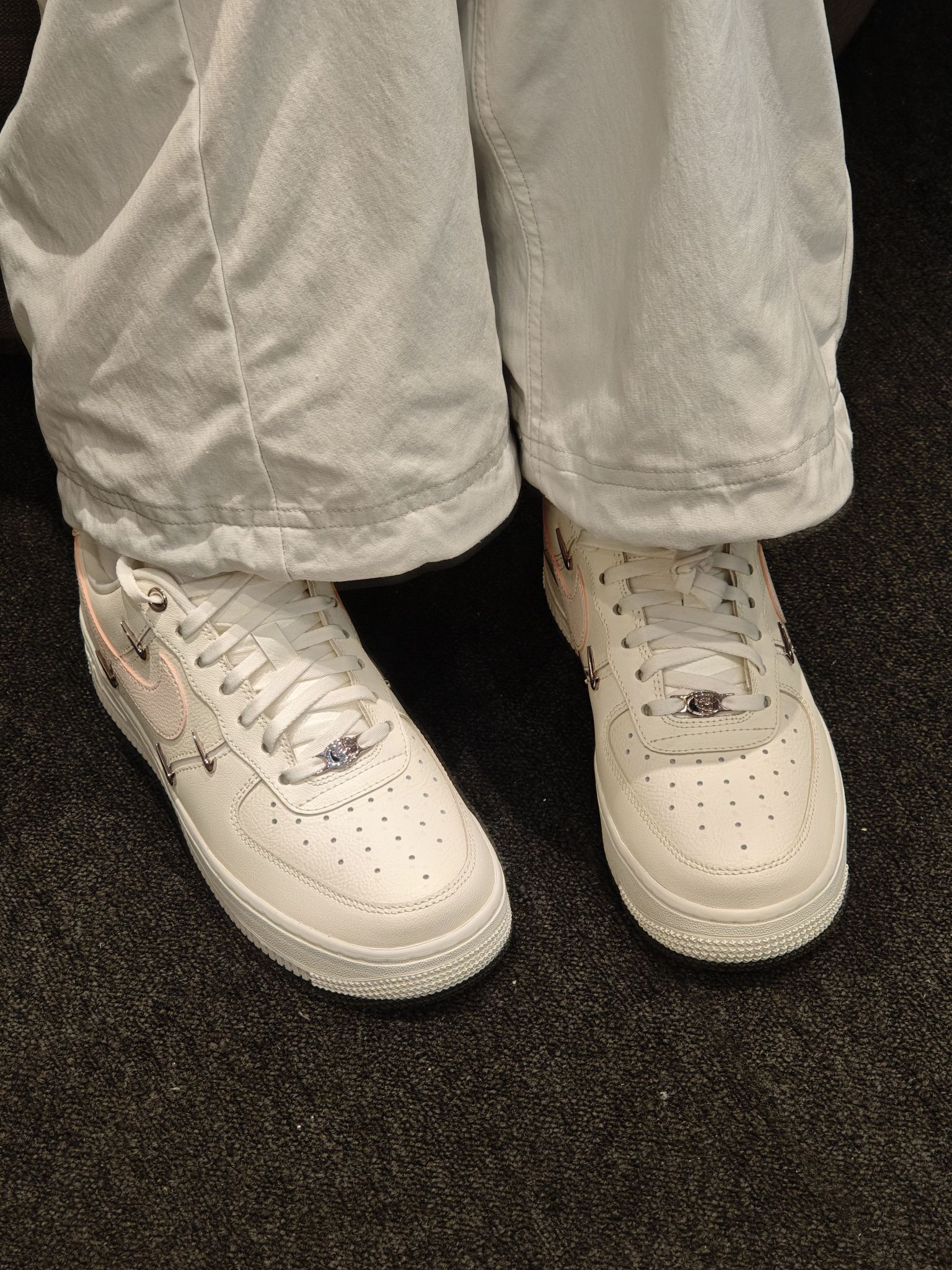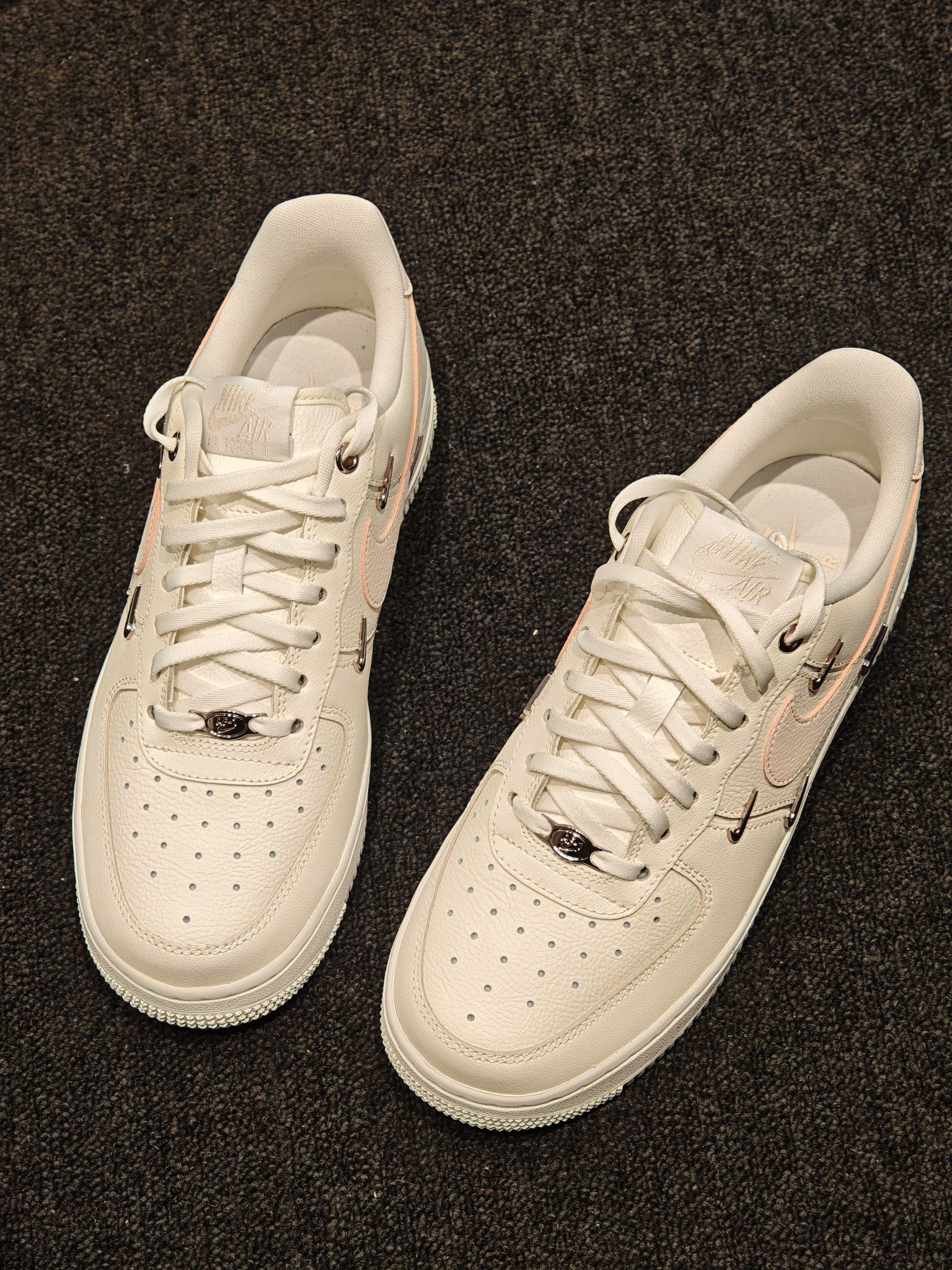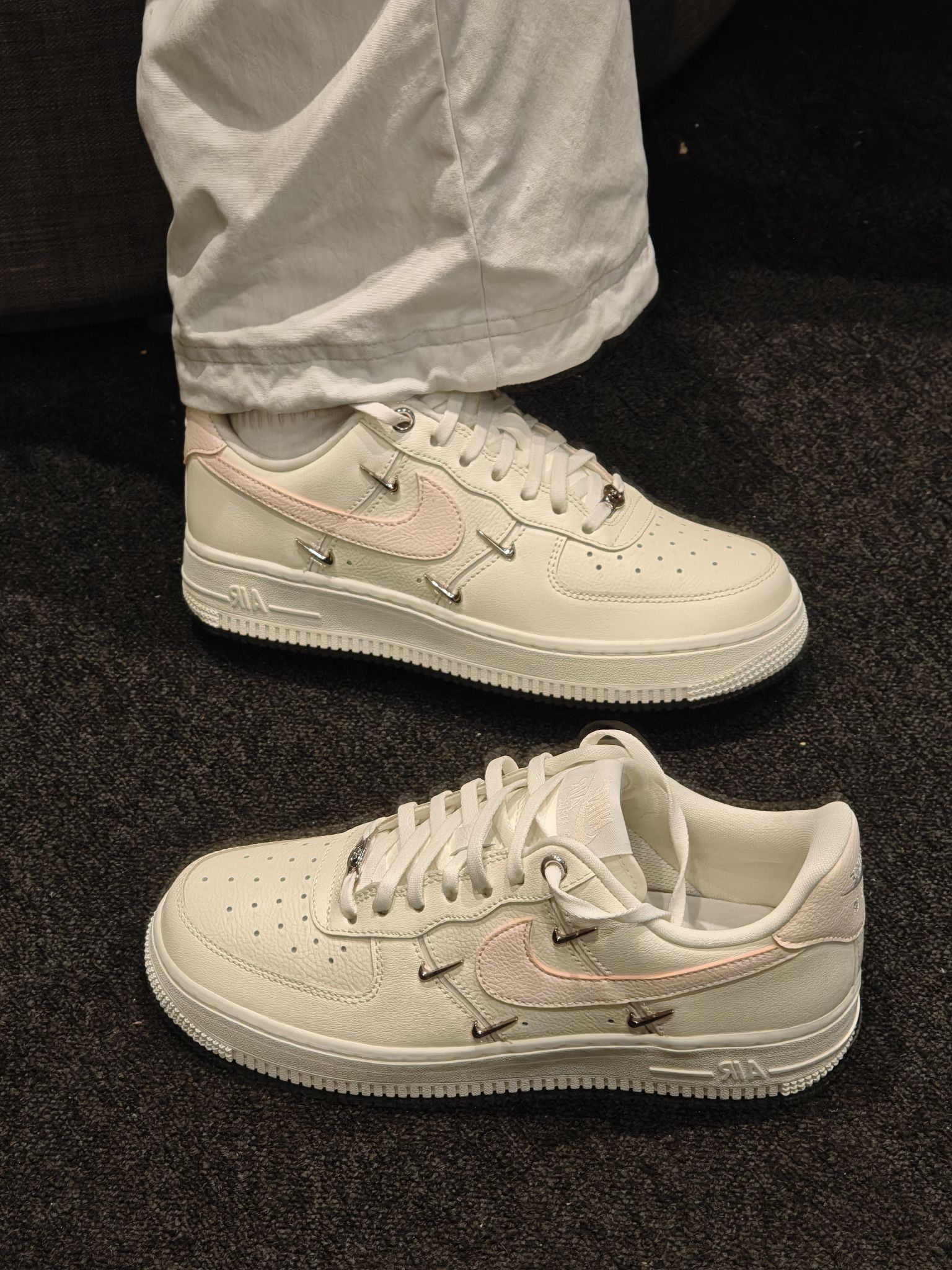 奶白底色像融化的香草冰淇淋,搭配淡粉Swoosh和玫瑰金四小钩,温柔又显贵,完全不挑皮不挑穿搭! 金属四钩细节拉满,自带细闪,阳光下巨显精致
