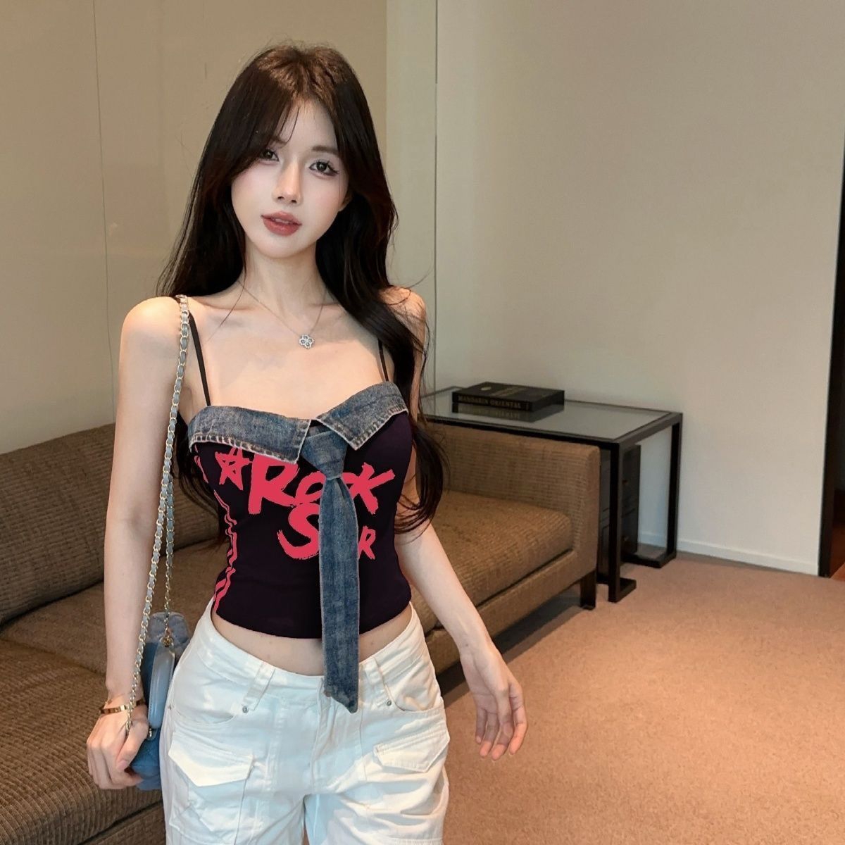 美式牛仔红色吊带背心女外穿夏泰式辣妹一字肩抹胸小上衣独特绝美
