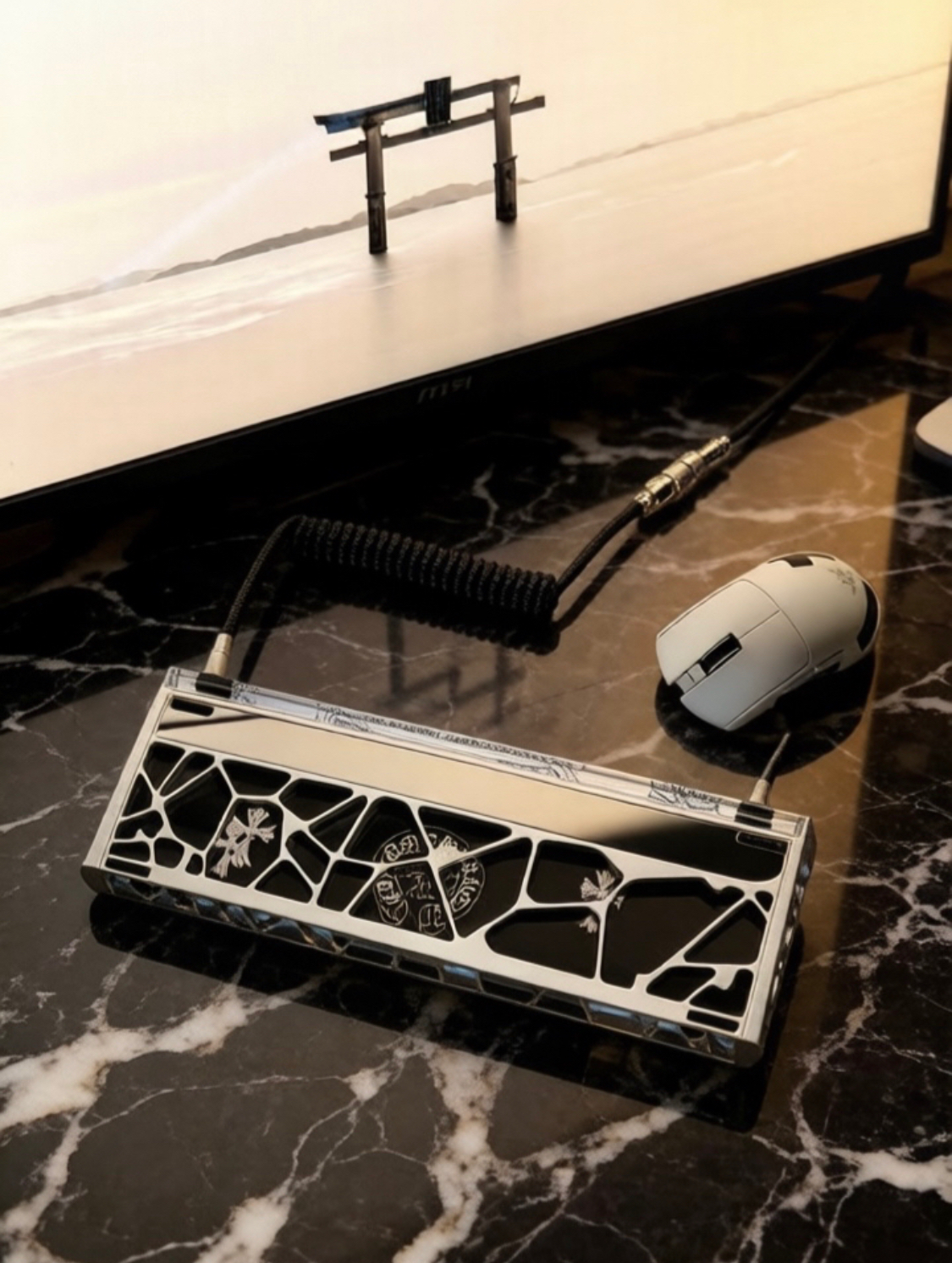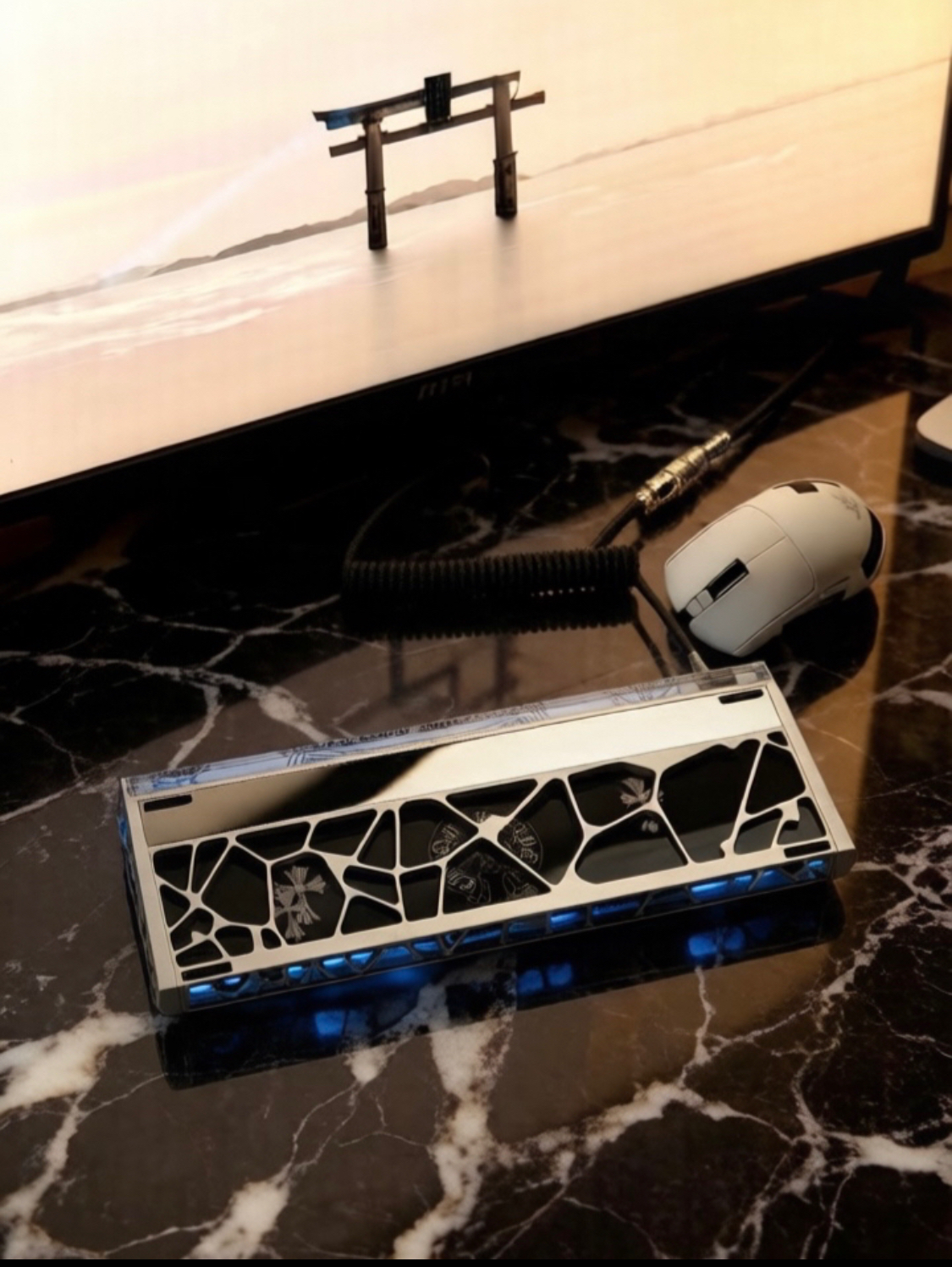 今天和大家分享一下我的键盘⌨️ 质感拉满的一套镂空小蜜蜂made68ulyra➕满改,白水晶果冻双拼透明爱心键帽,搭配透明灯罩,灯光效果非常透亮,背面则是黑色克罗心背板做个撞色效果,银色外壳的质感更是拉高了整体的视觉效果