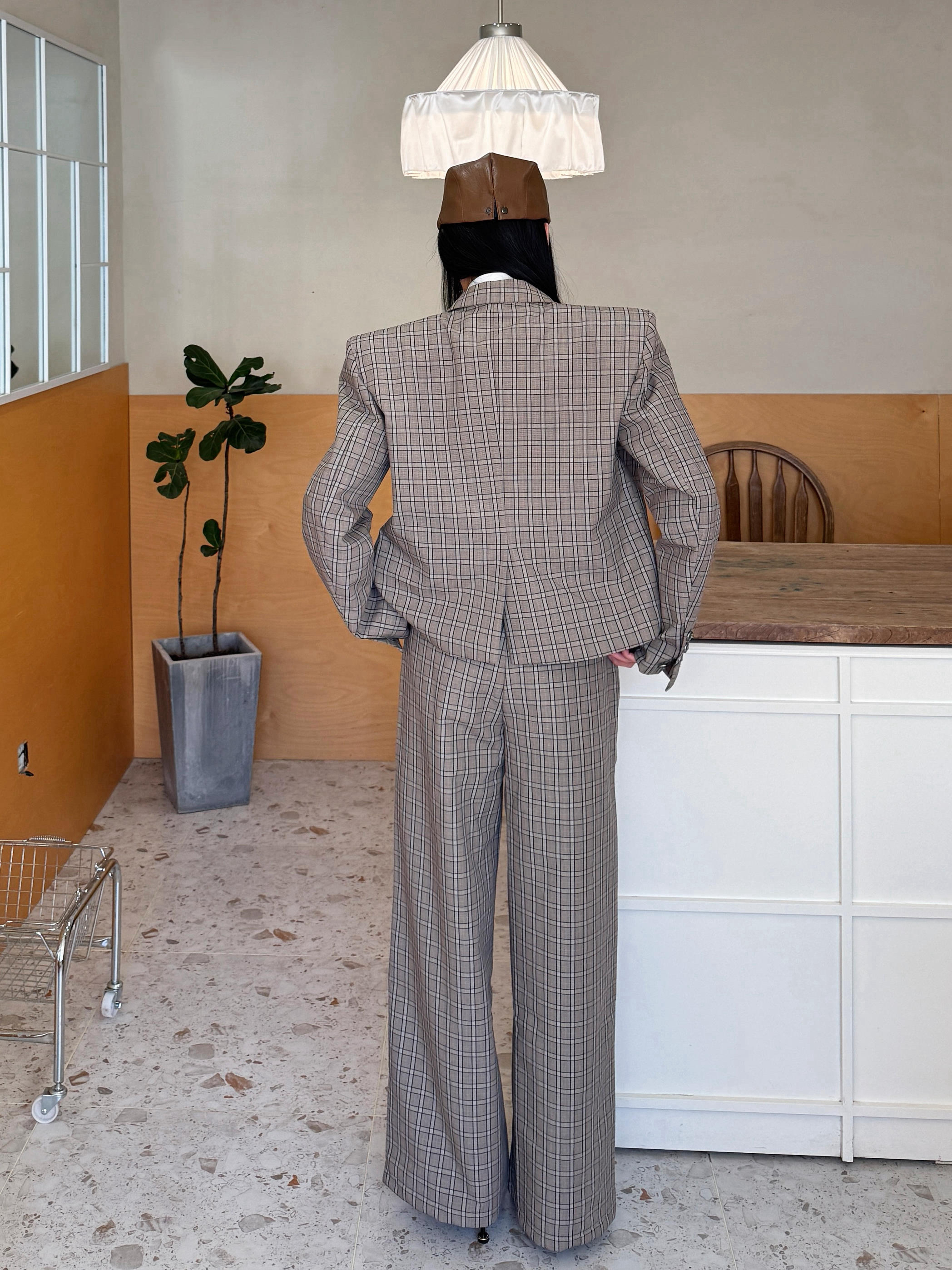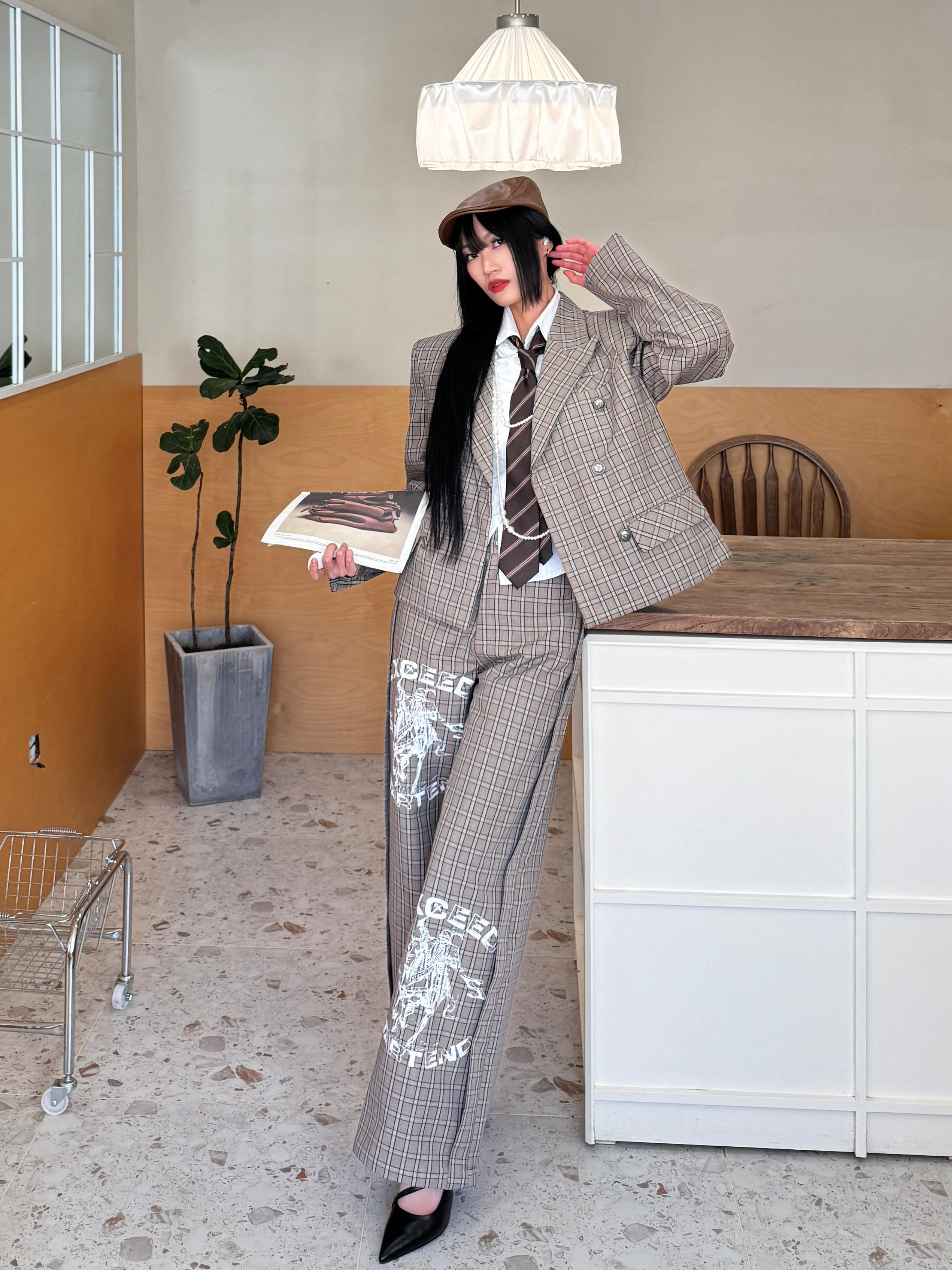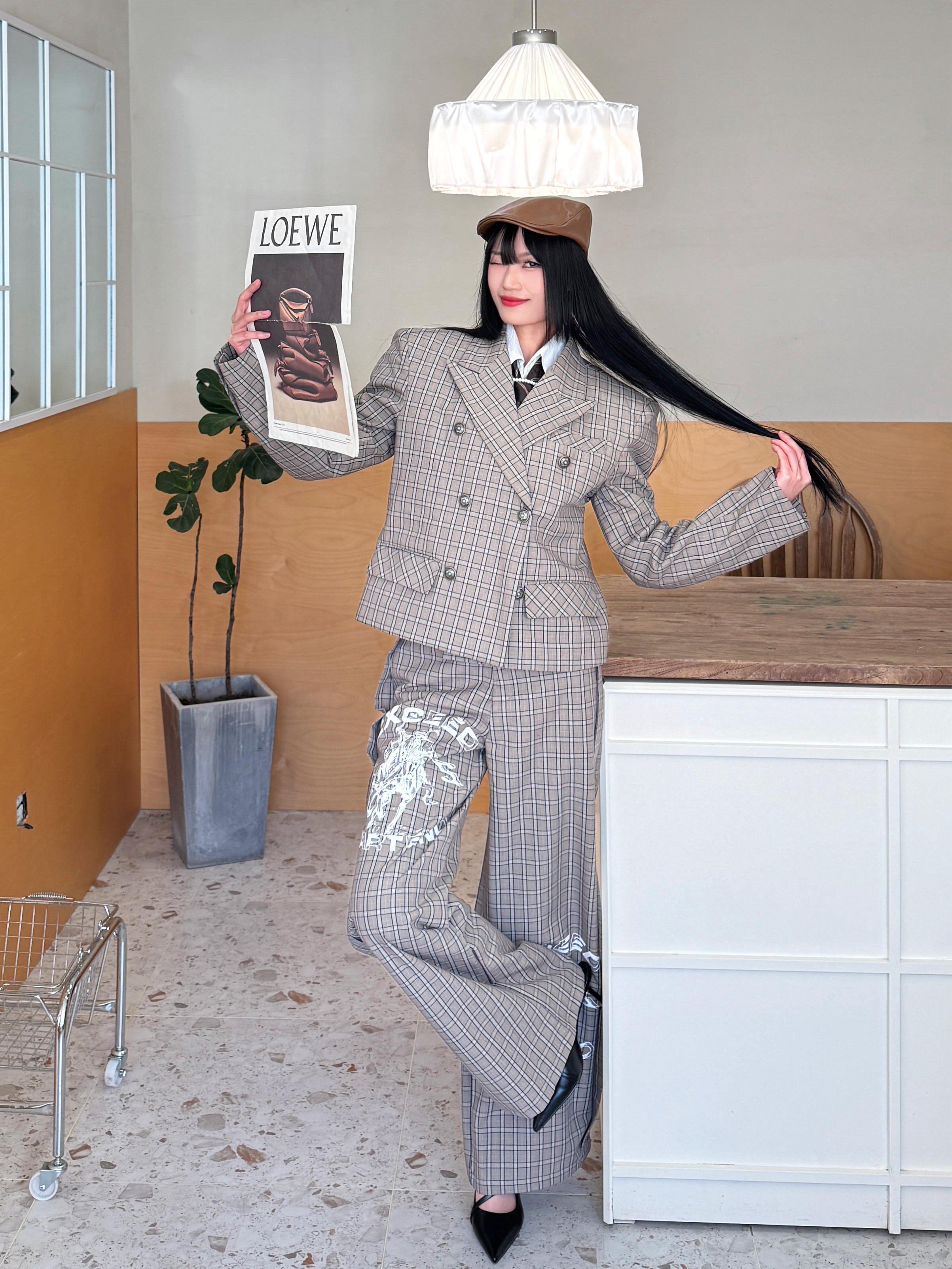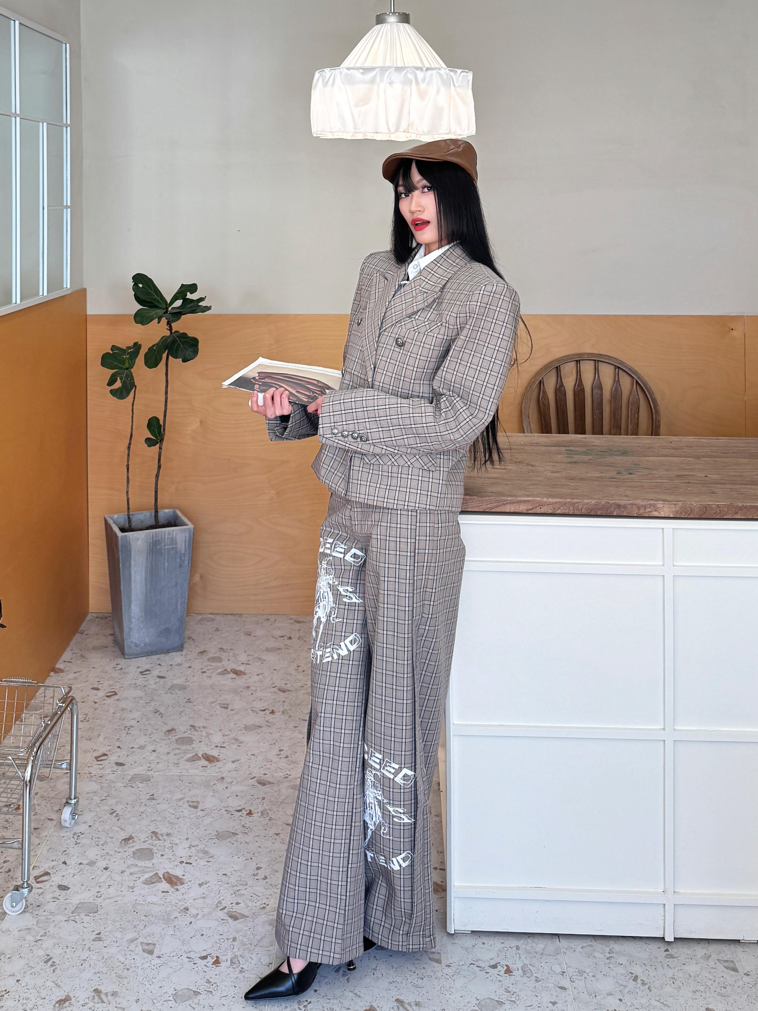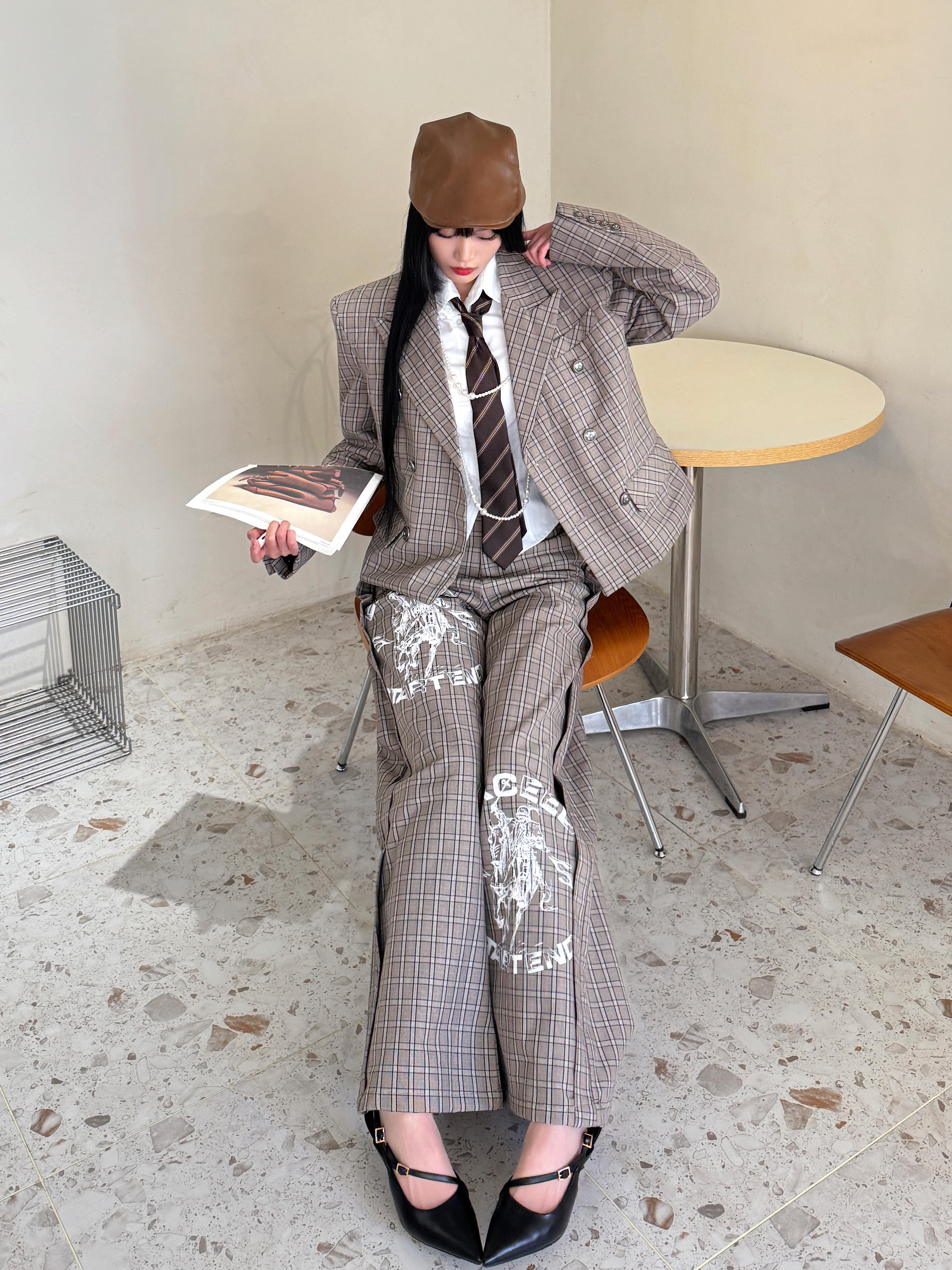 今日穿搭尝试了offduty超模下班风,解锁了拽姐人设,谁说只有男生可以穿西装,女生穿起来照样又酷又野!今日份的叛逆格纹西装ootd来啦~ 今日份穿搭分享: 咖色前进帽➕ START EXCEED END格子西装套装➕黑色尖头跟鞋=叛逆学院风穿搭ootd。
