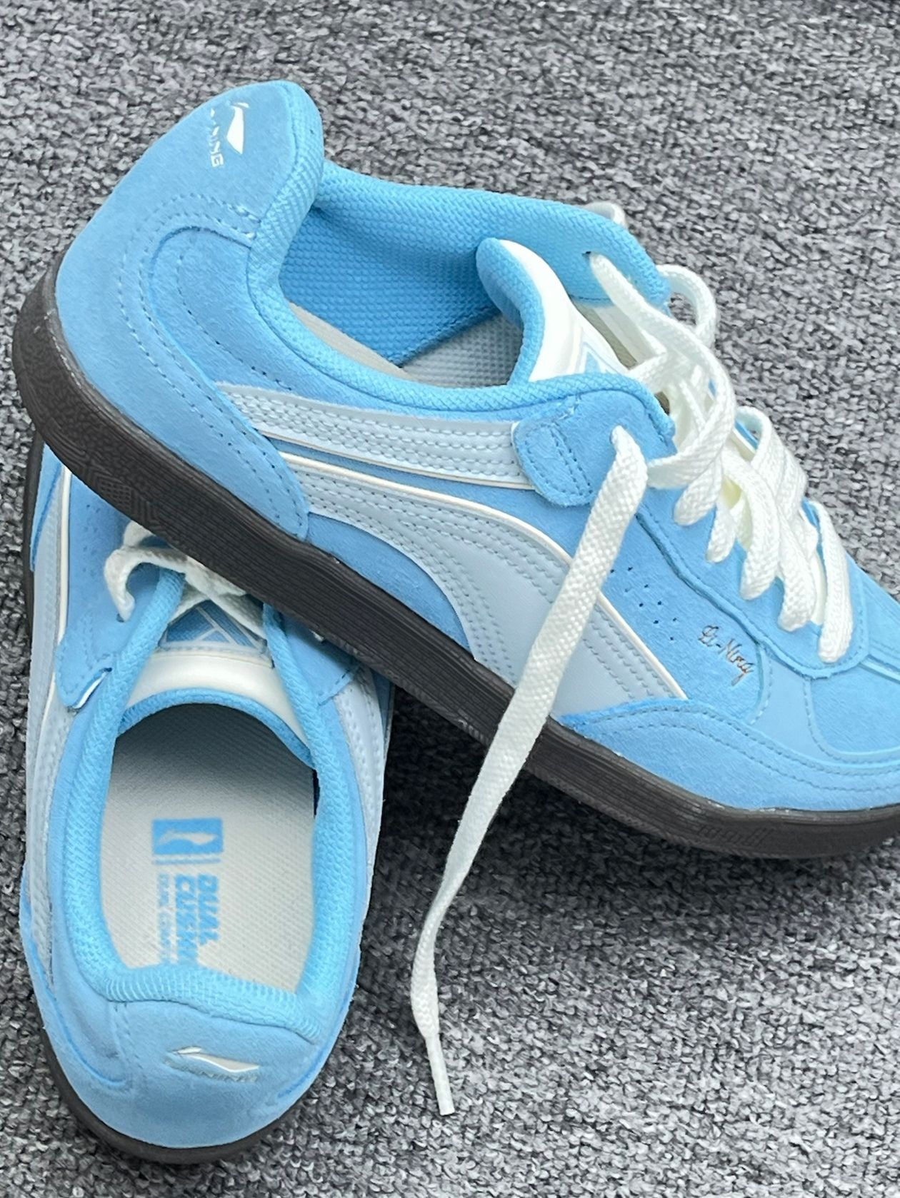 实物颜色比图片更温柔,奶fufu的浅蓝配米白鞋带,完全不挑穿搭,牛仔裤、运动裤、小裙子都能搭,出门随便穿都很显干净。 上脚脚感很惊喜,鞋型偏瘦,对宽脚姐妹不算太友好,但正常脚型穿包裹感刚刚好,走路久了也不会累,生胶底抓地力不错,日常通勤、逛街都很稳。