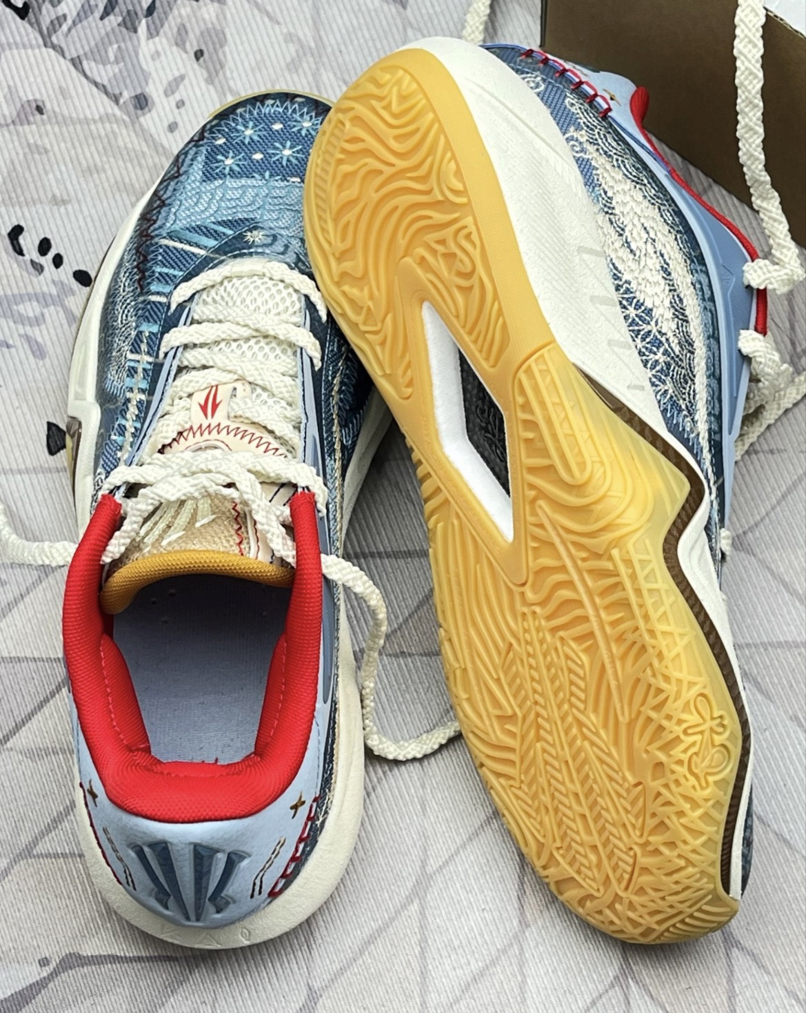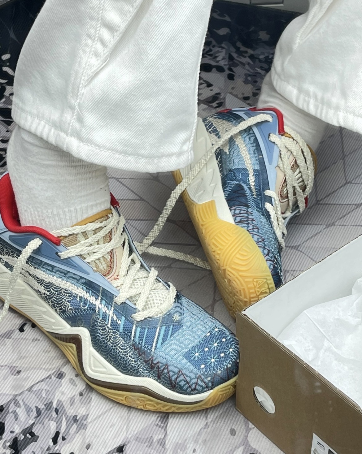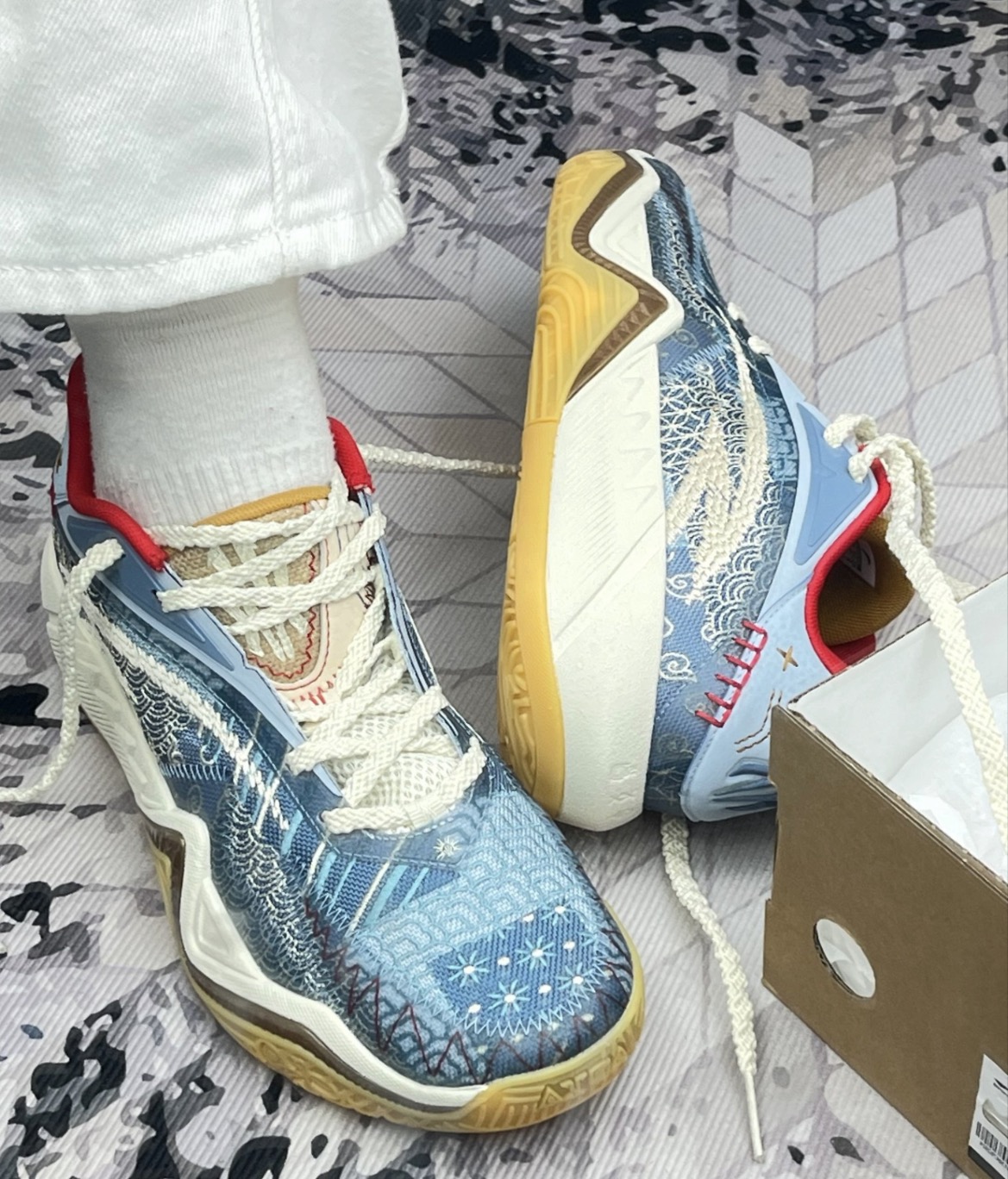 这双鞋颜值是真戳我,蓝白编织+国风纹样,上脚回头率不低,日常搭牛仔裤也不违和🤙 实战穿了几次,缓震够用,启动不拖沓,抓地力在室内场表现还行,急停不打滑。 但缺点也很明显:鞋面包裹偏松,变向时脚会在里面晃,得系紧鞋带才稳;生胶底沾灰就滑,室外灰多的场得频繁擦;鞋头有点挤,宽脚穿久了前掌会酸,磨小脚趾;透气性一般,打一小时脚就闷得慌,夏天穿更明显😮💨 整体是颜值大于实战的款,适合日常出街、偶尔打打养...