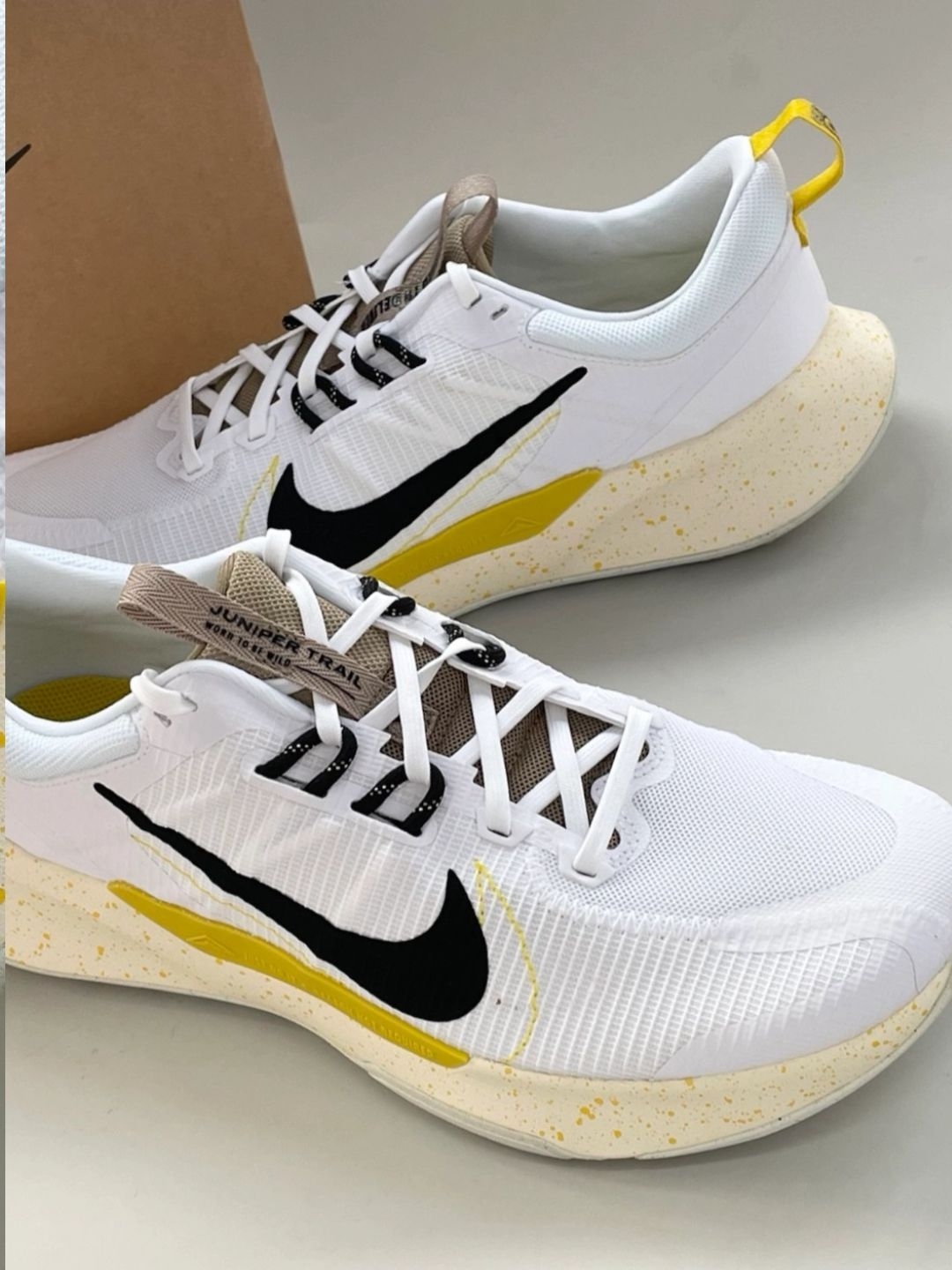 周末和朋友去郊外步道暴走,脚上这双Nike Juniper Trail 2 Next Nature跑步鞋太靠谱了😎!白黄配色超戳我——白色为主调,鞋侧黑Swoosh,硫黄细节点缀,棕色鞋舌+泼墨中底,颜值在线~网面透气不闷脚,橡胶外底的凸起纹路在山路走超稳✅。搭深色工装裤或直筒牛仔裤都好看,日常也能穿。 小Tips:尺码正常不偏码,宽脚也合适;白色部分用橡皮擦清洁超方便🧼~