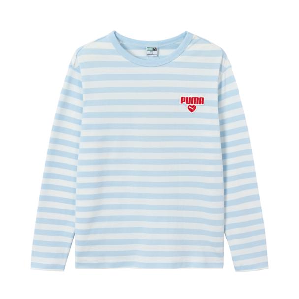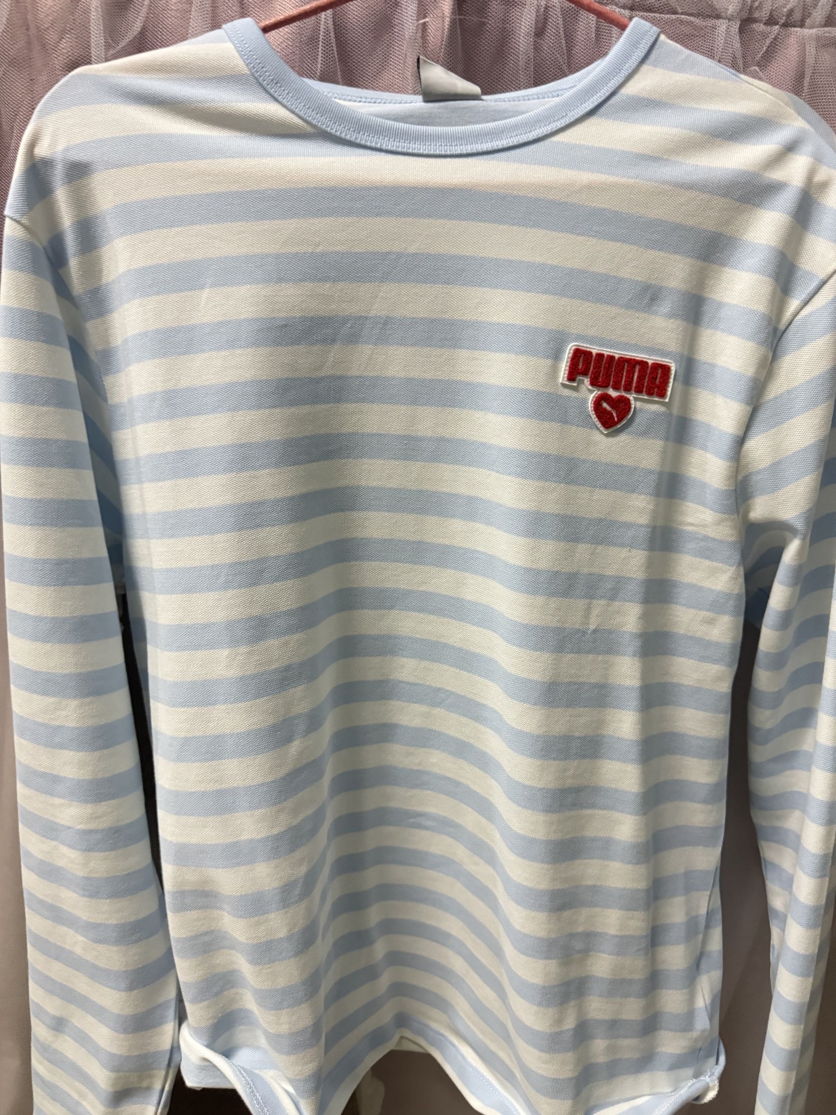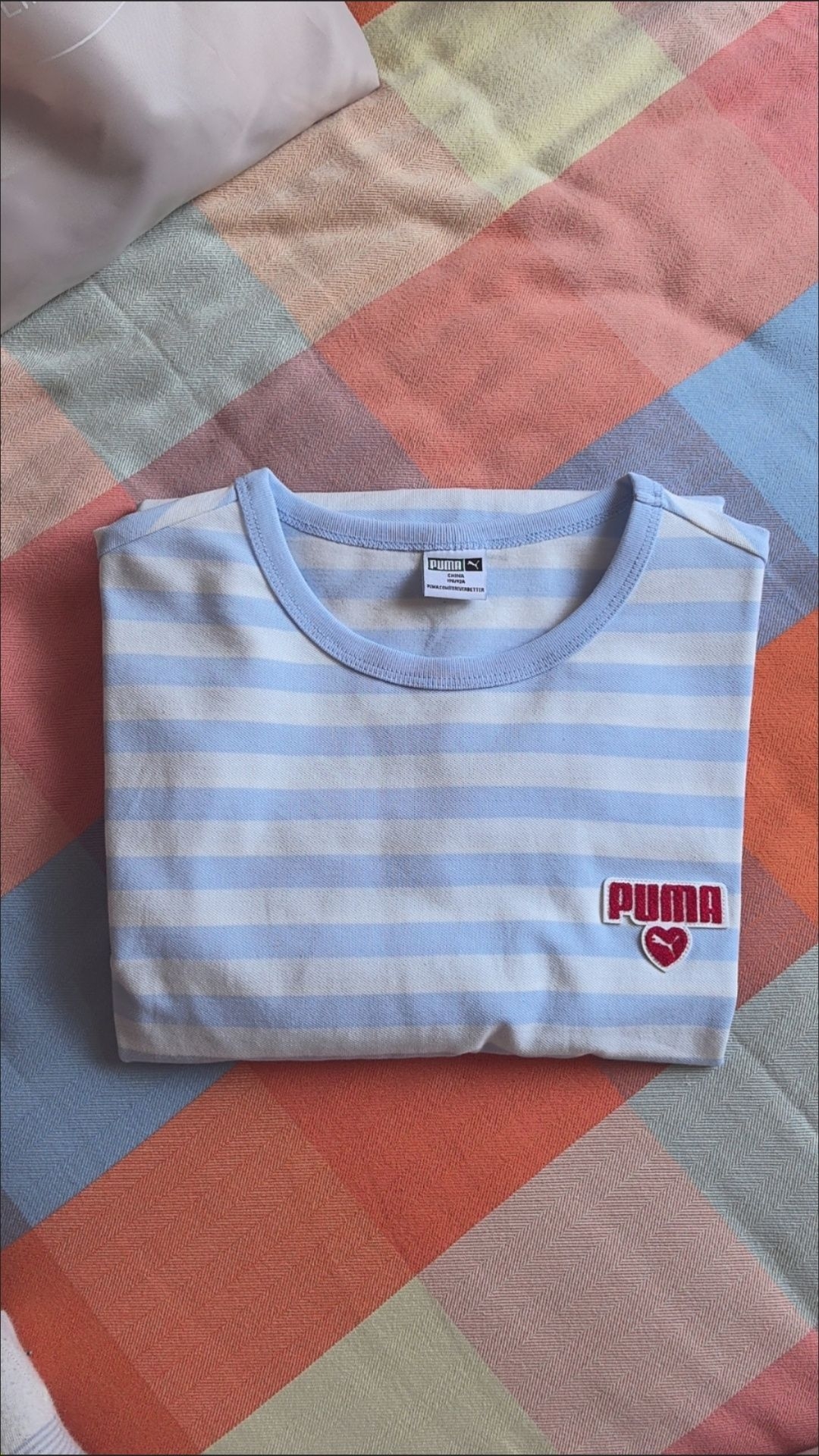 救命!PUMA这件条纹衫直接把我焊死在甜妹赛道了 浅蓝奶白撞色条纹,清新感直接拉满,左胸爱心标设计甜到犯规,颜值高到舍不得穿!宽松慵懒的版型,遮肉显瘦一绝,微胖姐妹也能轻松穿出松弛感! 面料软到像云朵一样,亲肤透气,春夏穿完全不闷汗,单穿、叠穿都超有氛围感!不管是搭配牛仔裤、半身裙还是运动裤,都能轻松拿捏美式复古风,日常、出游、通勤全场景适配! 一件搞定整个春夏的穿搭,甜妹、辣妹、学生党直接闭...