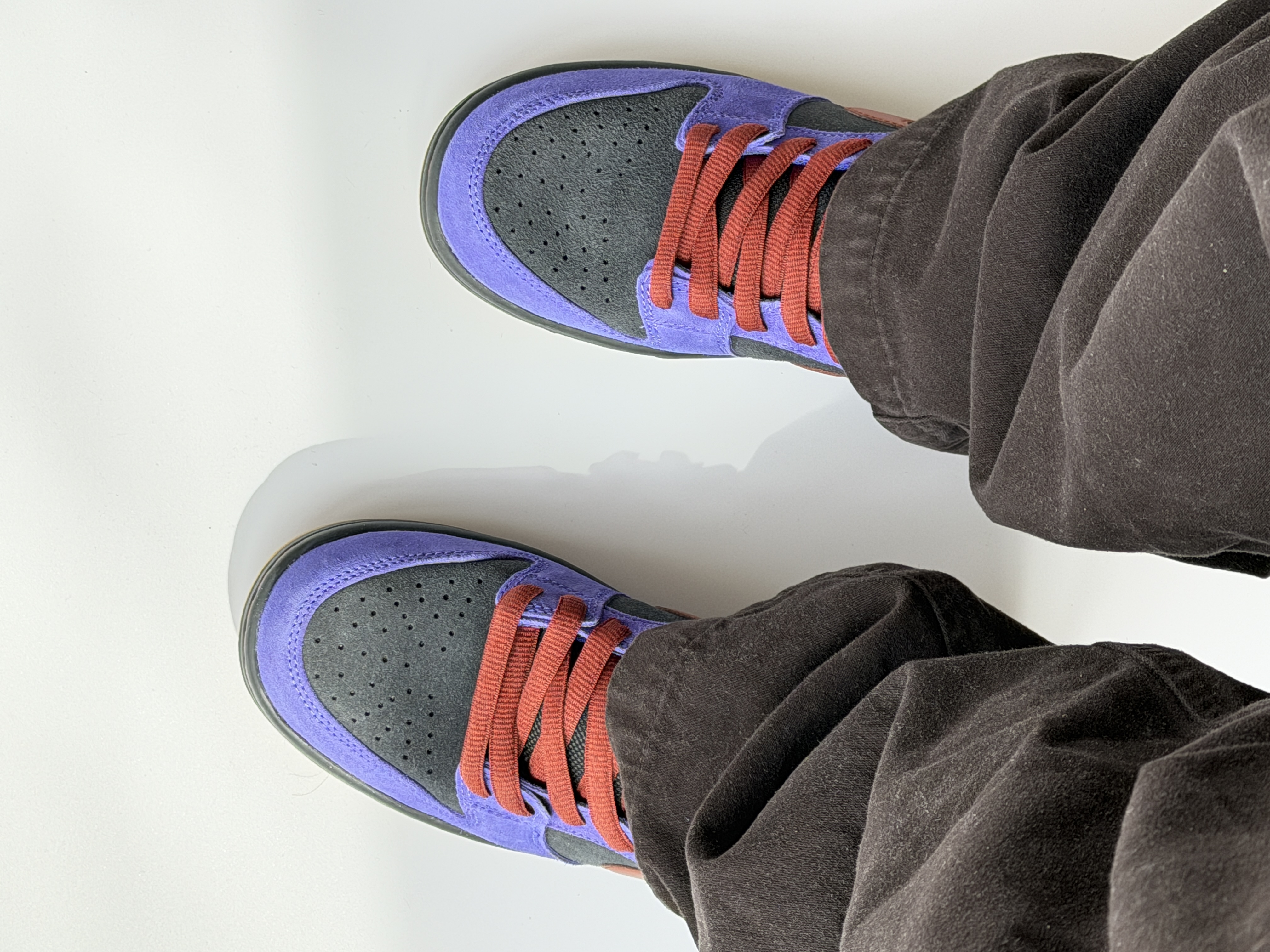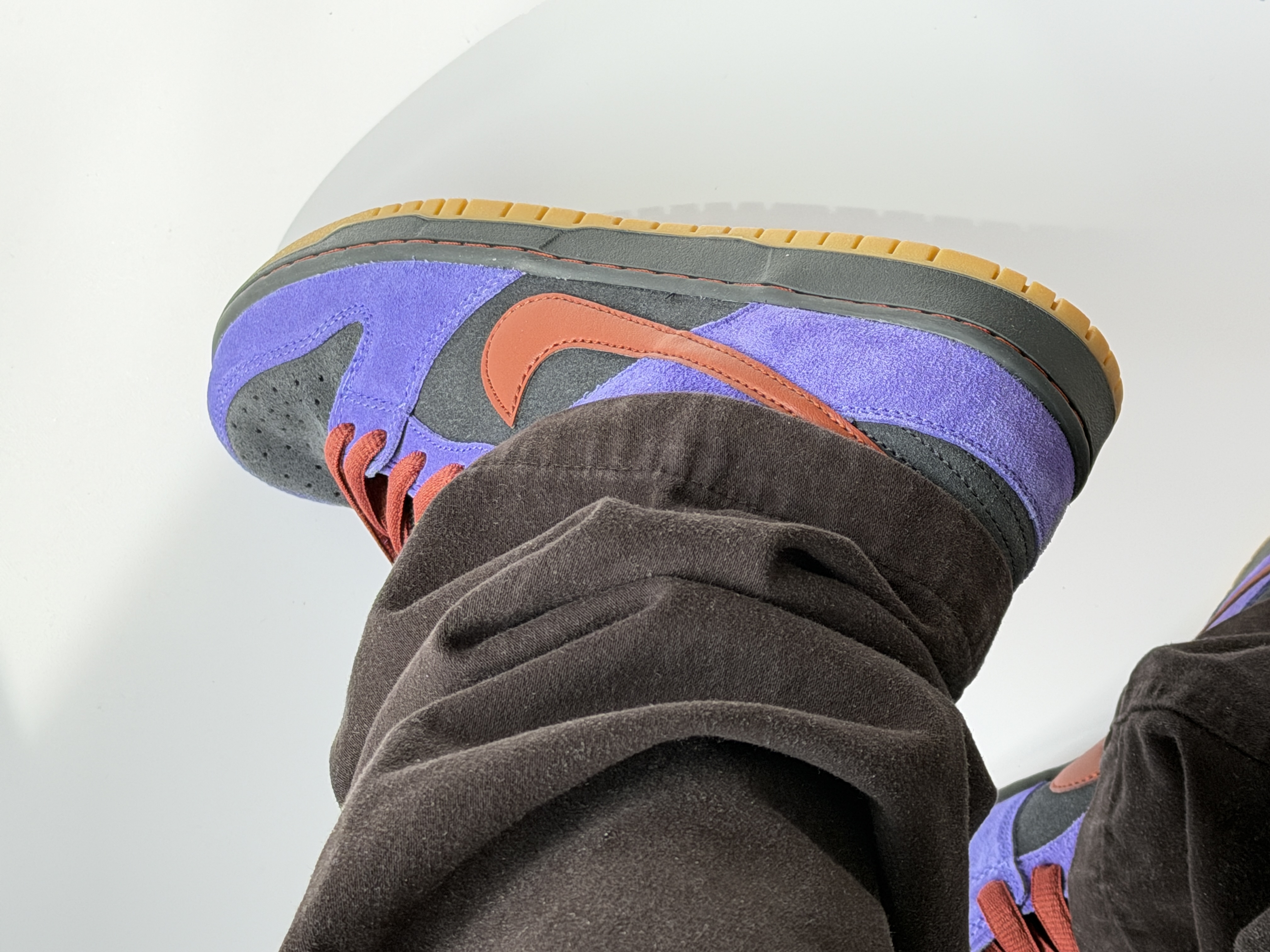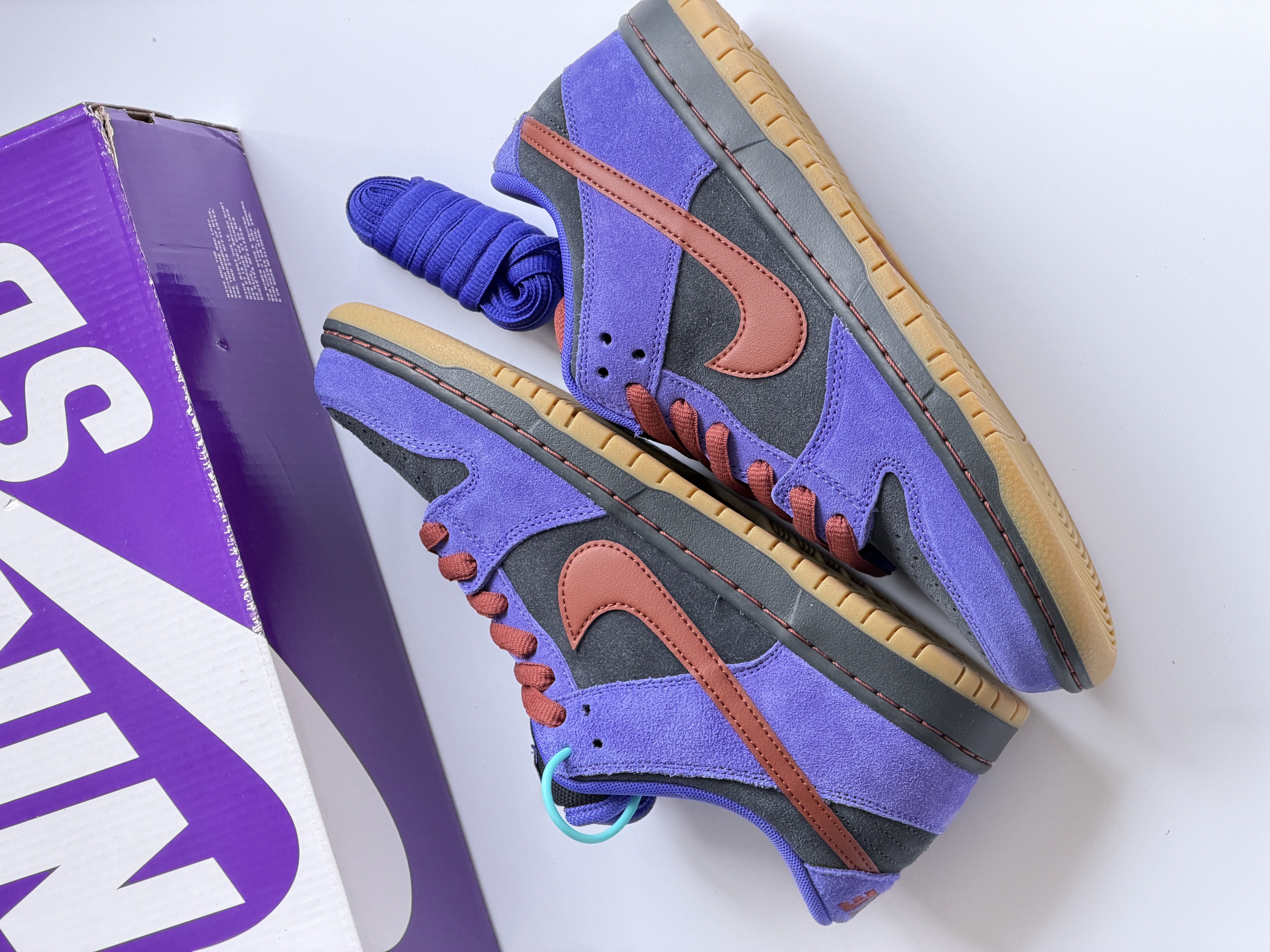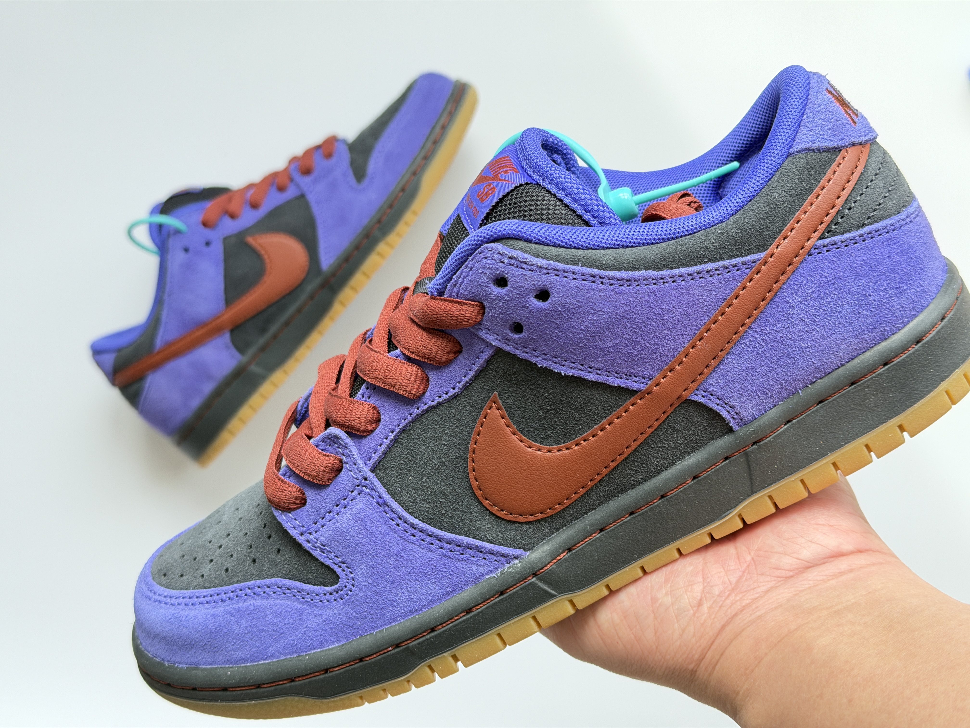 黑紫棕配色dunksb有着极其复古做旧配色!黑色部分应该算是炭黑色,而紫色也是稍微偏蓝一点点!搭配这棕色swoosh整体配色蛮协调的!四季都可穿也比较百搭最近蛮适合入手哦!