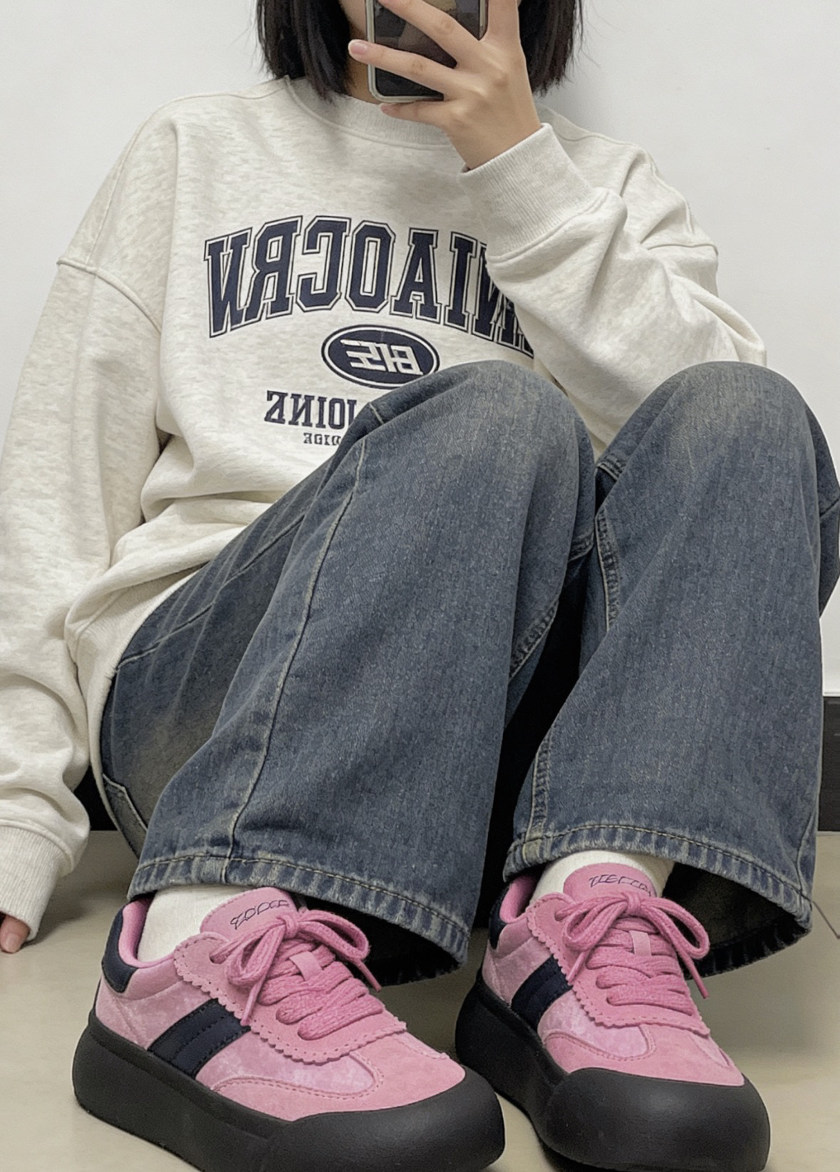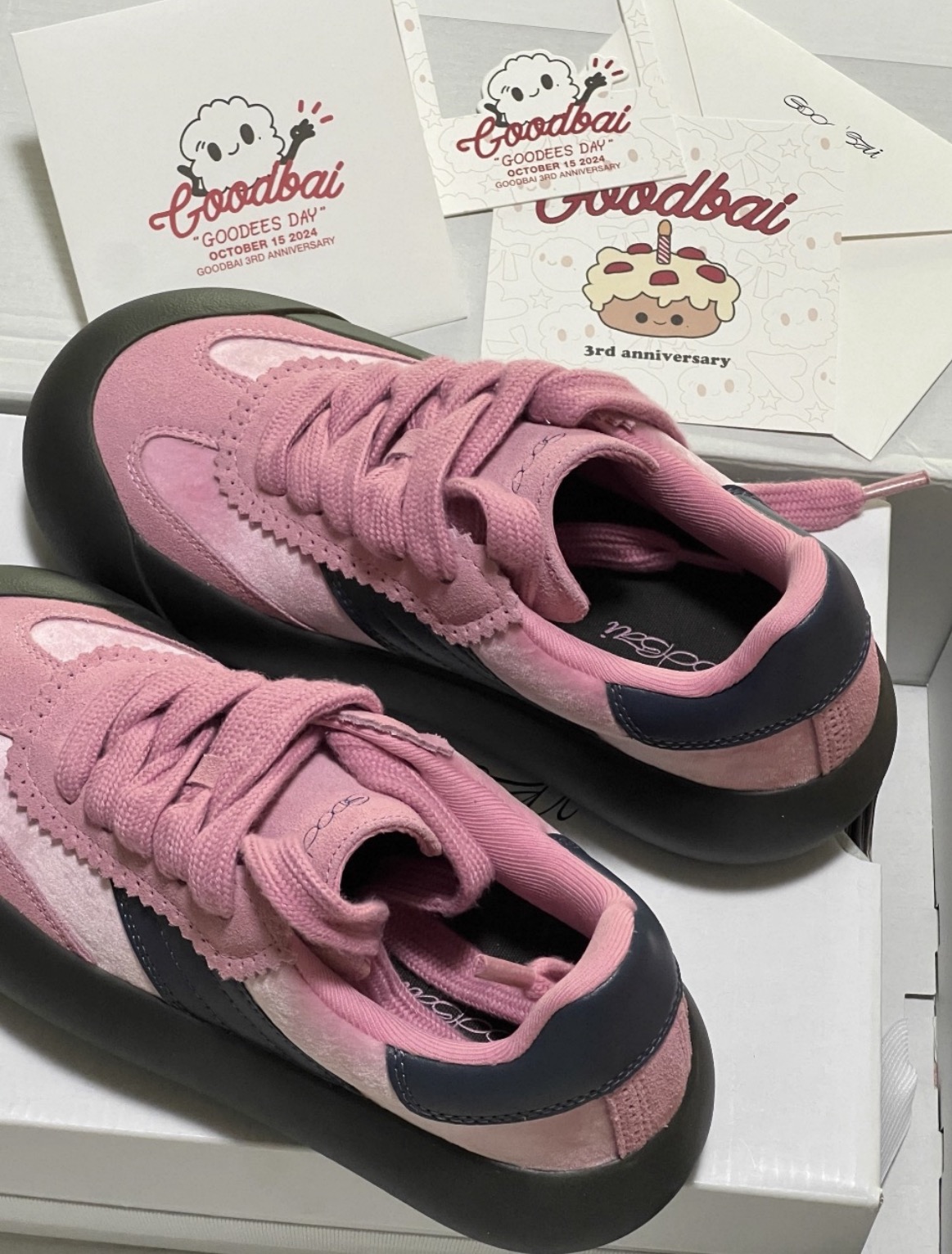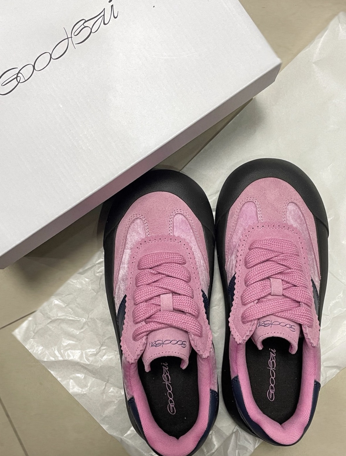 这双Goodbai粉黑德训鞋我真的爱惨了! 麂皮+丝绒的拼接质感拉满,黑粉撞色又甜又酷,厚底还能悄悄增高5cm,小个子姐妹闭眼冲! 搭牛仔阔腿裤真的绝了,随便一拍都是氛围感大片,谁穿谁是甜酷女孩!