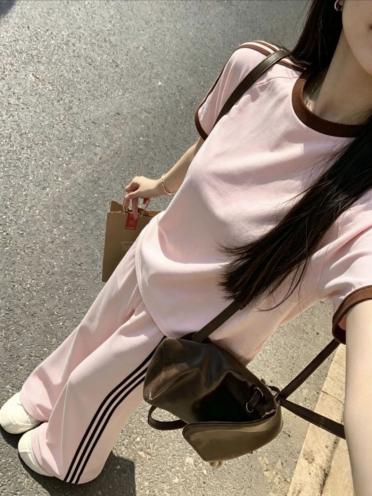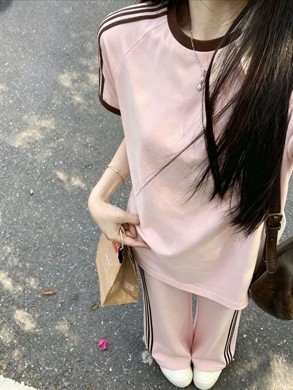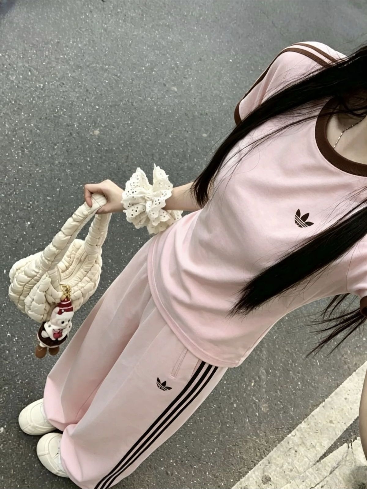 谁懂啊!这套粉色三叶草真的太戳甜妹了 浅粉+深棕的撞色完全不挑皮,黄皮姐妹也能放心 冲 同色系直筒裤垂感绝了,修饰腿型超显利落,不 贴腿不臃肿 插肩袖+三条杠经典设计,休闲感拉满还巨藏肉 日常出街、通勤上学都能穿,懒人一套就出门