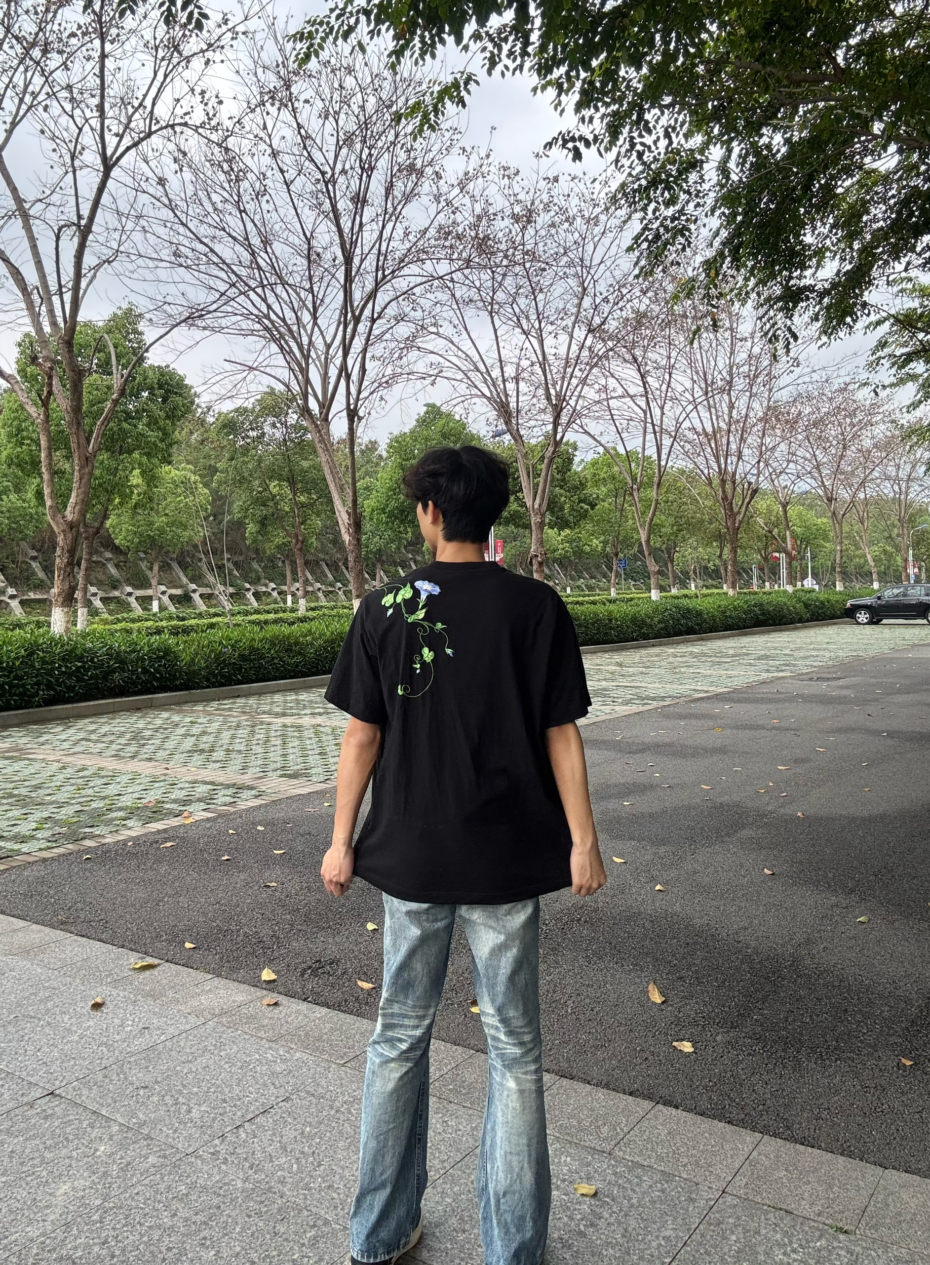谁懂啊!黑T+牛仔裤真的是高个子男生的穿搭神级公式✨ 这件黑T的牵牛花印花太戳我了,美式复古感拉满,宽松版型对高个子超友好,完全不卡裆不短款,日常穿巨舒服 做旧水洗牛仔裤直接把松弛感焊在身上,垂感绝了,完美修饰腿型,高个子穿直接腿长两米既视感 黑白板鞋一搭,整套就是不费力的少年感,上学、出街、约会都能穿,春夏穿搭直接抄作业!