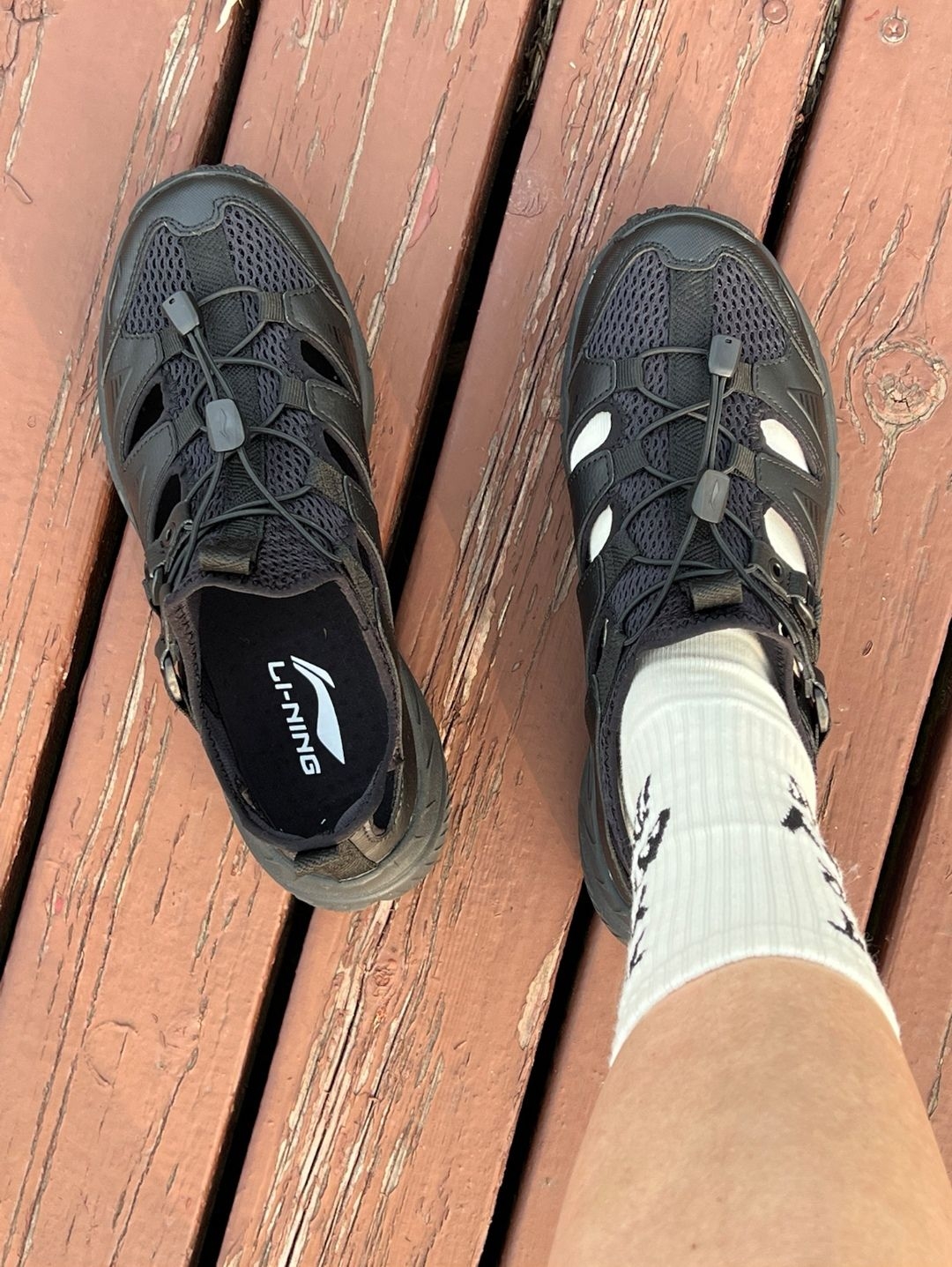 终于被我找到了这双水陆两穿的鞋了!~ #李宁 逐风V2 黑武士造型上脚就是帅气!网眼镂空+快速抽绳设计,夏天上脚清爽不闷脚,穿脱也方便, 玩水也能穿、日常通勤均可👍真的是一鞋搞定 中底采用全掌轻质发泡材料,脚感也不错软弹舒适,欠走不累脚 试了一下鞋子的抓地力也挺好,户外徒步,玩水都没问题👌