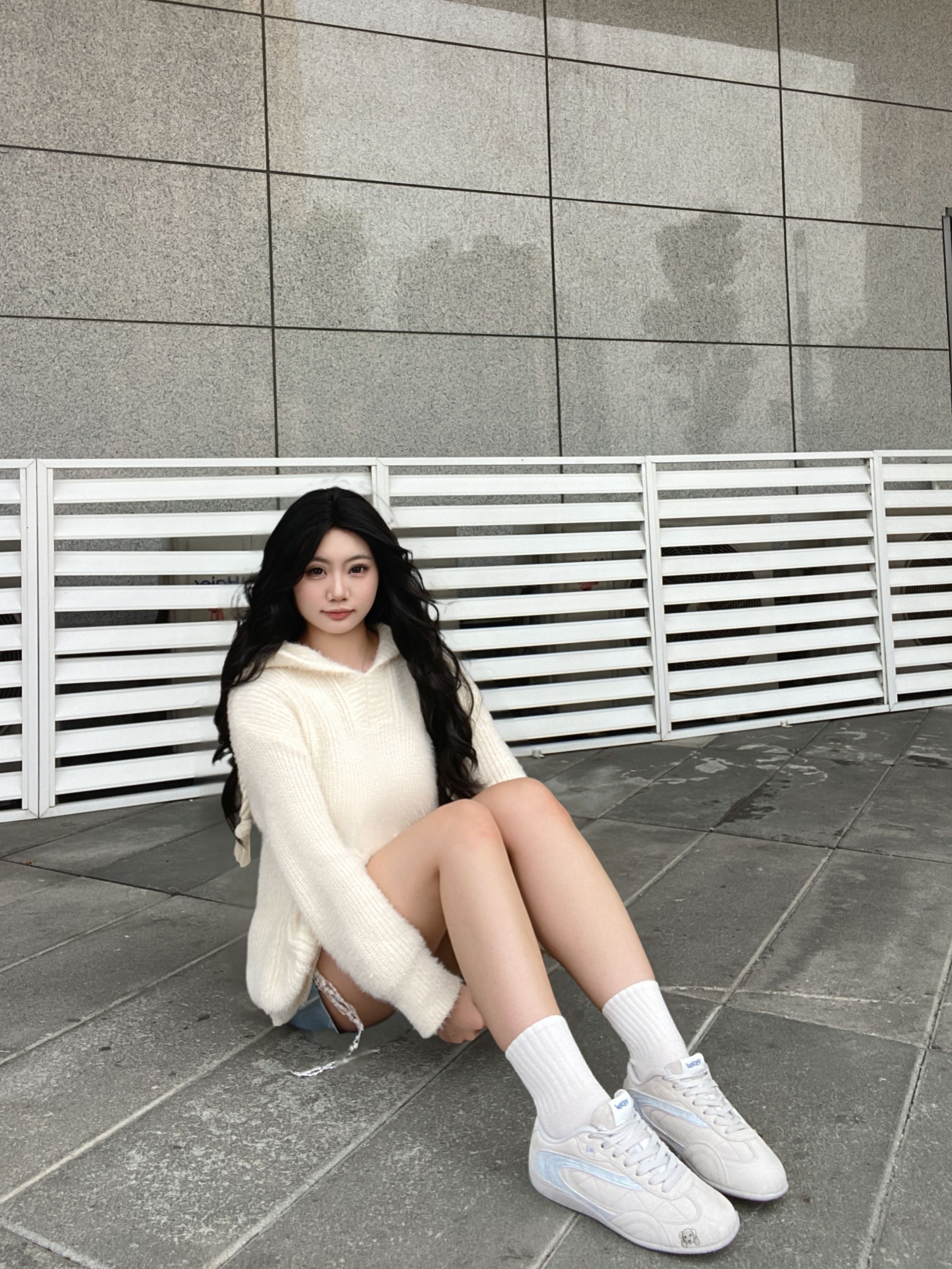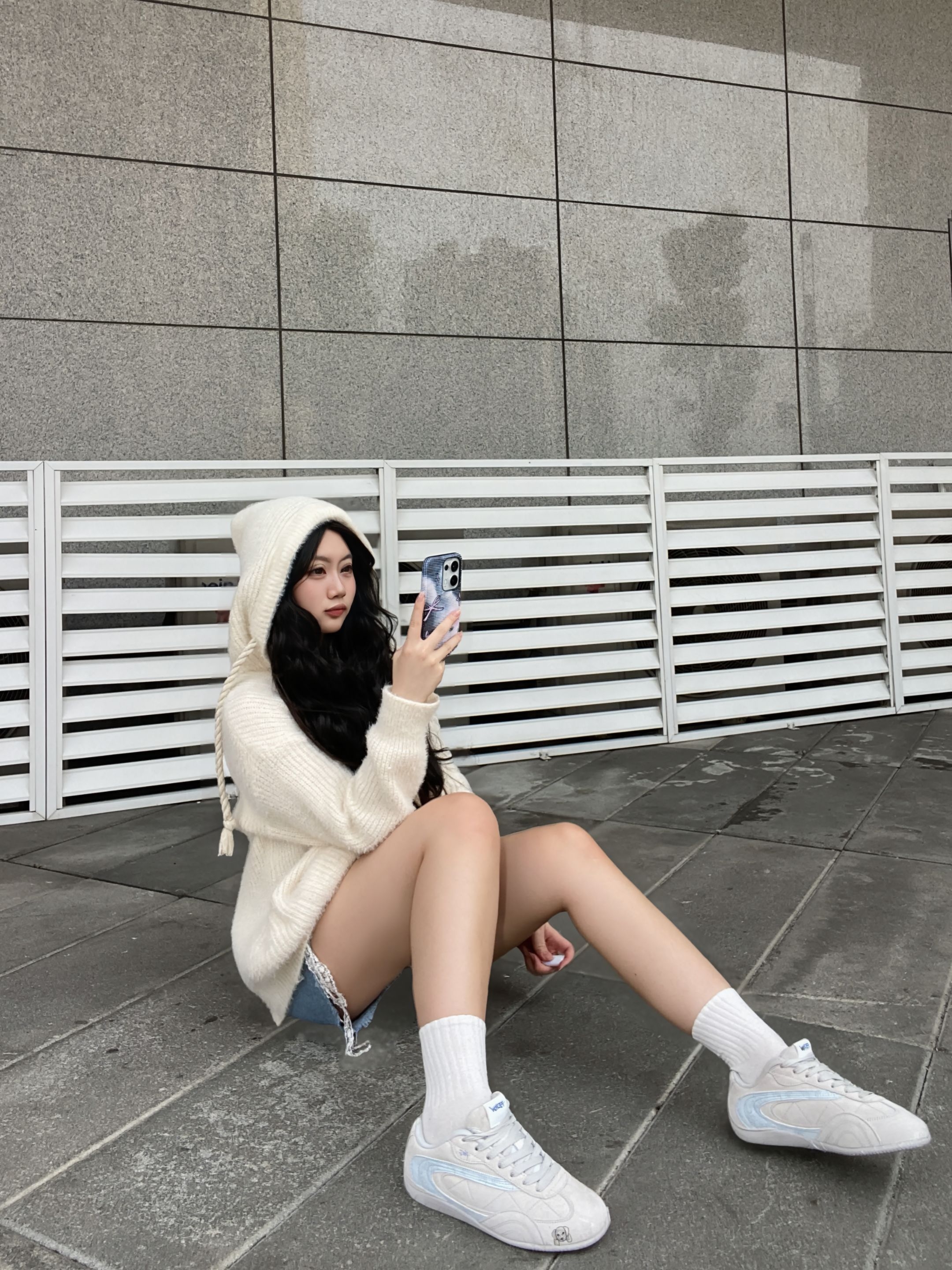软糯奶白连帽毛衣真的好温柔 奶fufu慵懒感拉满 搭配浅蓝牛仔短裤 甜酷平衡感绝了~ 小白鞋+白袜清爽减龄 韩系松弛感拿捏 温柔又显气质