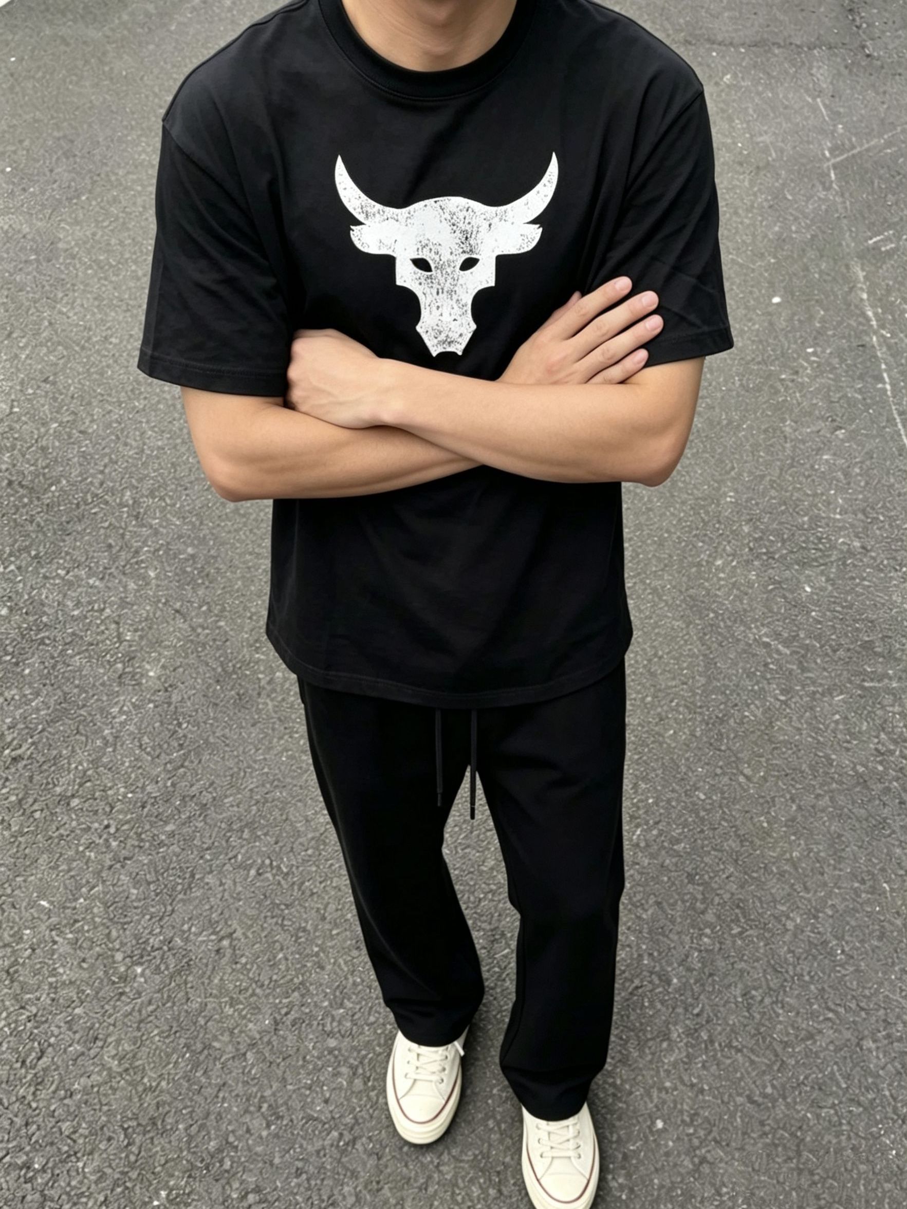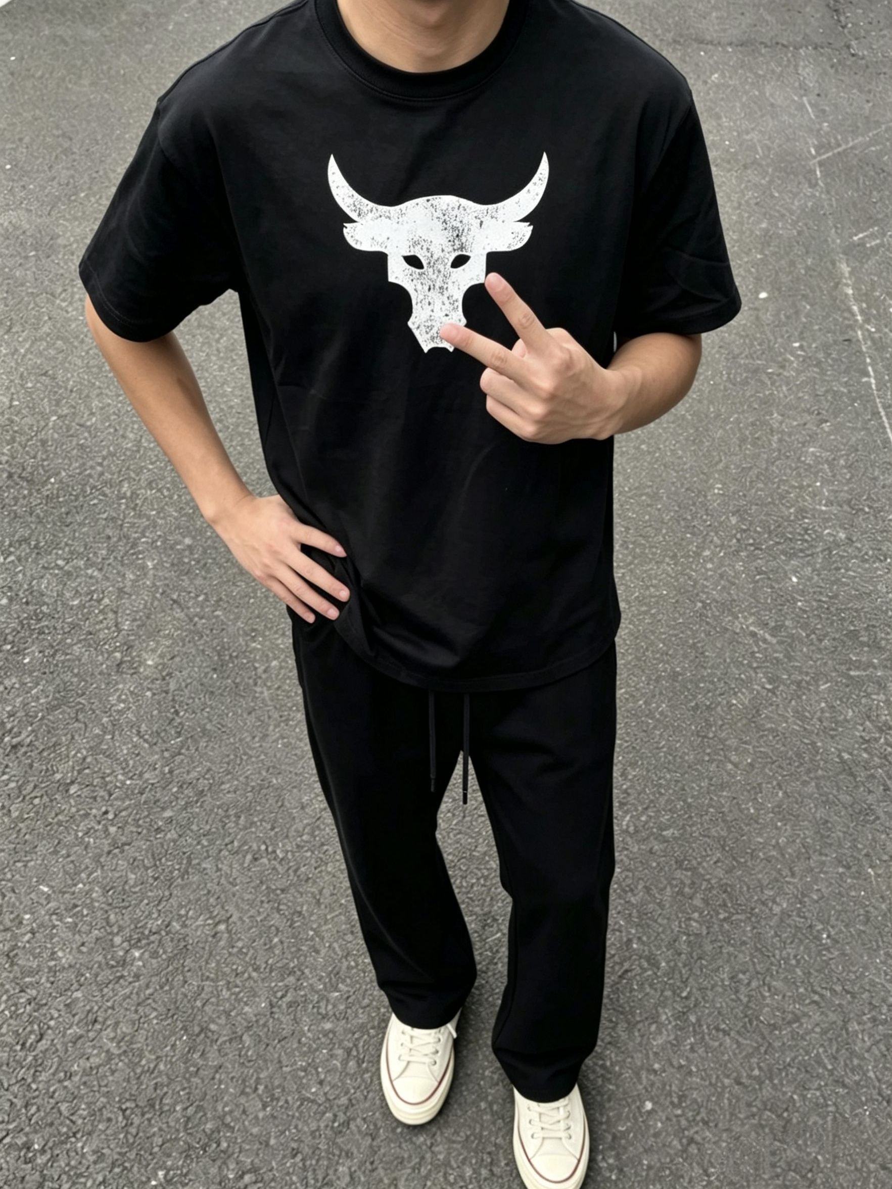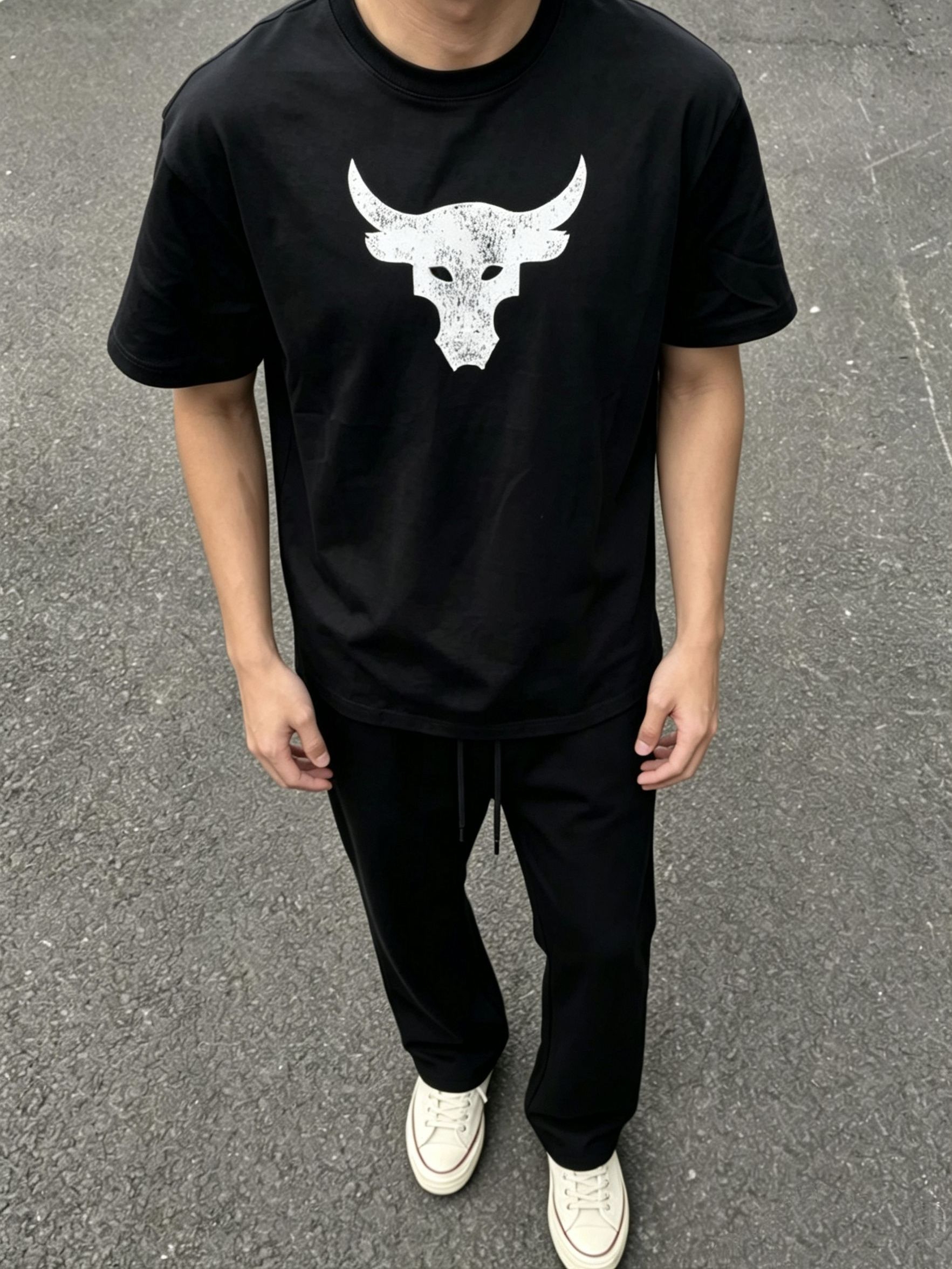 谁懂啊家人们!这套简约不简单的街头穿搭,直接把松弛感焊在身上了😭 做旧磨损感的白色牛头logo,自带美式复古buff,黑底白印视觉冲击力拉满,不挑身材不挑肤色,黄皮男生闭眼冲 宽松落肩版型,对各种身材都超友好,日常通勤、出街炸街都能hold住