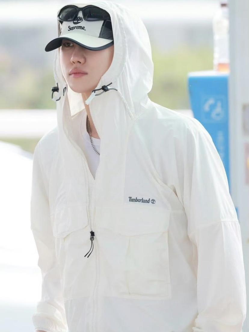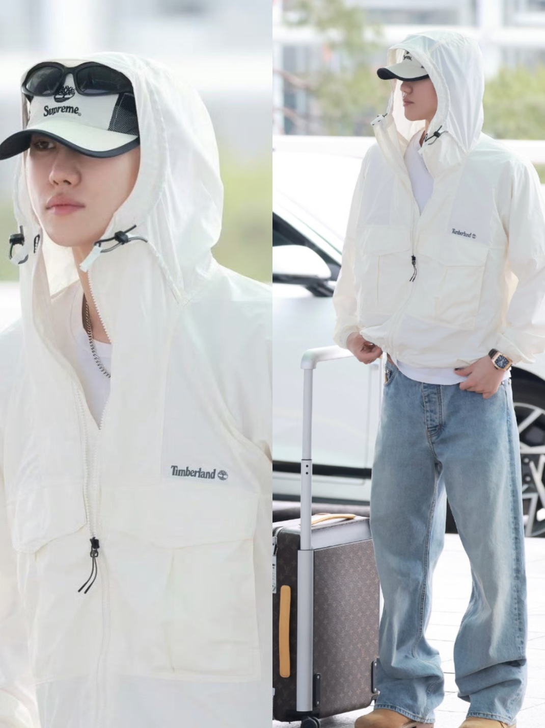 徐明浩这身机场私服,完美拿捏了男生夏日松弛感出行风,Timberland米白色连帽防晒衣搭配清新牛仔裤,鞋履:搭配Timberland经典大黄靴,和上衣品牌呼应,复古工装感瞬间拉满,和浅色系穿搭形成撞色,层次感瞬间提升!清爽帅气感拉满~
