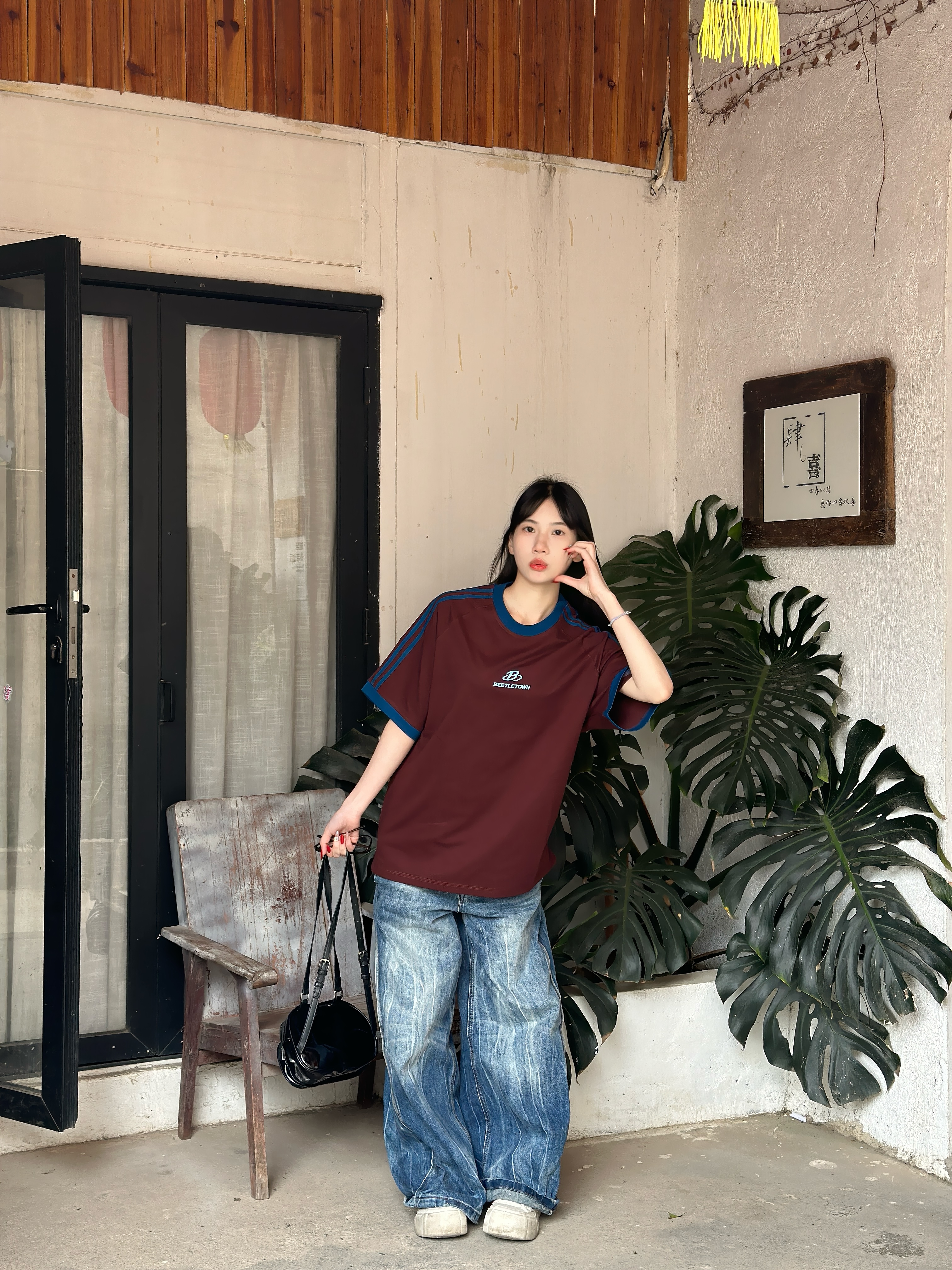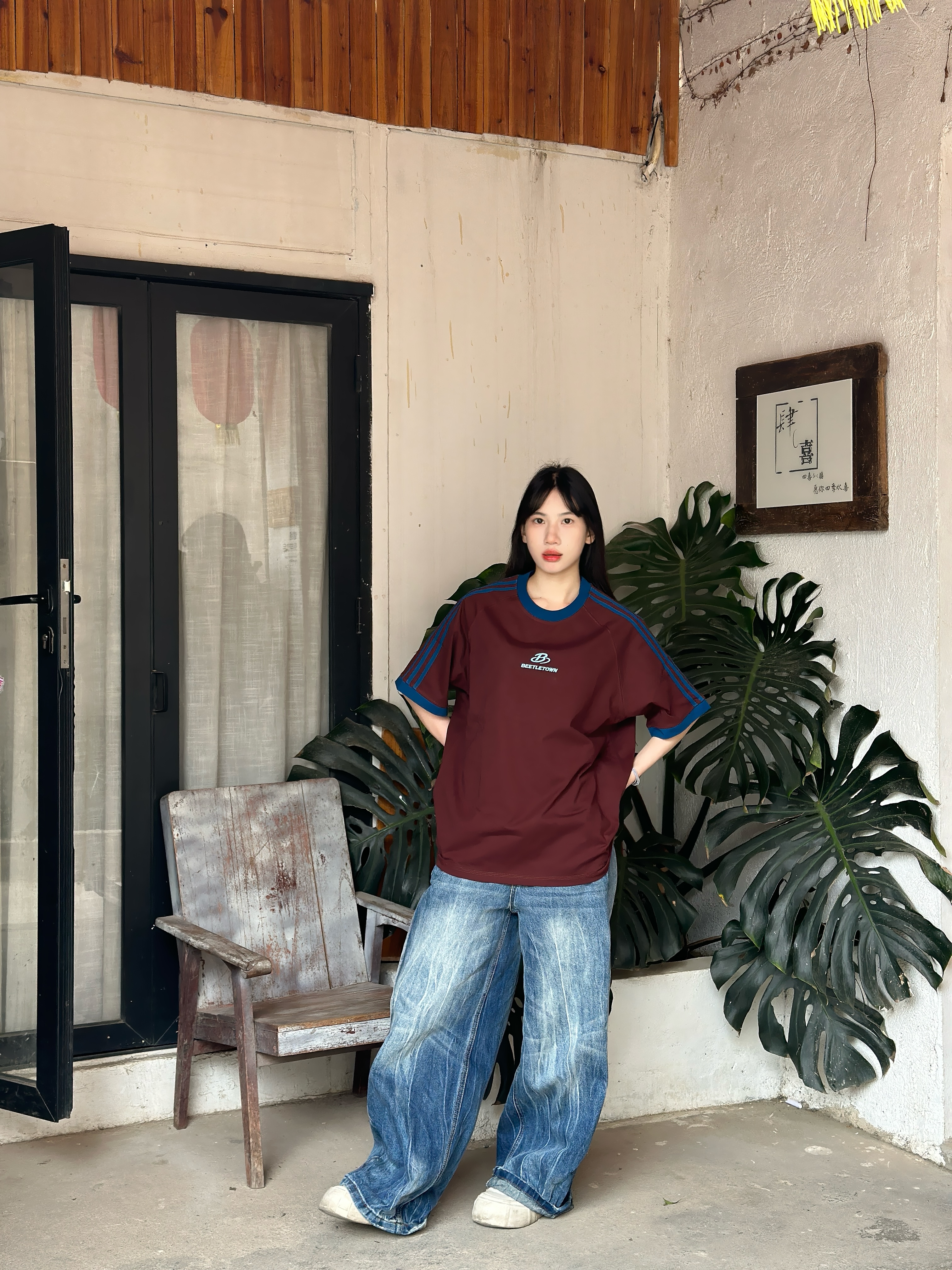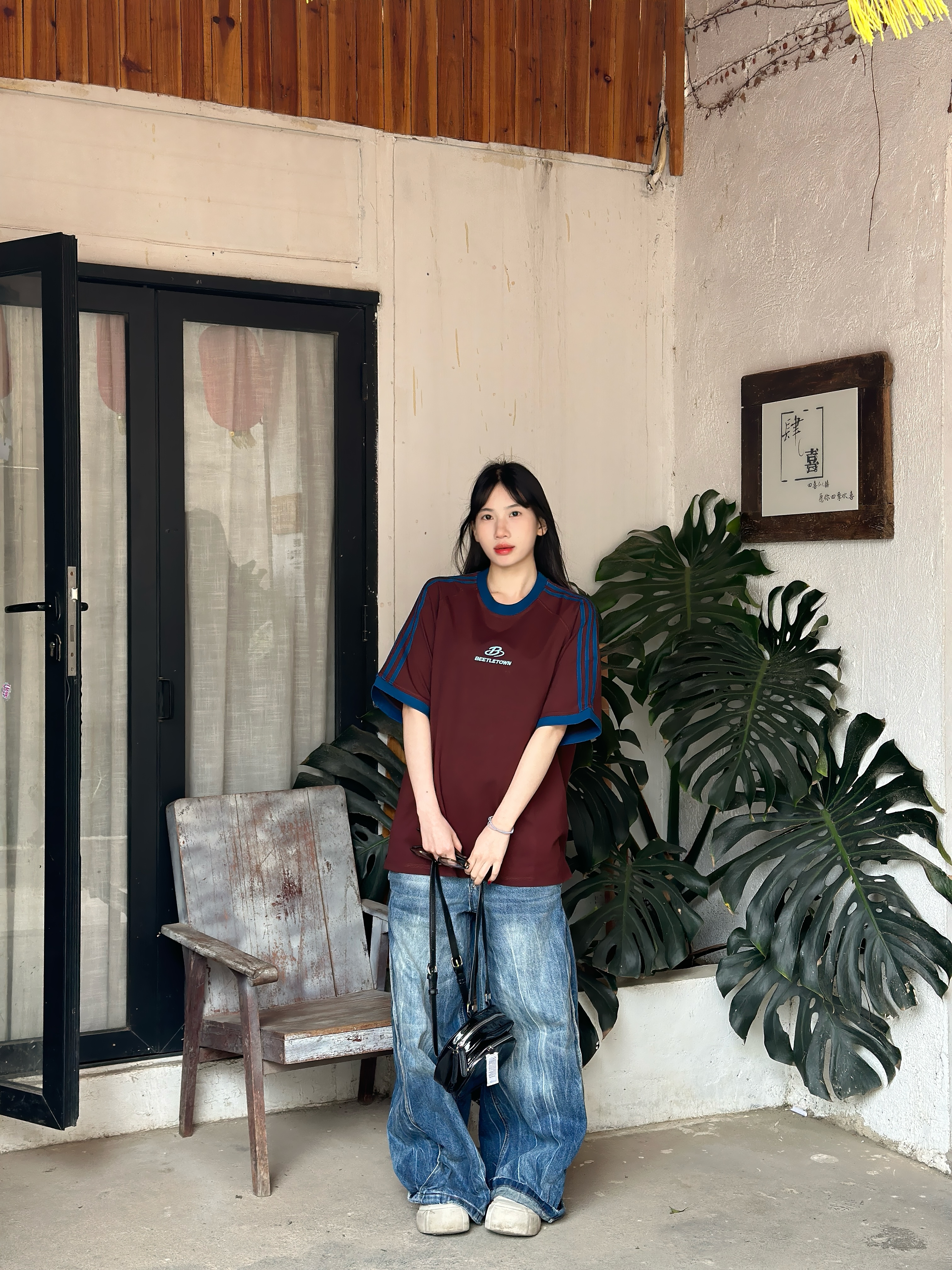 这件复古酒红T真的长在我的审美上! 撞色蓝边+三条杠设计 美式复古感拉满 宽松版型不挑身材 搭做旧阔腿牛仔裤 慵懒又随性 日常出街随便穿都好看 不费力的松弛感穿搭get✅