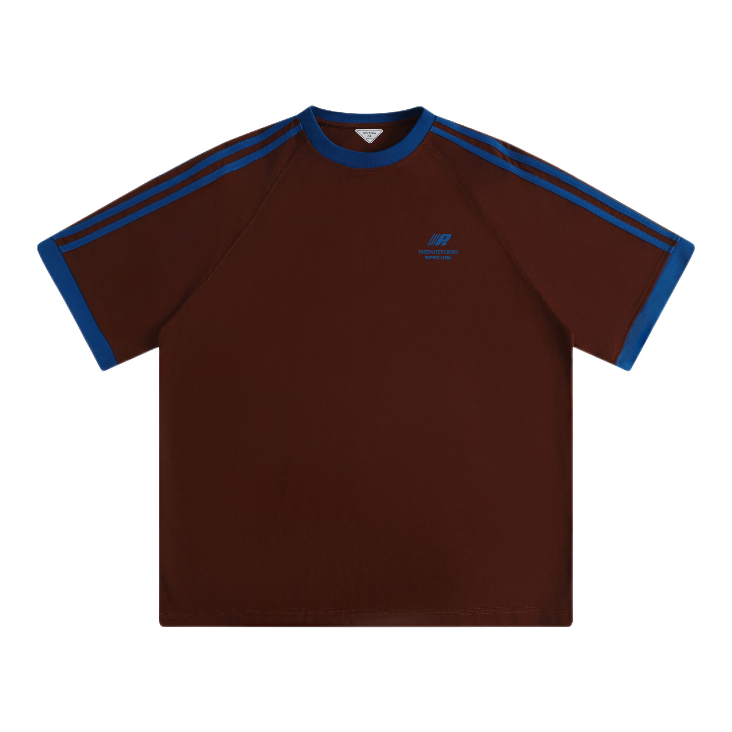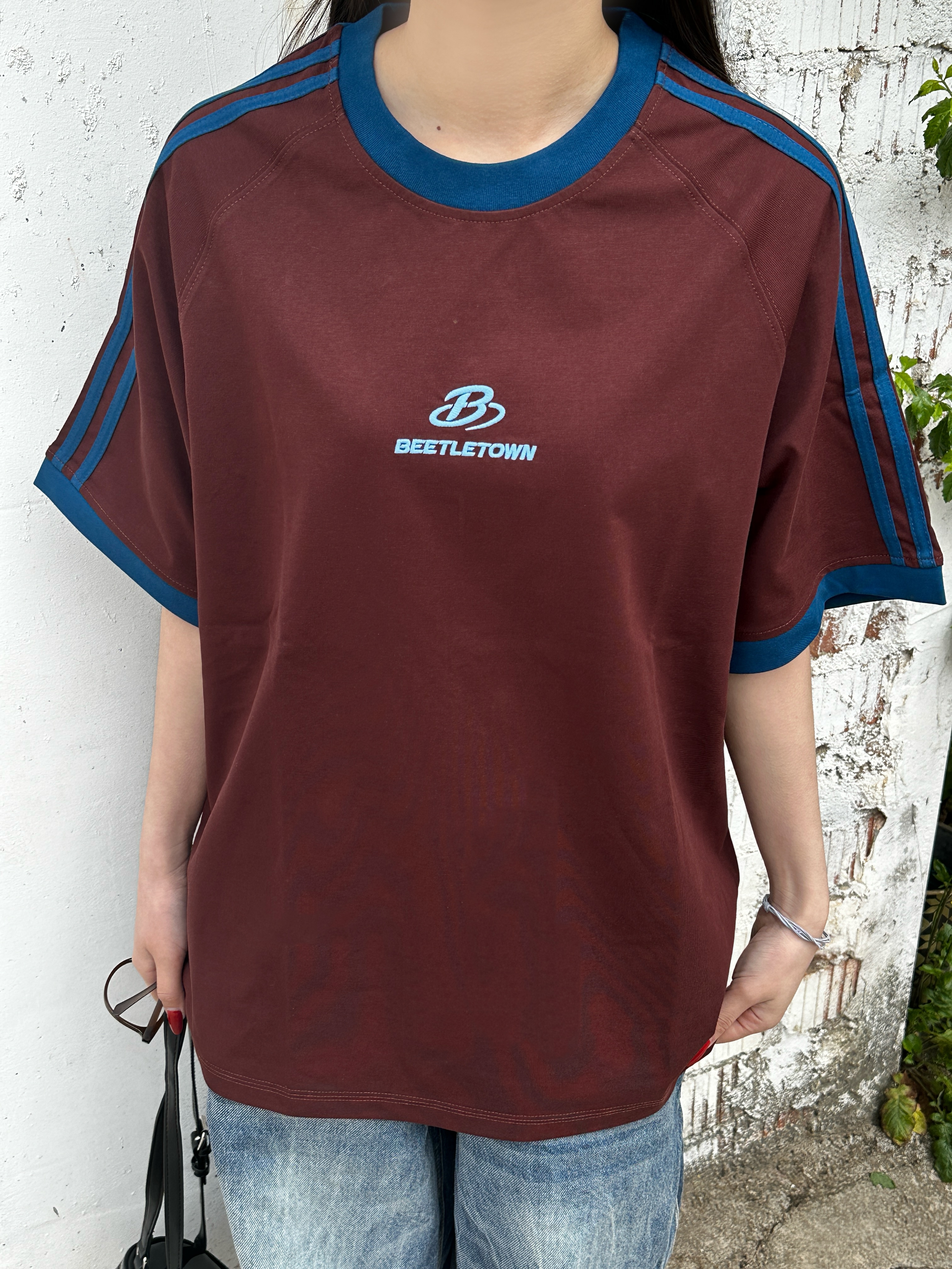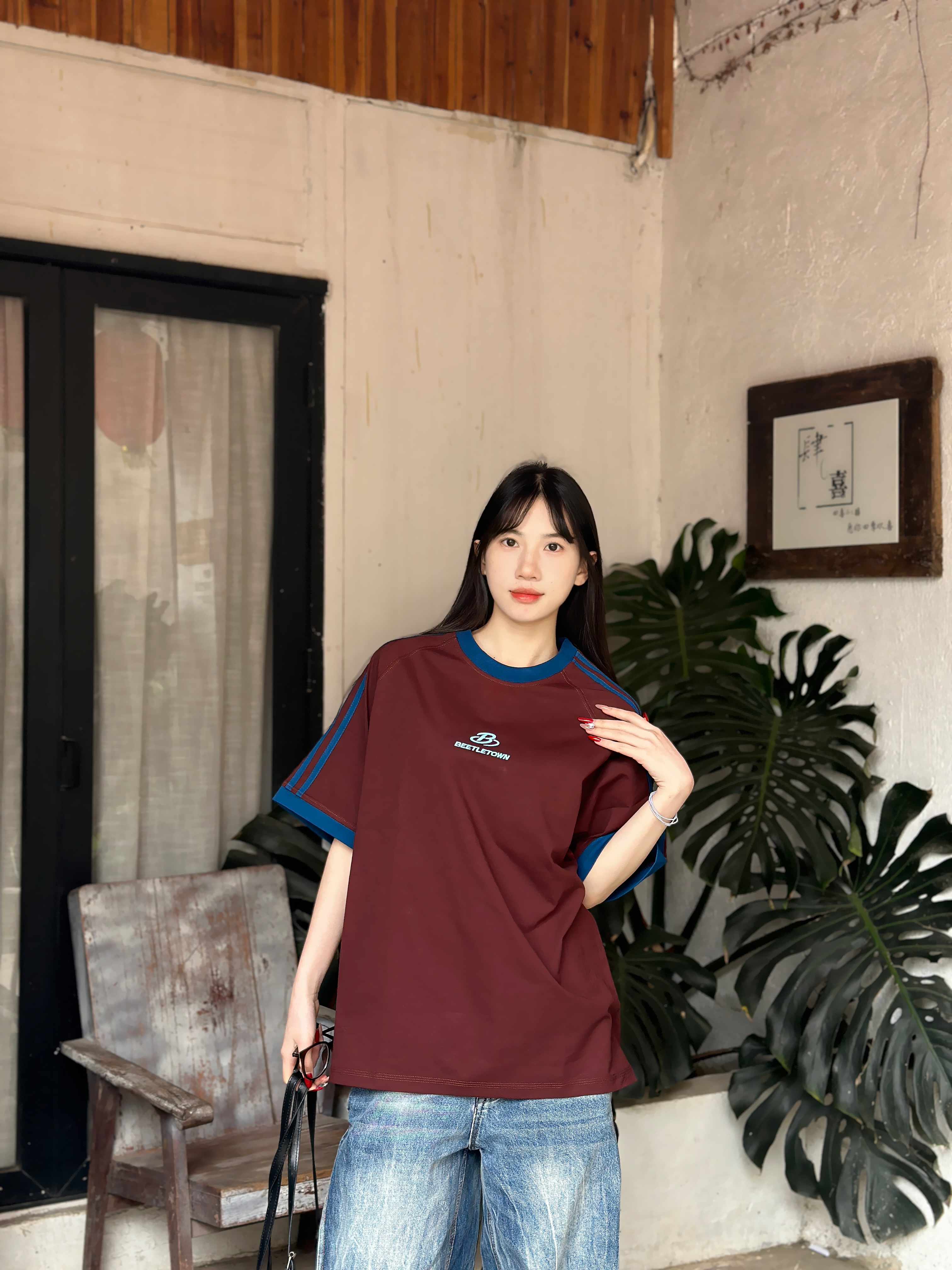 这件复古酒红T真的长在我的审美上! 撞色蓝边+三条杠设计 美式复古感拉满 宽松版型不挑身材 搭做旧阔腿牛仔裤 慵懒又随性 日常出街随便穿都好看 不费力的松弛感穿搭get✅