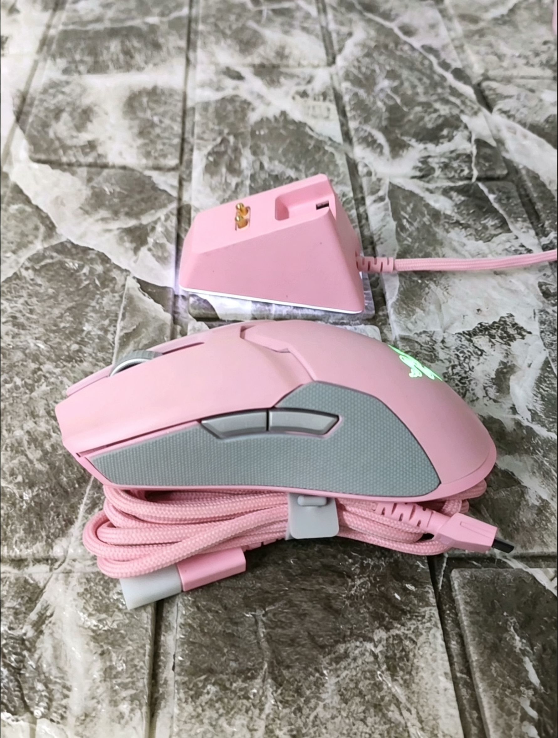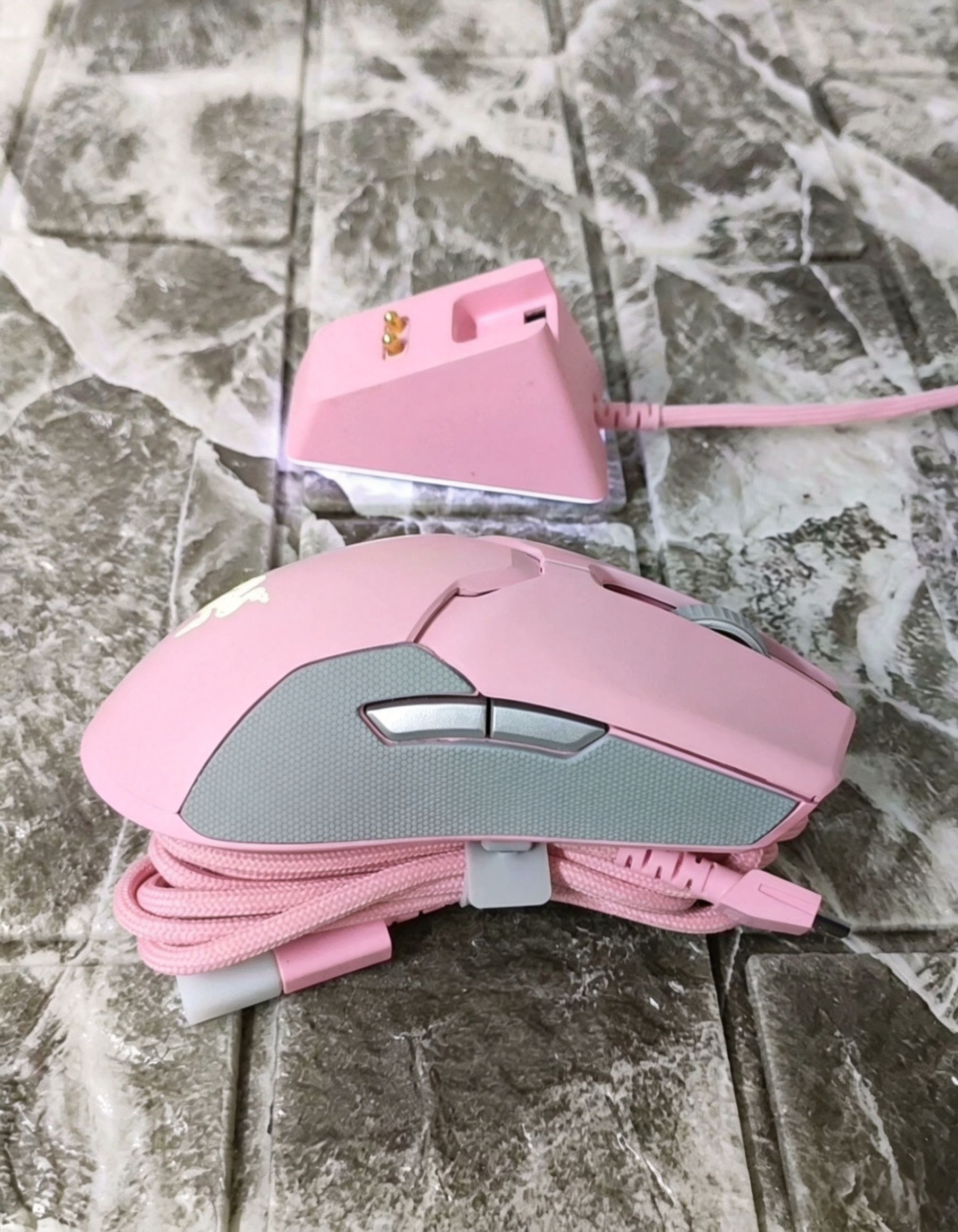 首先这个粉色真的太戳我了!不是那种廉价的死亡芭比粉,是很温柔的奶fufu的樱花粉,搭配灰色防滑侧裙,RGB灯效一亮,整个桌面直接颜值拉满,拍照巨出片,不管是打游戏还是日常用,都超有氛围感! 重点是手感真的绝!轻量型设计真的太舒服了,握久了手腕完全不酸,打FPS、MOBA游戏都超跟手,定位精准到离谱,甩狙、补刀都丝滑到飞起。无线用着完全不延迟,跟有线没差,再也不用被线缠来缠去了! 还带专属充...