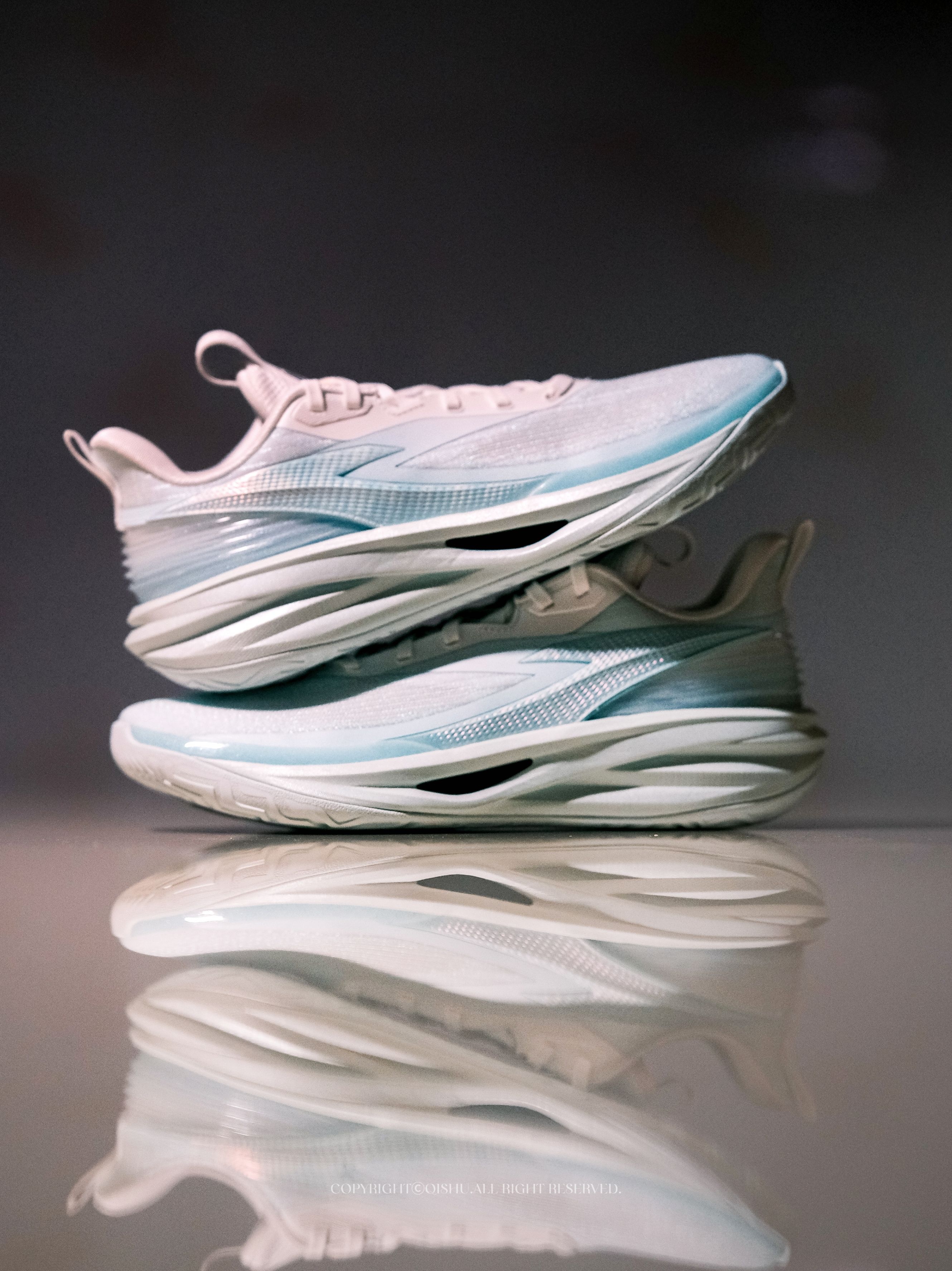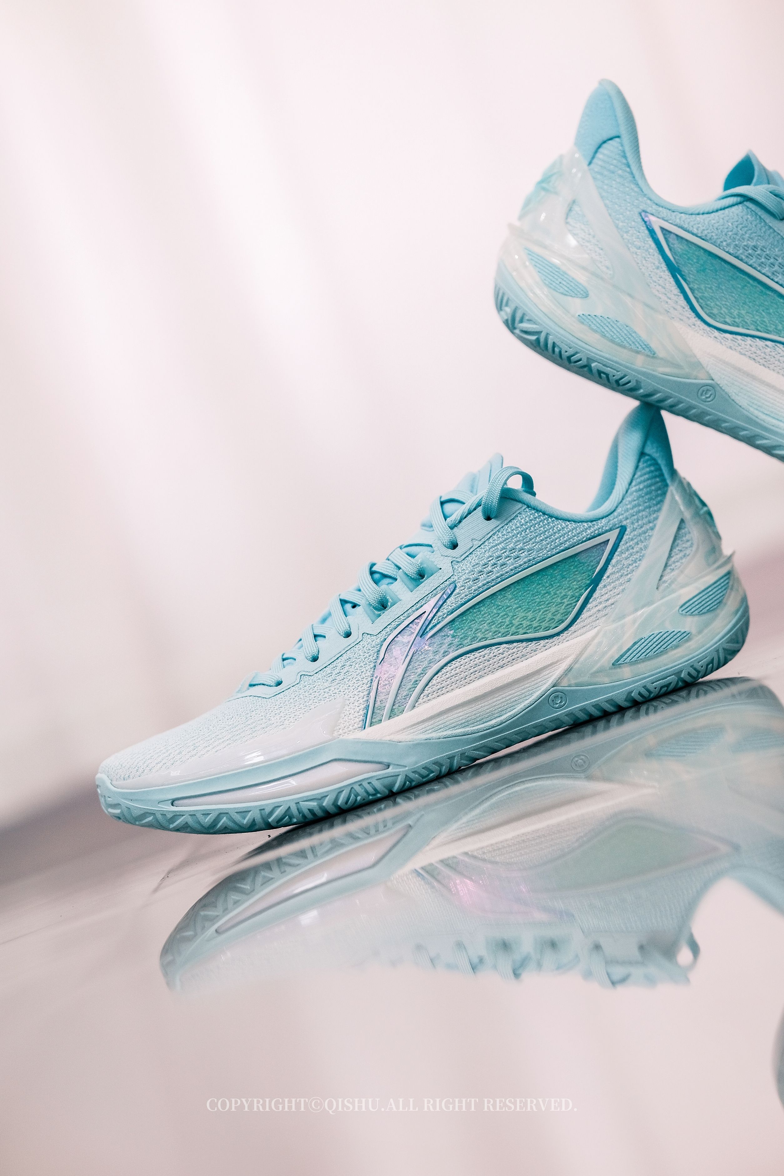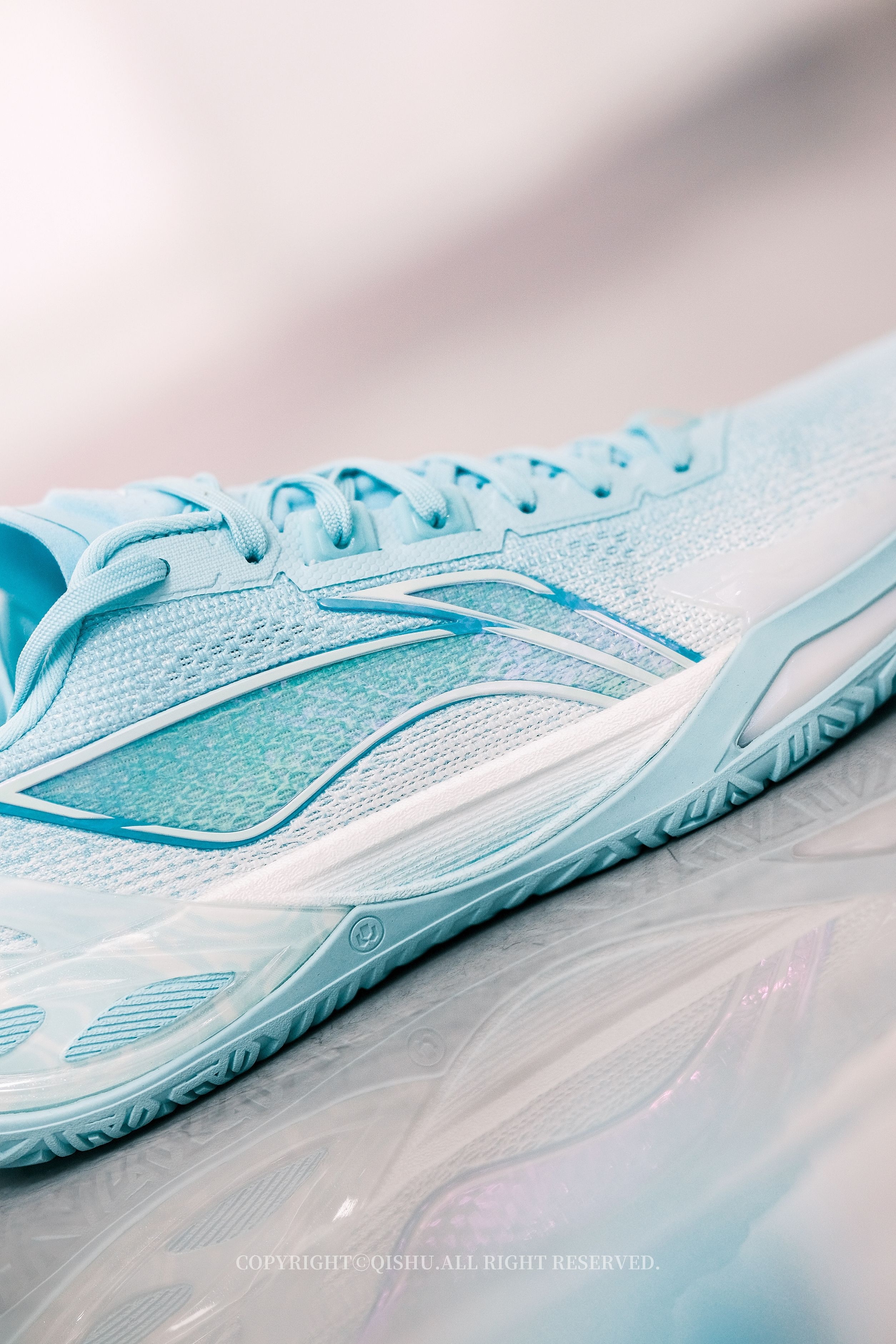 “碧落”一词,本就自带诗意——道教里指东方第一重天,也是万里晴空的颜色。 这双利刃6V2把天青色做得极清爽。鞋身从纯白渐变到湖绿,像晨光刚散、云层还没醒来的那一刻。侧面半透明Logo有镭射效果,光一转就泛出幻彩;后跟TPU藏着若隐若现的云纹,细节不张扬但很耐看。 鞋型修长利落,低帮重心降低后,上脚更贴地、更灵活。全掌䨻+前后填腹超䨻,弹得干脆,启动不拖沓,落地也稳。PENTA-S支撑系统把变向时的...