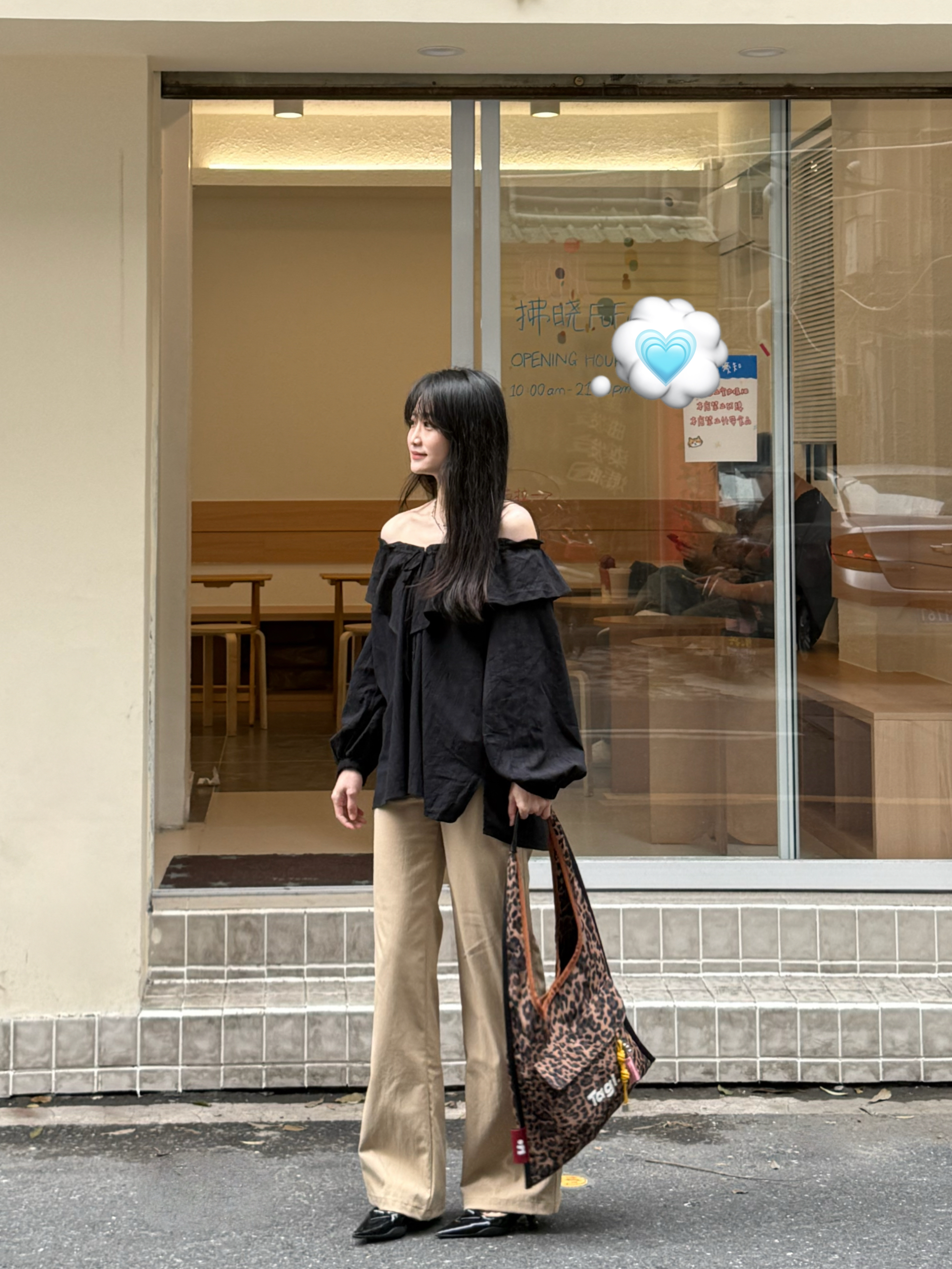 今天穿搭整体以黑棕色为主 上身一字肩长袖衫搭配浅棕色直筒裤 韩系又温柔 鞋子穿的是黑色单鞋 上脚舒适又百搭 最近再来一个豹纹元素包包 不费力的时髦感 就get啦~
