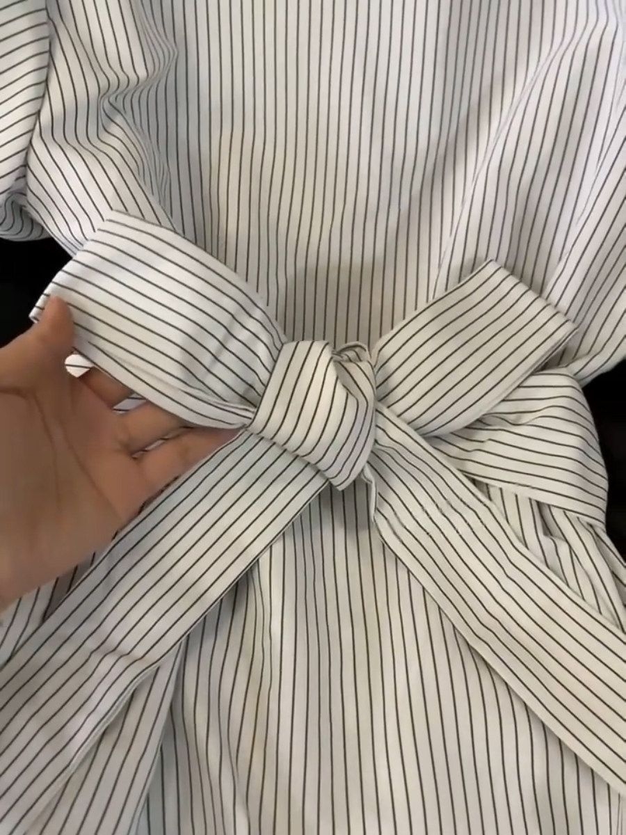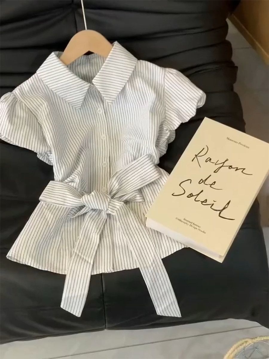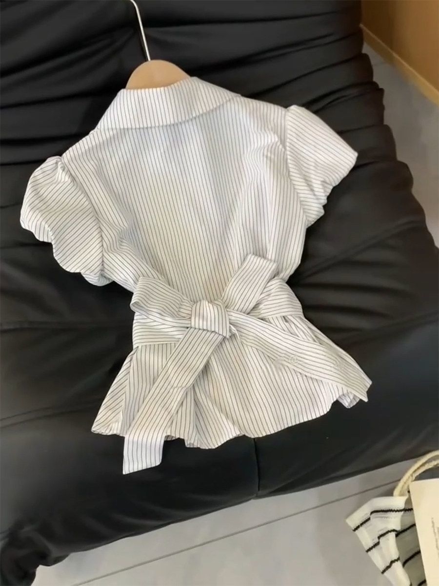 谁懂啊!这件条纹收腰衬衫直接把韩女氛围感焊在身上了✨ 经典细条纹+翻领设计,自带干净利落的通勤感,泡泡袖完美藏住拜拜肉,同色系绑带一系,腰线直接拉满,小个子也能穿出三七分好比例! 软乎乎的面料透气不闷汗,夏天穿完全不闷,不管是搭西装裤通勤,还是配牛仔裤逛街,都能轻松拿捏「精致不费力」的松弛感,衣柜里永远缺一件这样的百搭神衫!