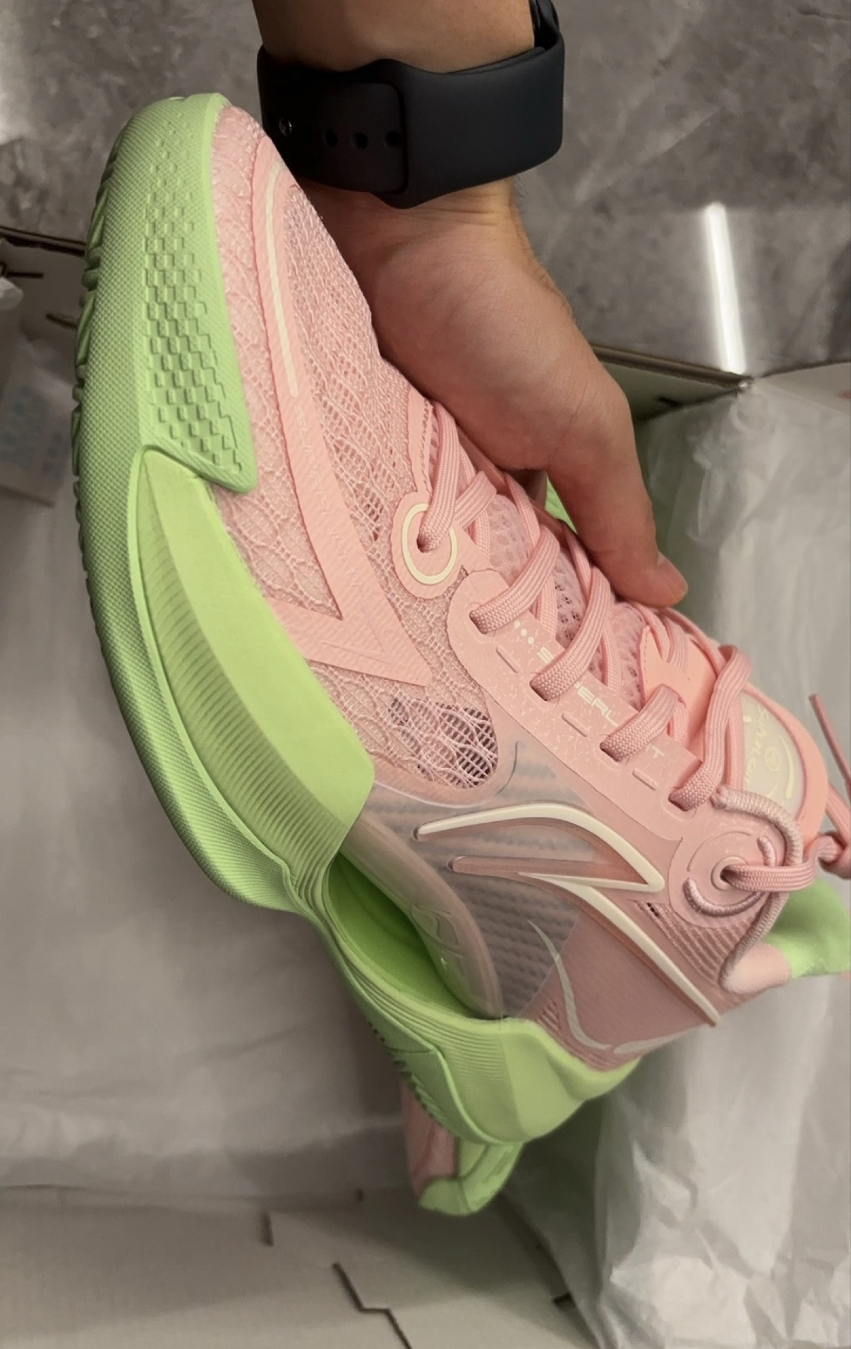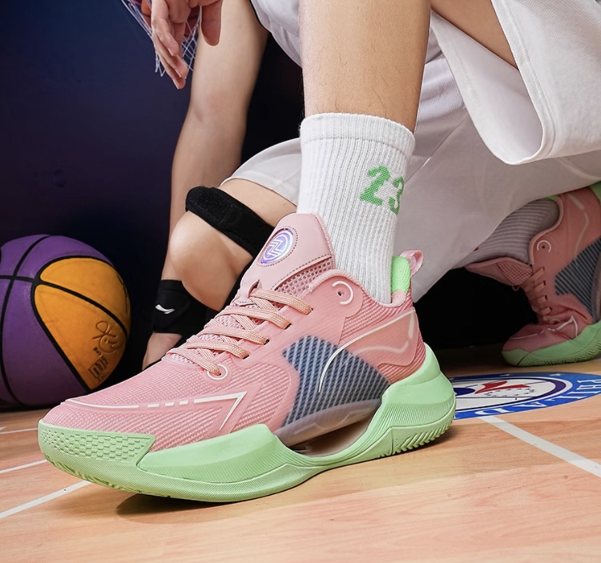 打球总嫌鞋重、闷脚的兄弟,这双真的救大命!上脚轻得像没穿鞋,网面巨透气,夏天打一下午也不闷汗。缓震够弹,启动不拖沓,抓地也稳,变向不打滑。粉绿配色颜值直接拉满,球场回头率爆表。喜欢的兄弟点个关注,好鞋不等人!