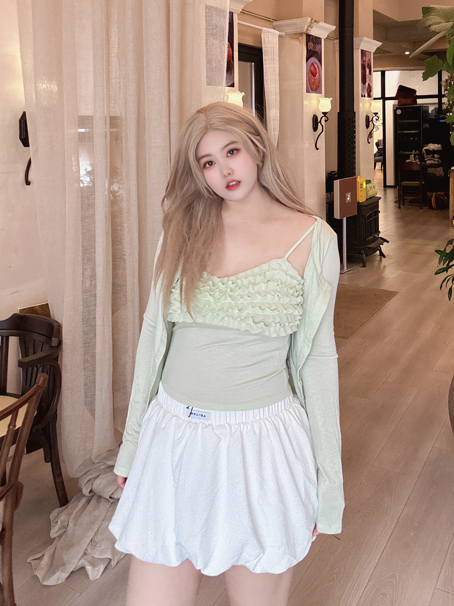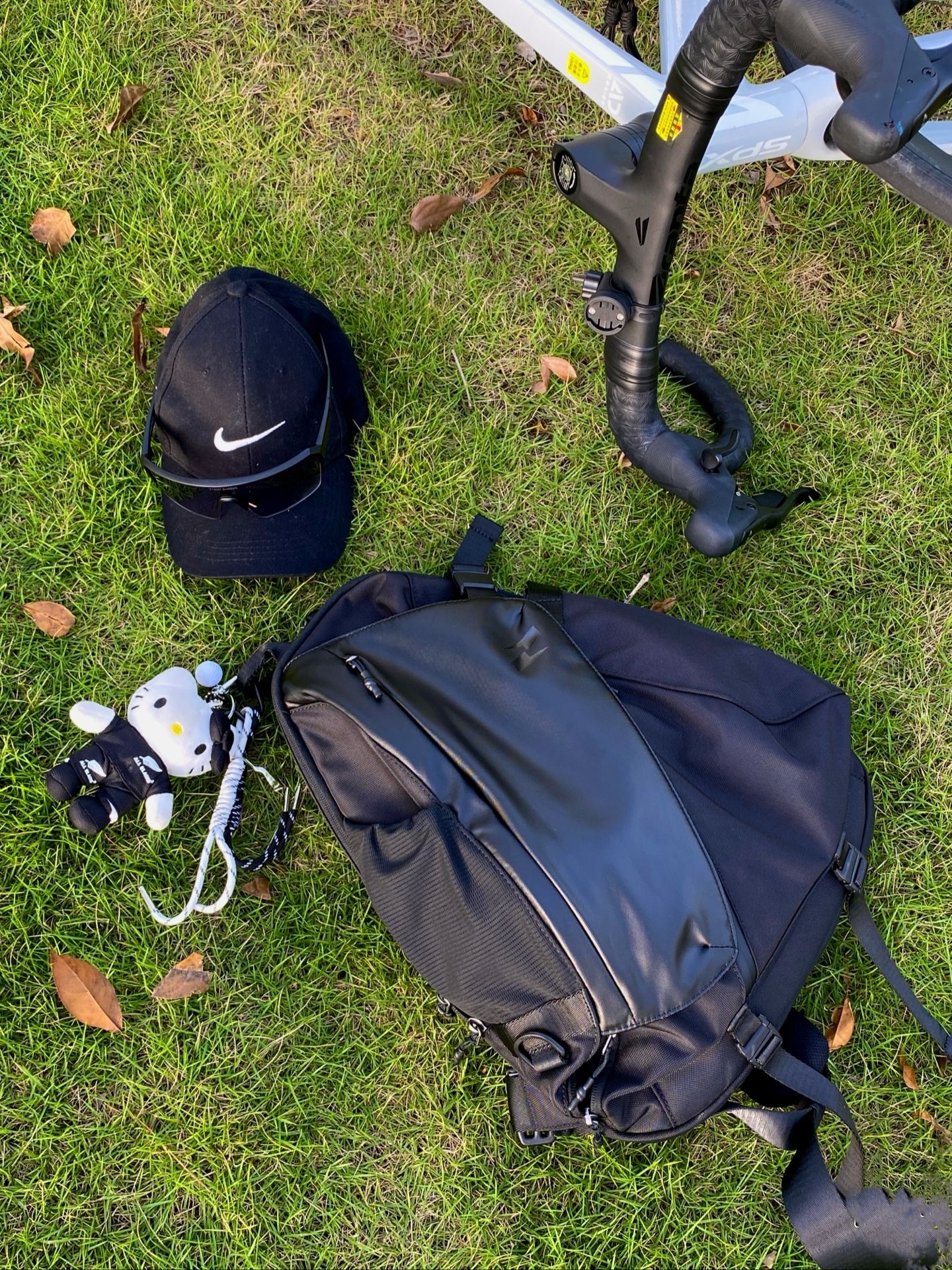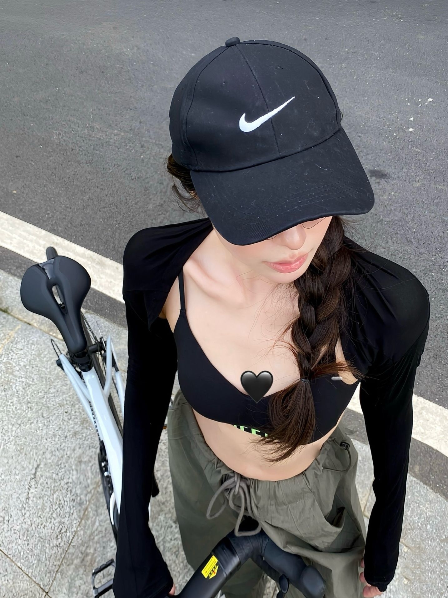 上身是黑色运动内衣,简约的版型贴合身形,面料亲肤又透气,骑行时完全没有束缚感。衣身的字母细节增添了设计感,微微露出的腰腹线条,透着随性的运动气息。腰间系着的黑色衣物,为整体造型添了几分层次感,也能随手收纳小物件。