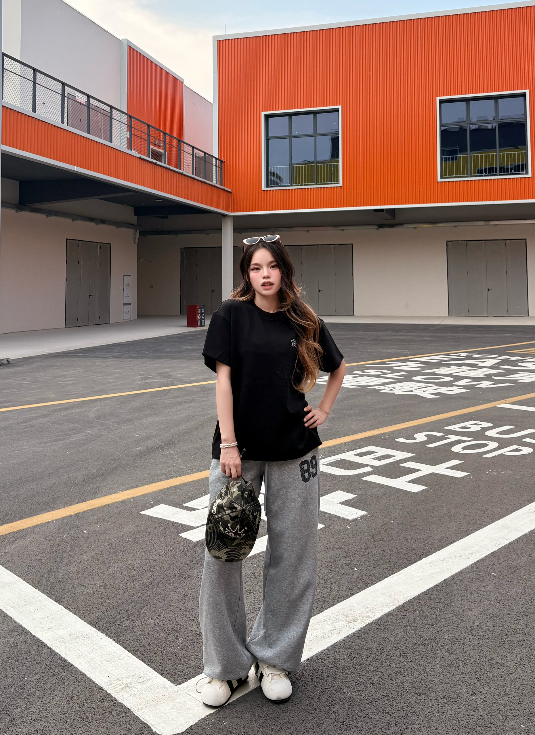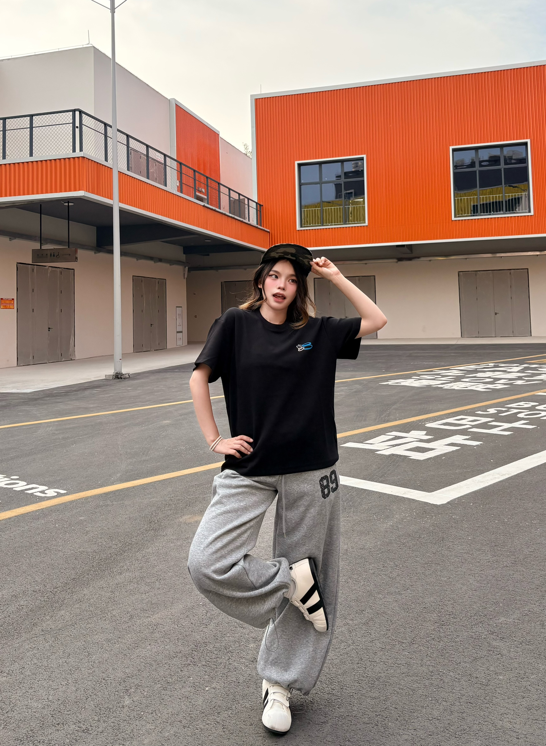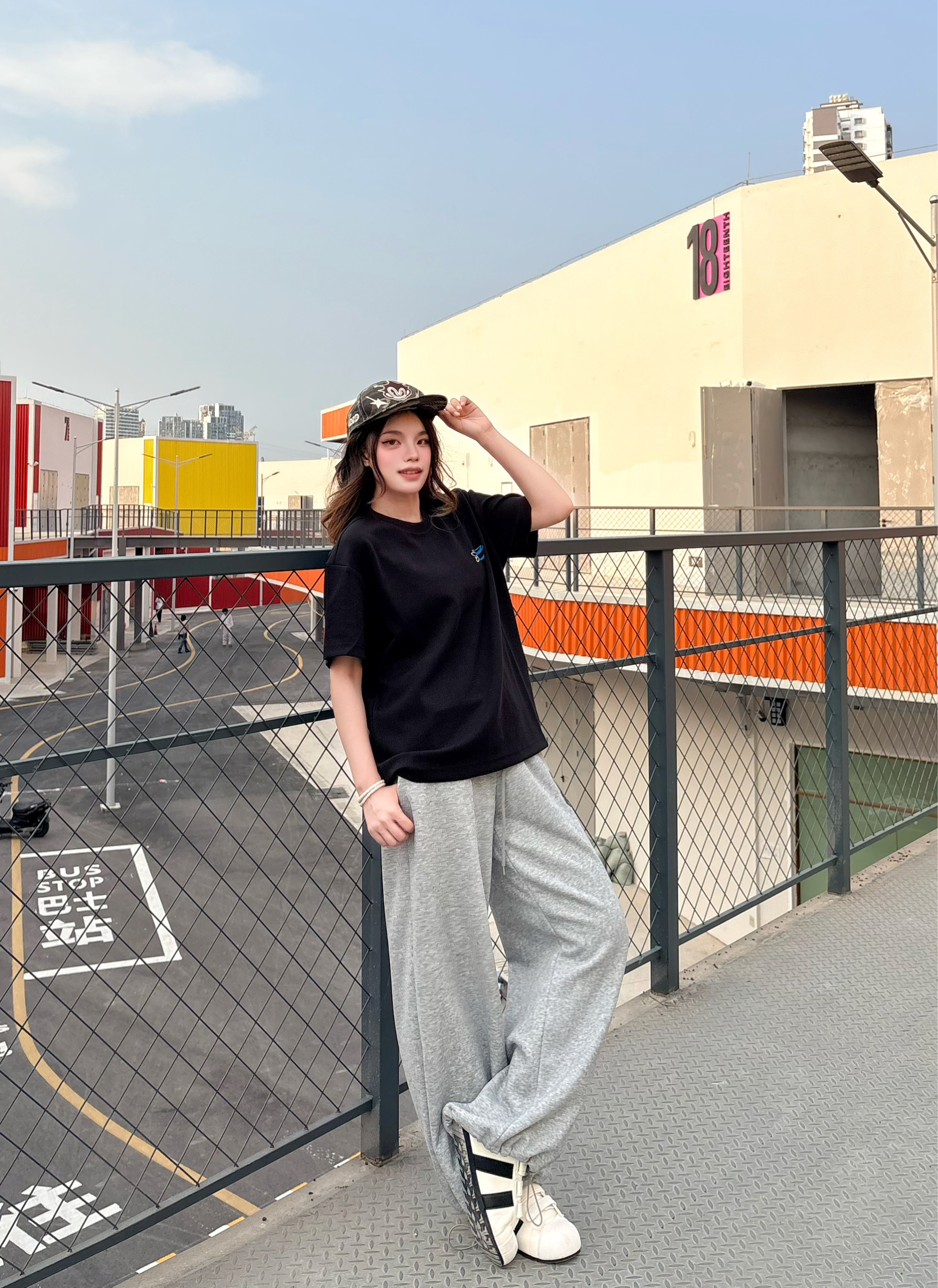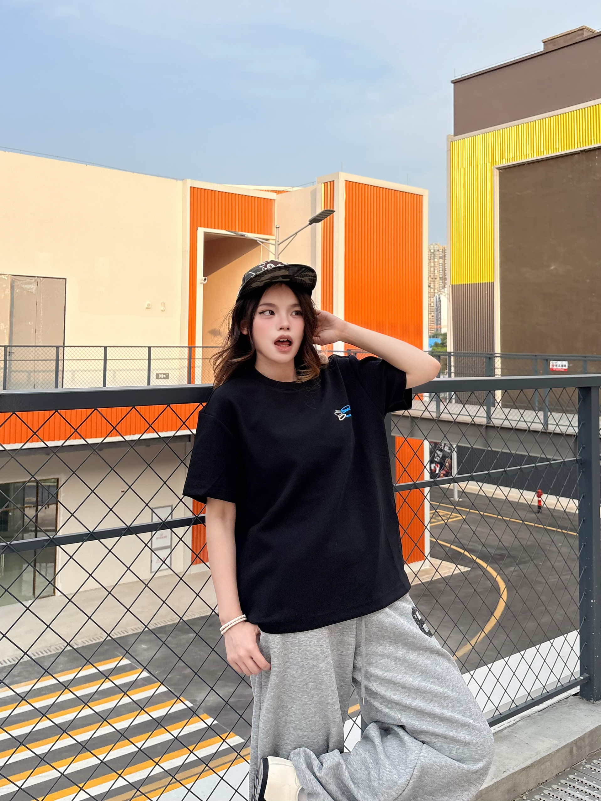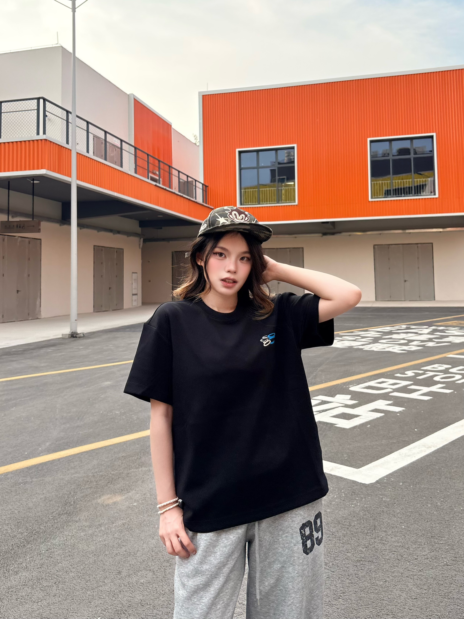 今日人设 运动风酷girl ✅穿搭思路拆解: ▫️上衣:oversize黑色短袖,宽松落肩版型巨藏肉,对各种身材都超友好,日常穿完全不挑人 ▫️下装:灰色89号阔腿卫裤,垂感满分,和黑T是经典黑白灰配色,慵懒松弛感直接拉满,束脚设计还能优化比例,显高显瘦一绝 ▫️配饰:棒球帽+简约手链,细节感拉满,美式辣妹那味儿直接出来了 ▫️鞋子:黑白德训鞋,和整套穿搭完美适配,走路舒服又百搭