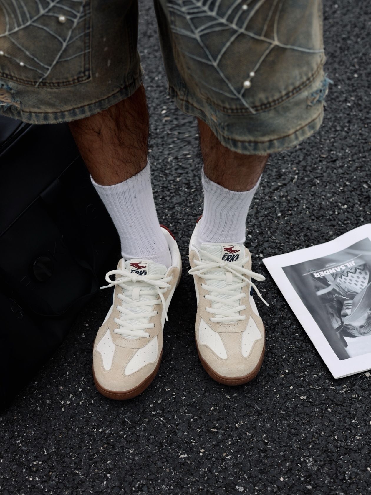 👟:鸿星尔克灵动德训鞋 手里的杂志📖肩上的包🎒都是日常的一部分 不用追赶潮流,也不必过分搭配——这种“不刻意”的松弛感,就是街头最好的态度