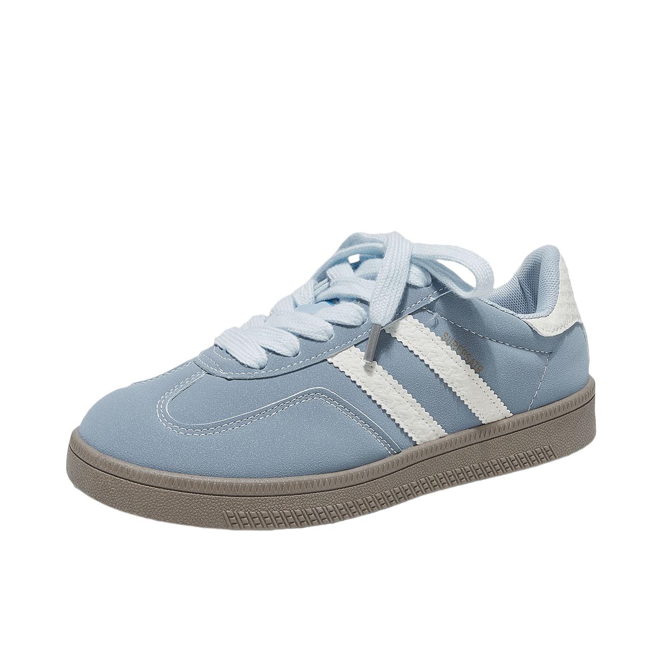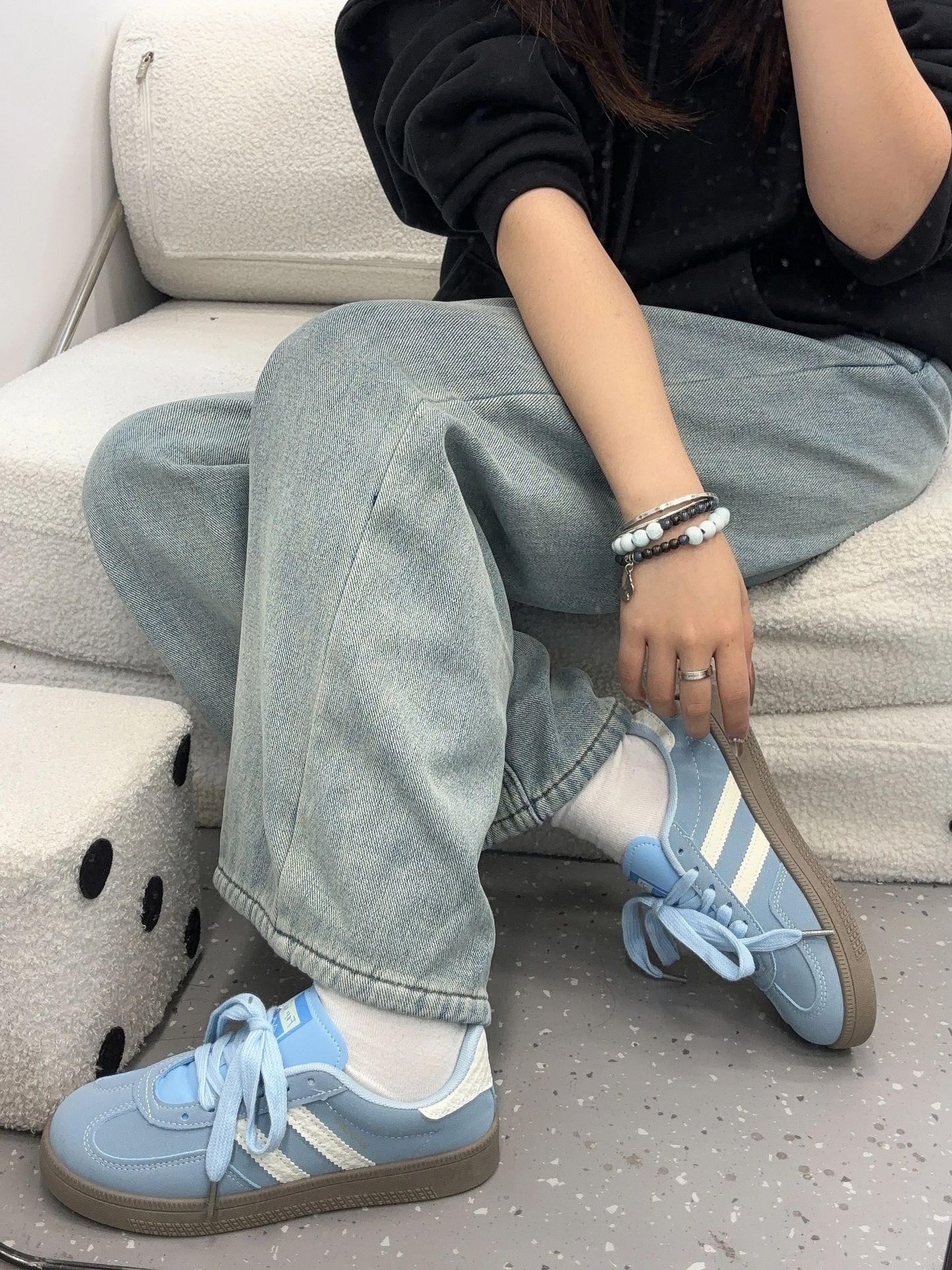 家人们!这双蓝色德训鞋我能穿一整个春夏!低饱和雾霾蓝超显白,麂皮质感绝了。经典T头鞋型显脚小,上脚软弹又轻便,暴走逛街都不累。搭牛仔裤、百褶裙、运动裤都巨好看,韩系松弛感轻松拿捏。春夏穿清爽又干净,百搭不出错,学生党打工人闭眼冲!
