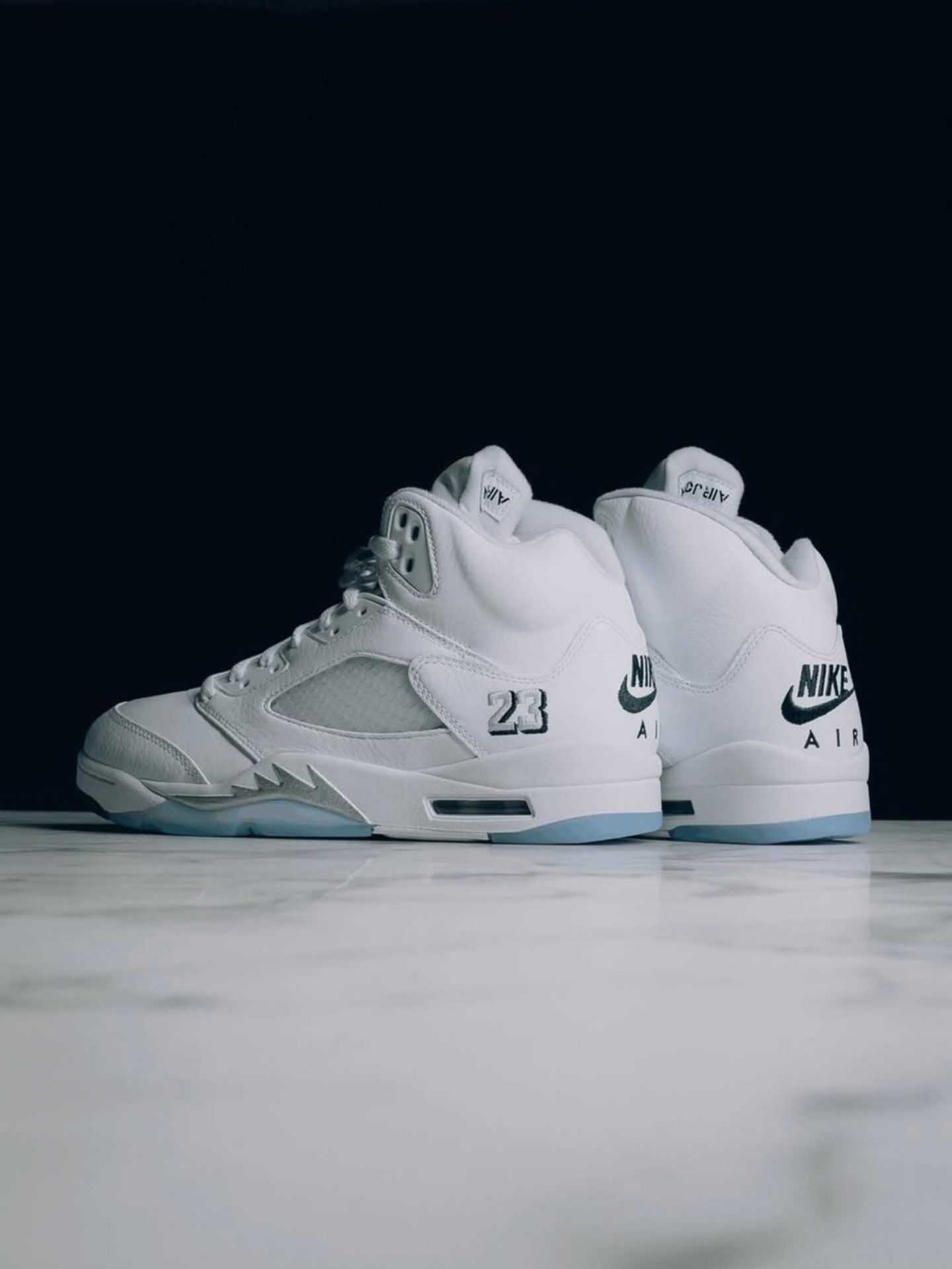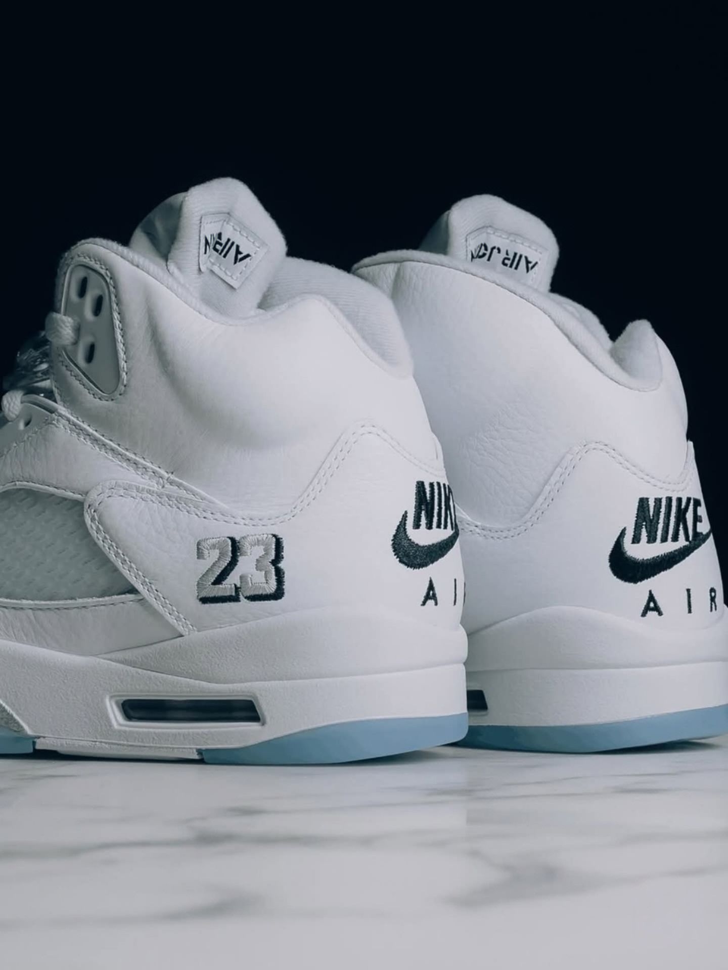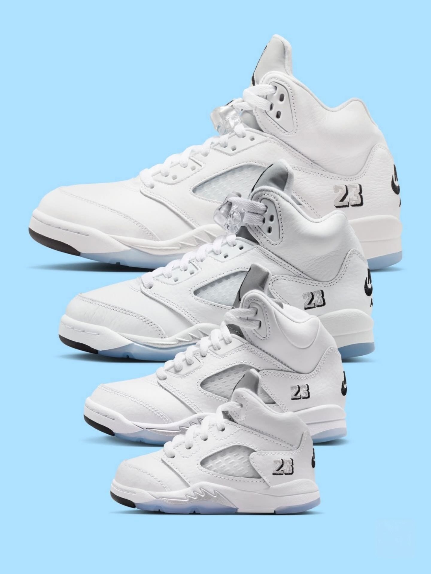 家人们!爷青回的Air Jordan 5 "White Metallic" 正式官宣发售了🔥 4月25日正式登场,而且是全家族尺码同步发售! 纯白荔枝皮革鞋身+金属银细节点缀,鞋侧23号刺绣、后跟飞人logo、鞋舌NIKE AIR标完美还原元年质感,冰蓝色水晶外底直接把氛围感拉满,经典永不过说的就是它! 不管是老鞋迷收藏,还是新玩家入手,这双都是AJ5系列里的必入款,4月25日定好闹钟冲就完事了!