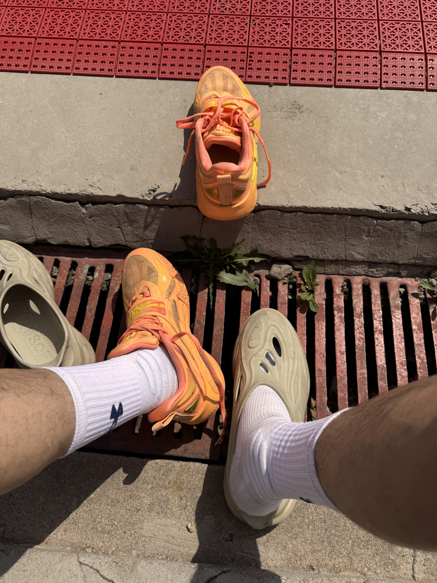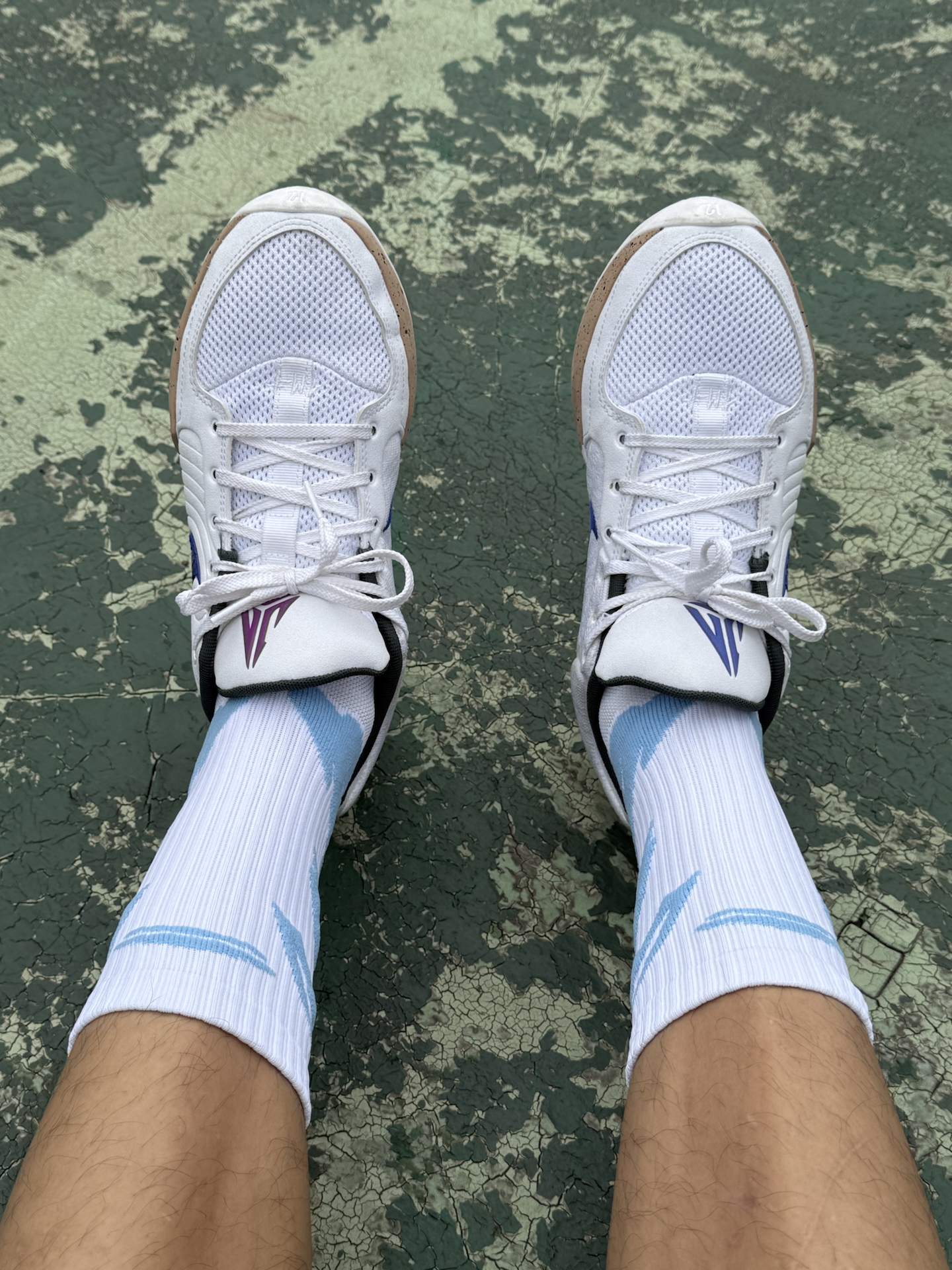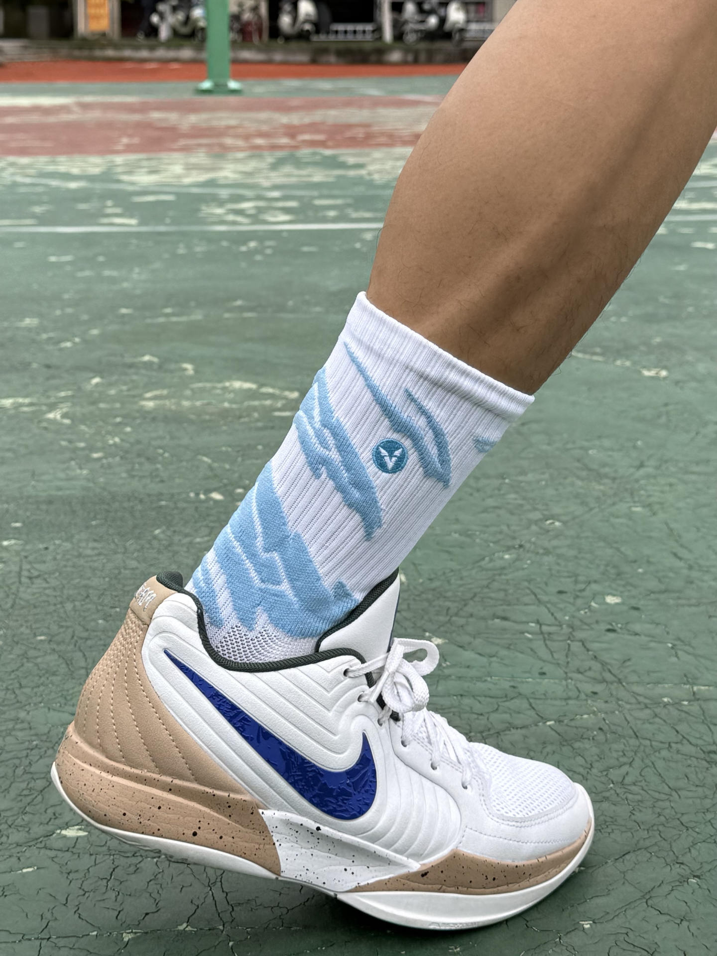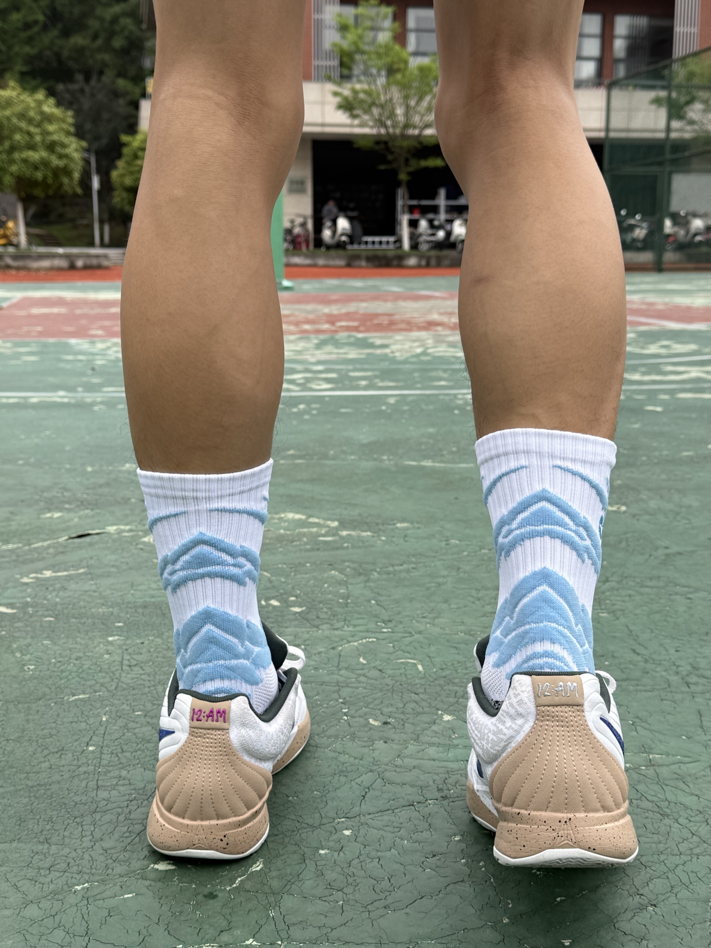 今日外场实战分享来自 VEIDOORN 品牌家这款跨海pro系列球袜,白蓝相间的配色上脚还是非常帅的,和我的球鞋很搭,毛巾底的面料上脚包裹感十足,脚踝处都做了加厚的设计,实战脚感很好,性价比非常高的一款球袜哦! 跨海篮球袜