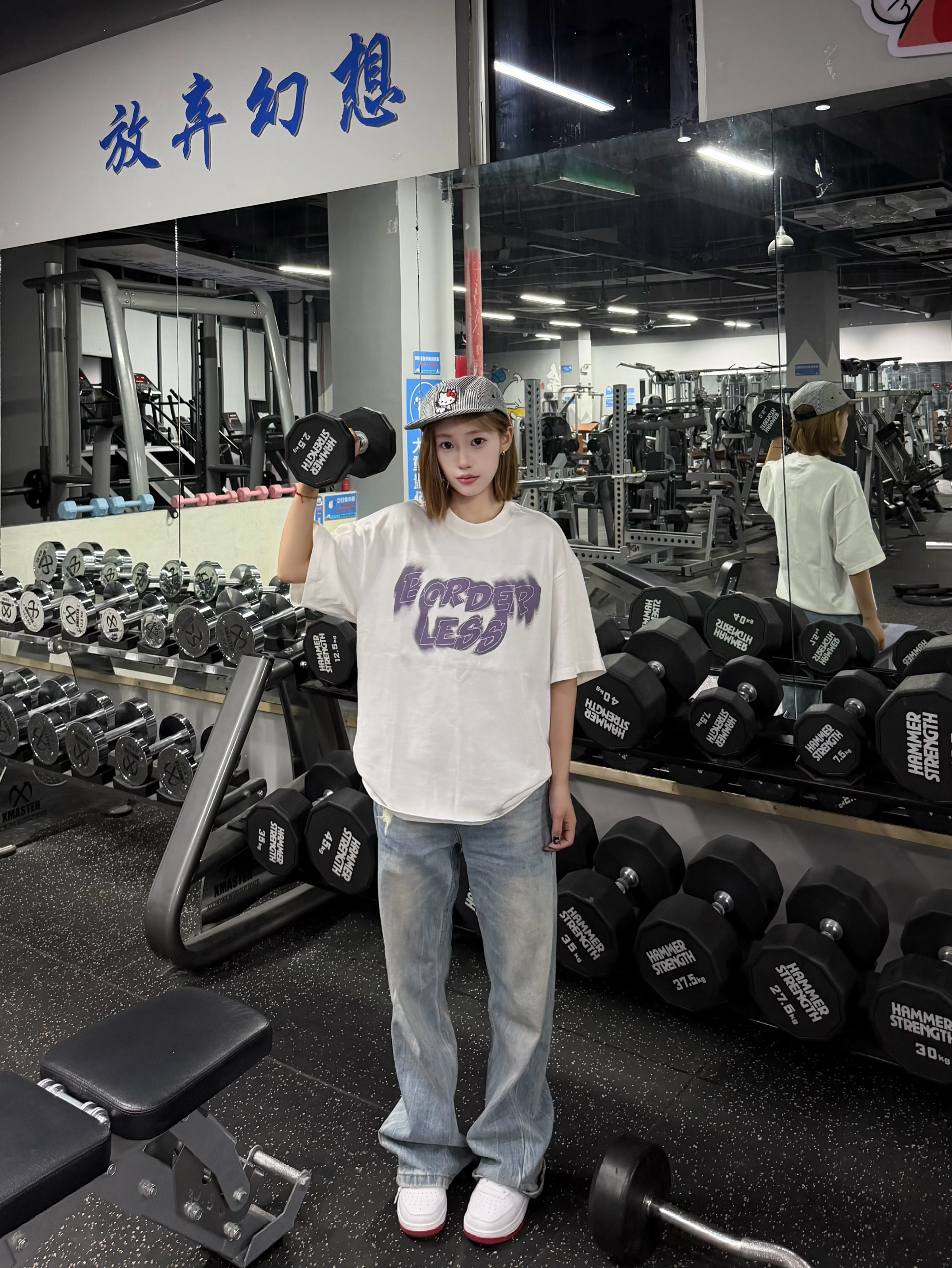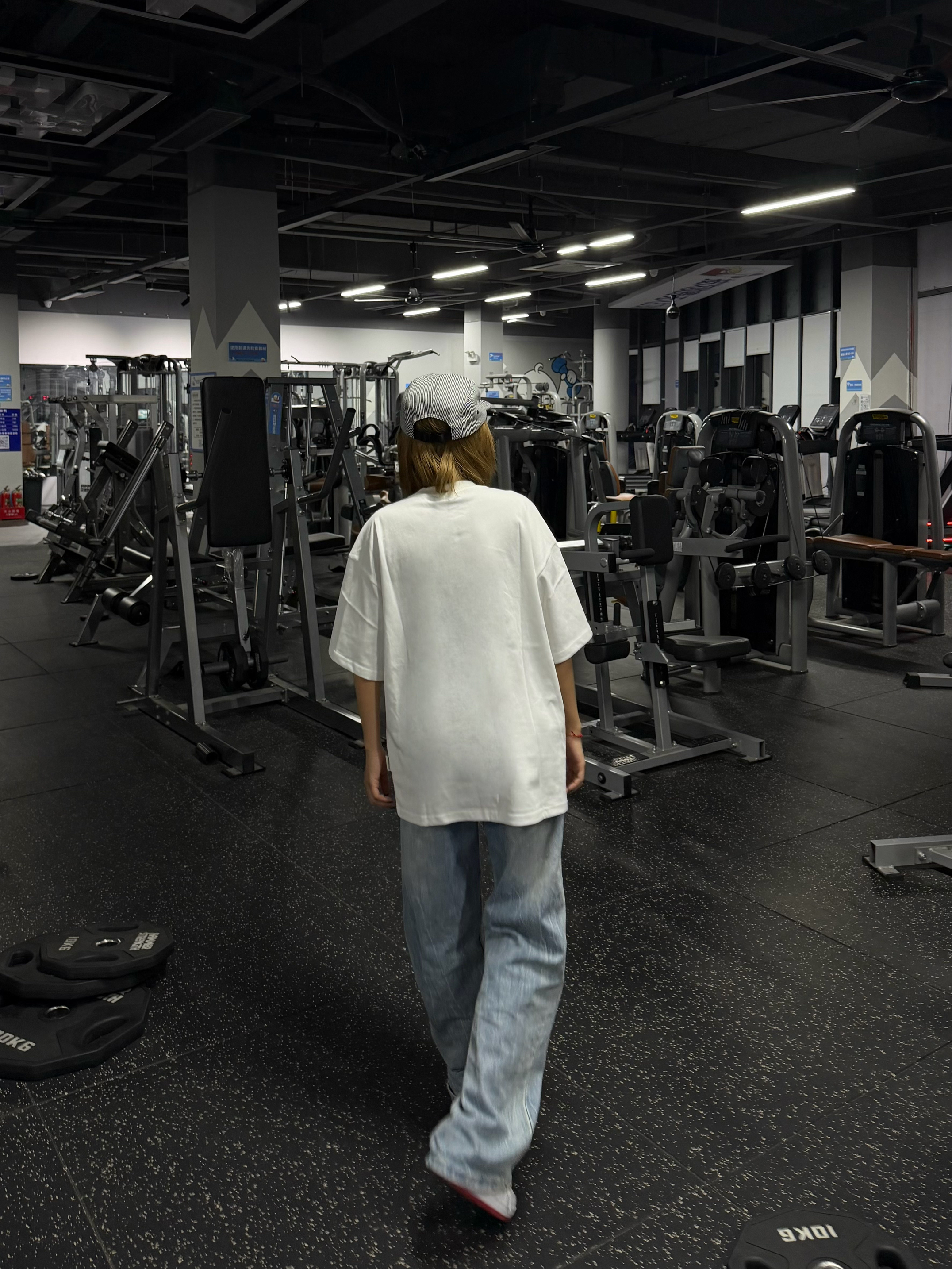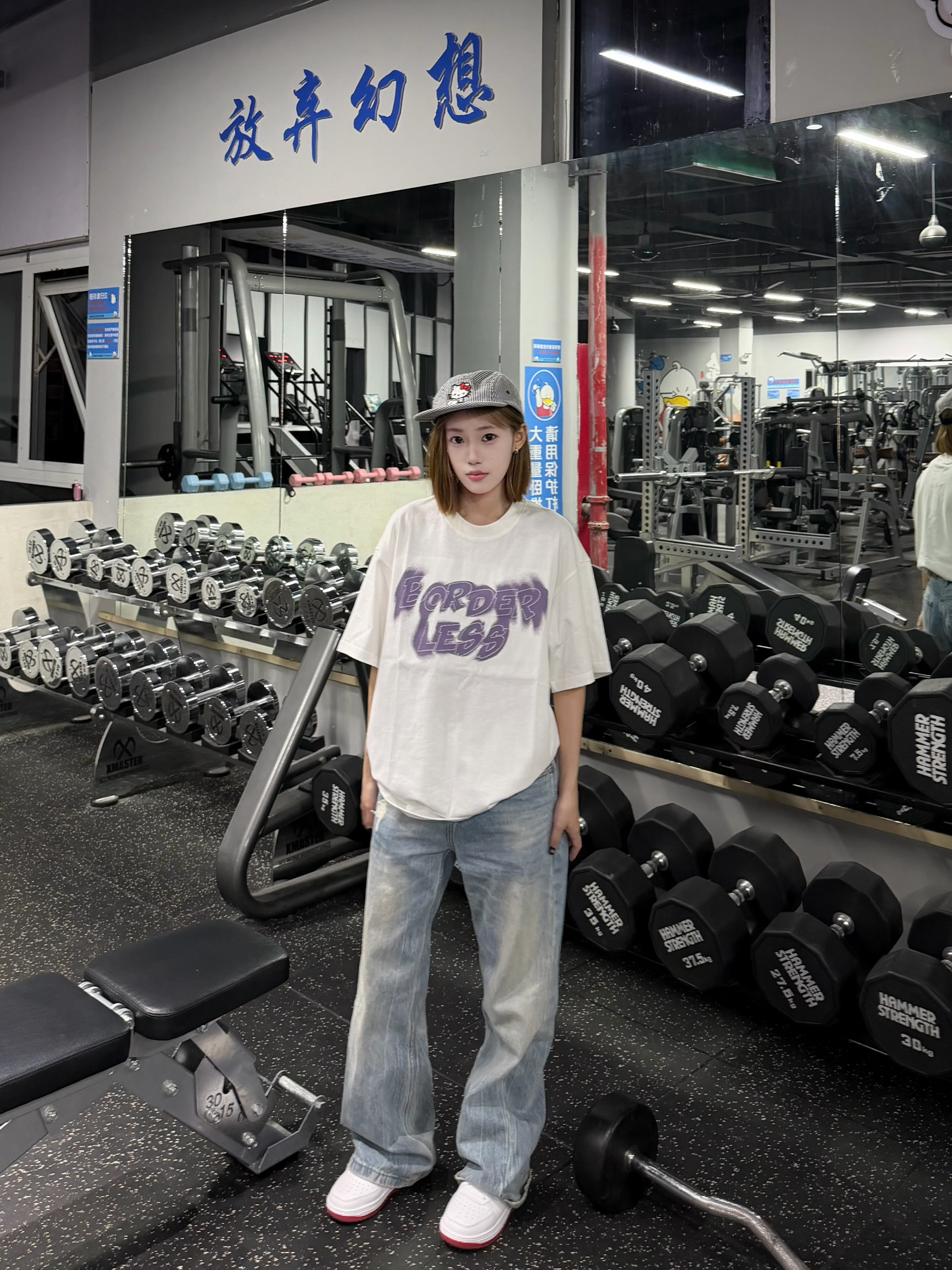 今日健身OOTD主打一个清爽不费力!重点夸这件白色印花短袖,紫调图案超戳我,温柔又吸睛,oversize版型遮肉又舒服,运动时完全无束缚~搭配浅蓝阔腿牛仔裤,松弛感拉满,再踩双红白鞋,元气满满去撸铁,心情都变超好💪