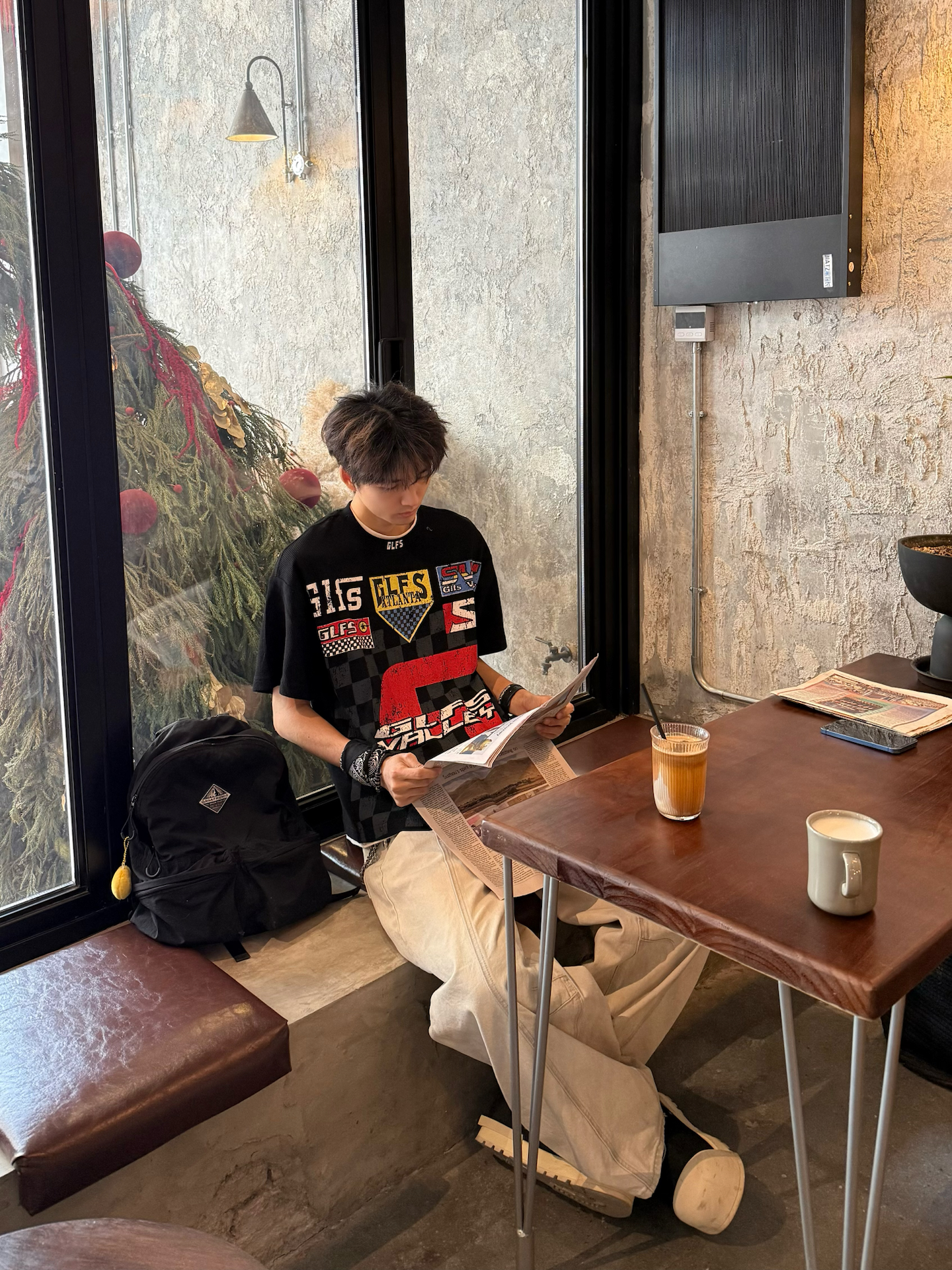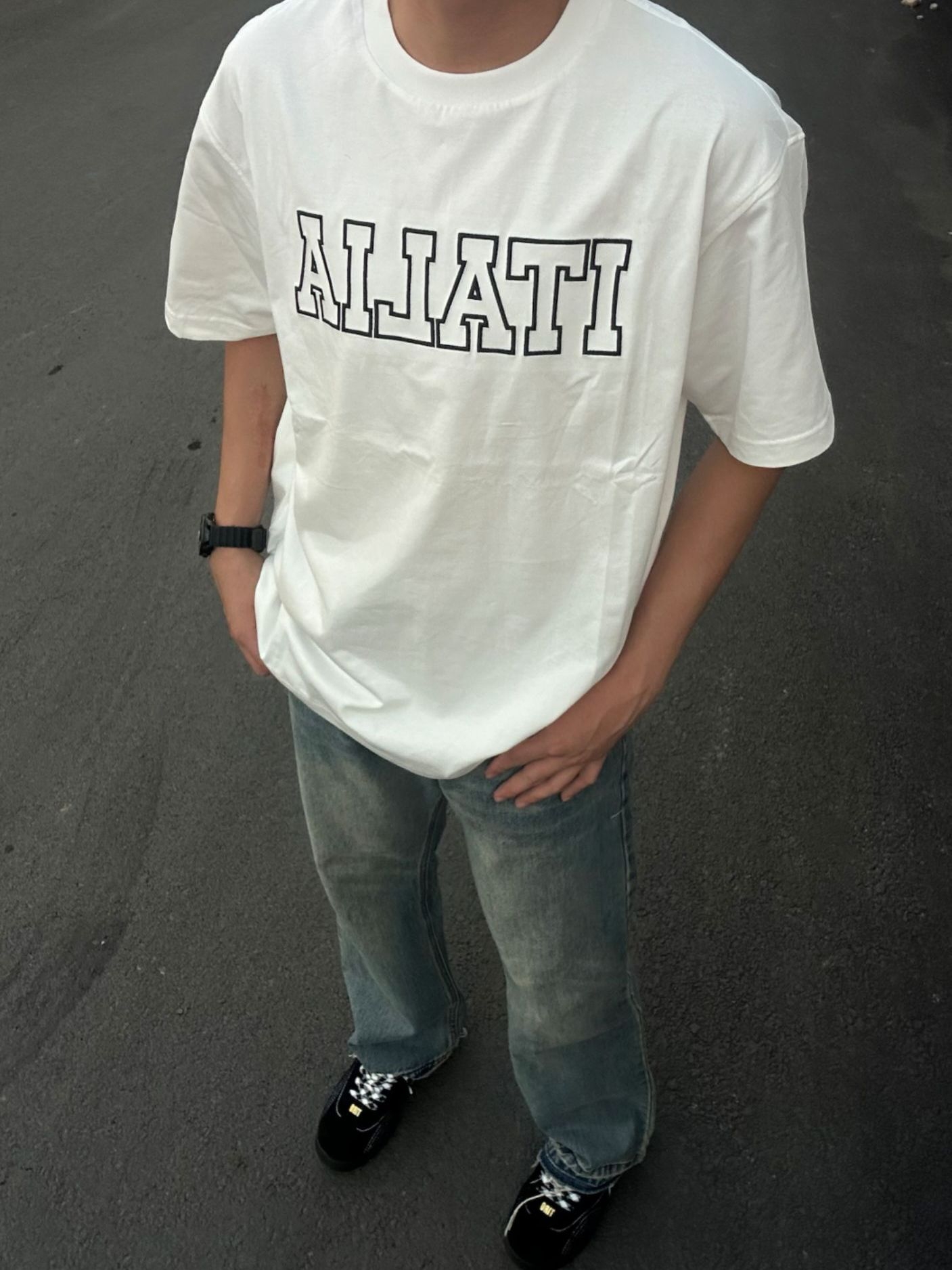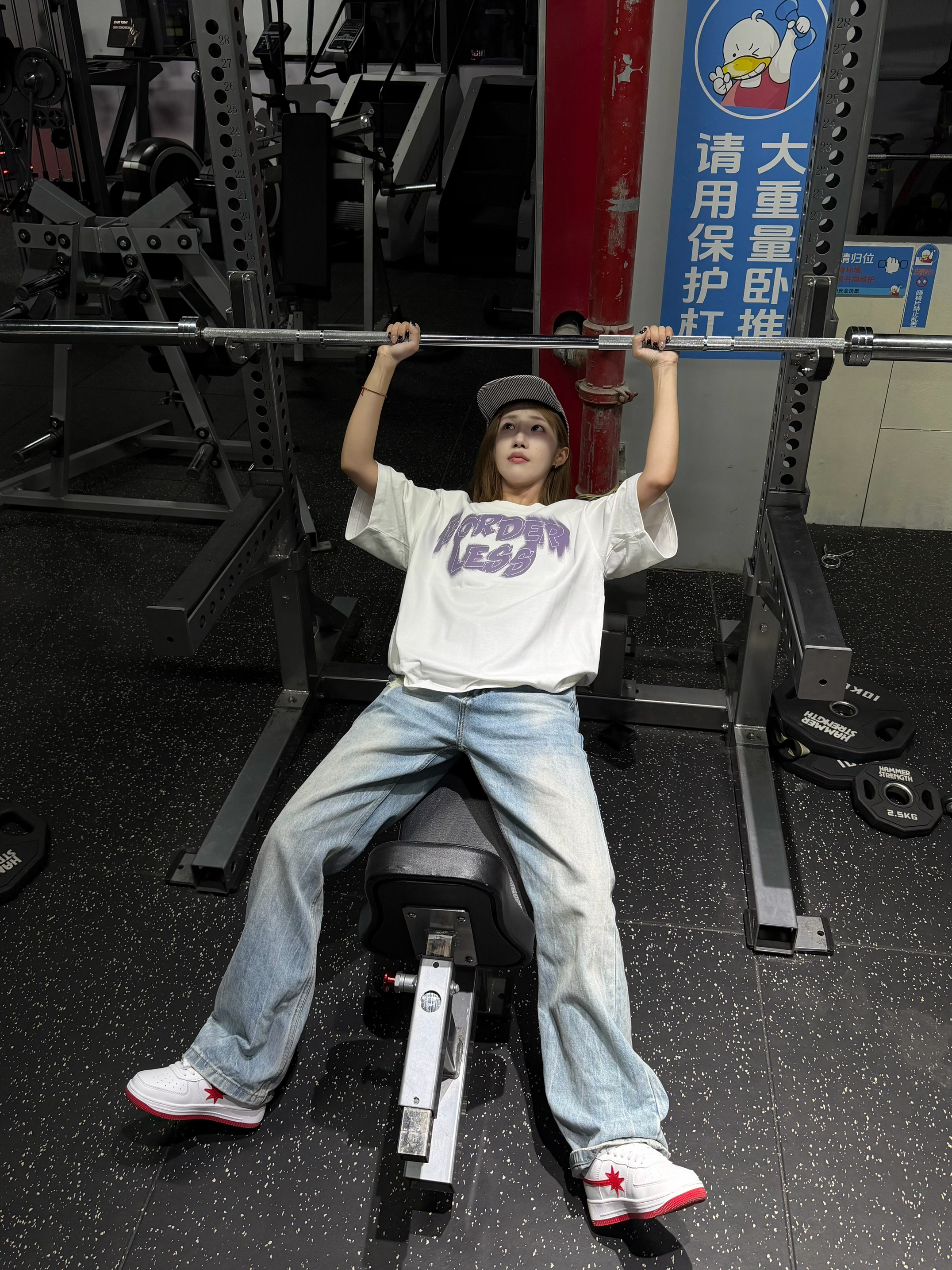 今日健身OOTD主打一个清爽不费力!重点夸这件白色印花短袖,紫调图案超戳我,温柔又吸睛,oversize版型遮肉又舒服,运动时完全无束缚~搭配浅蓝阔腿牛仔裤,松弛感拉满,再踩双红白鞋,元气满满去撸铁,心情都变超好💪