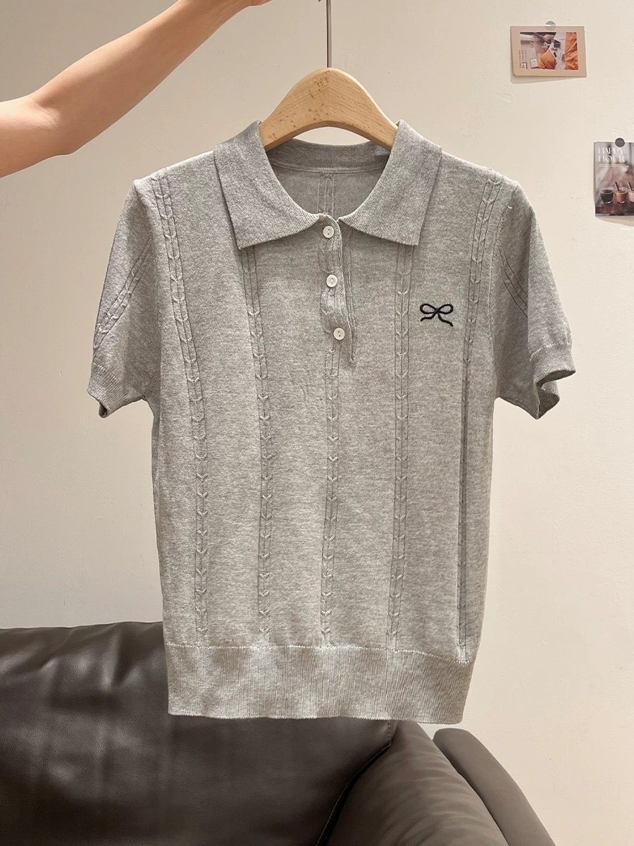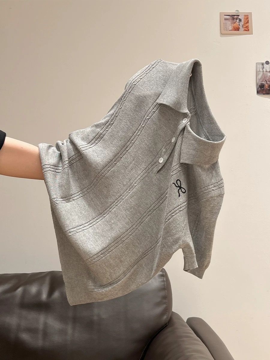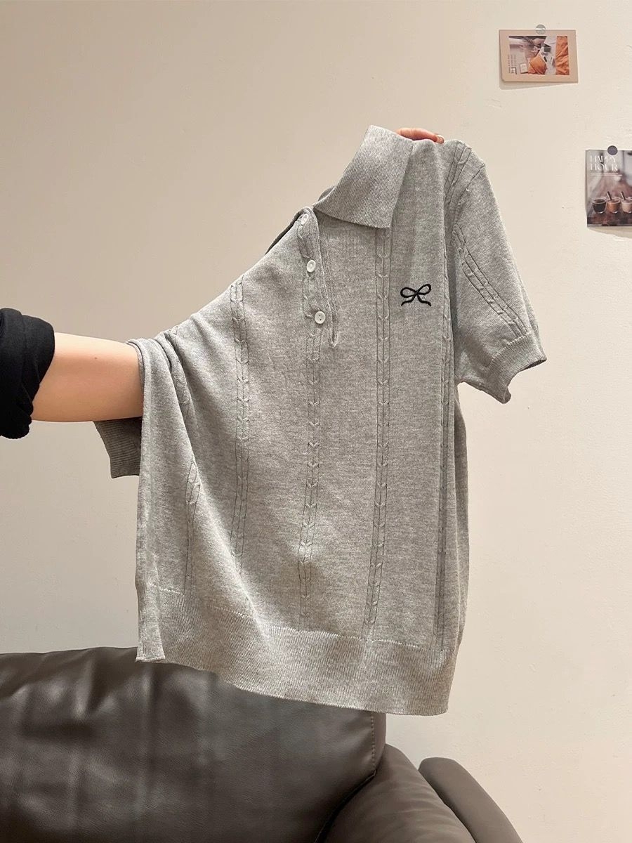 通勤党直接锁死这件灰色polo针织衫! 高级感浅灰+精致小蝴蝶结,简约又有细节,完全不会单调。 polo领修饰脸型,竖纹针织显瘦力拉满,上身利落又温柔,上班穿得体,日常穿随性。 冰丝面料透气不闷汗,夏天穿刚刚好,衣柜里永远缺一件这种万能百搭的基础款!