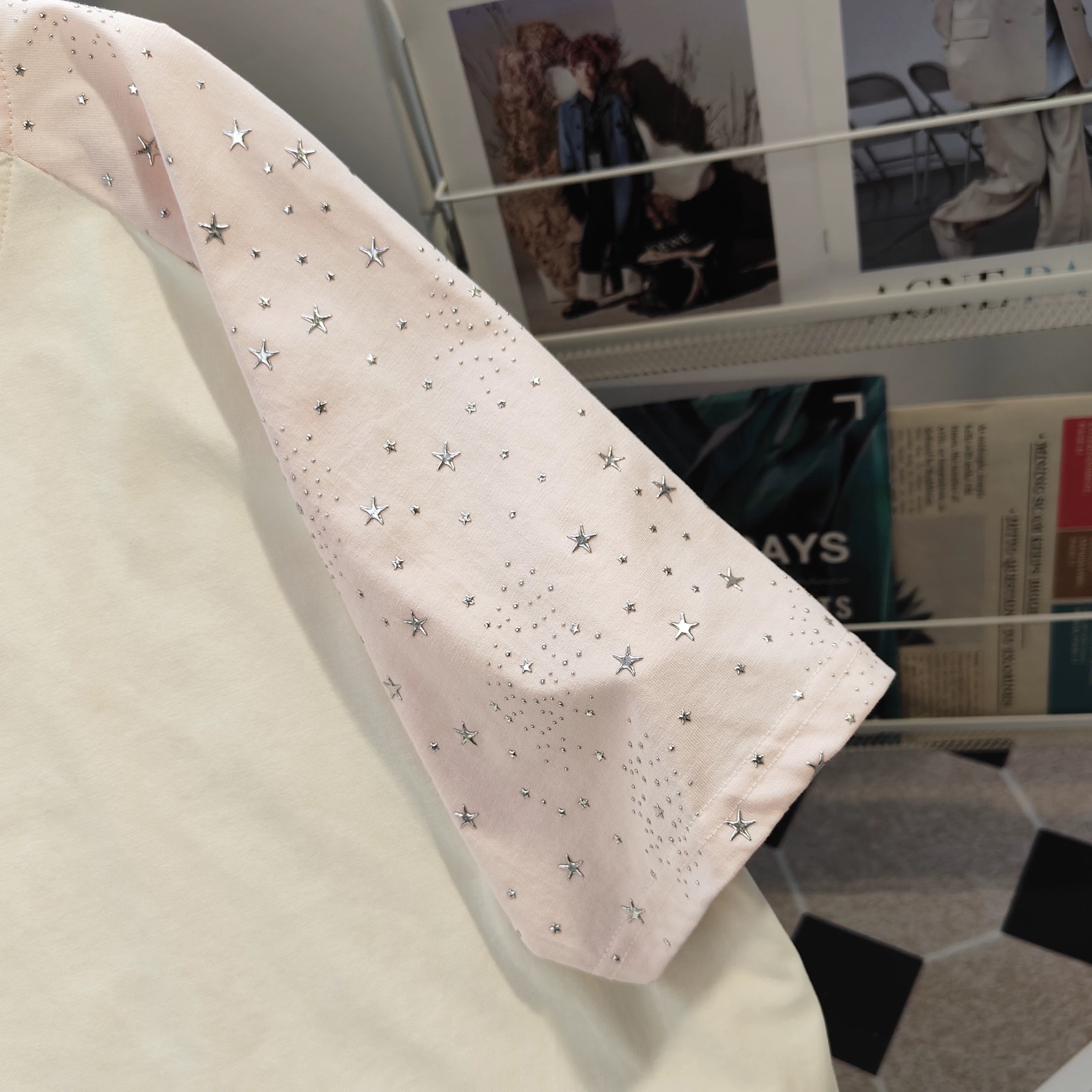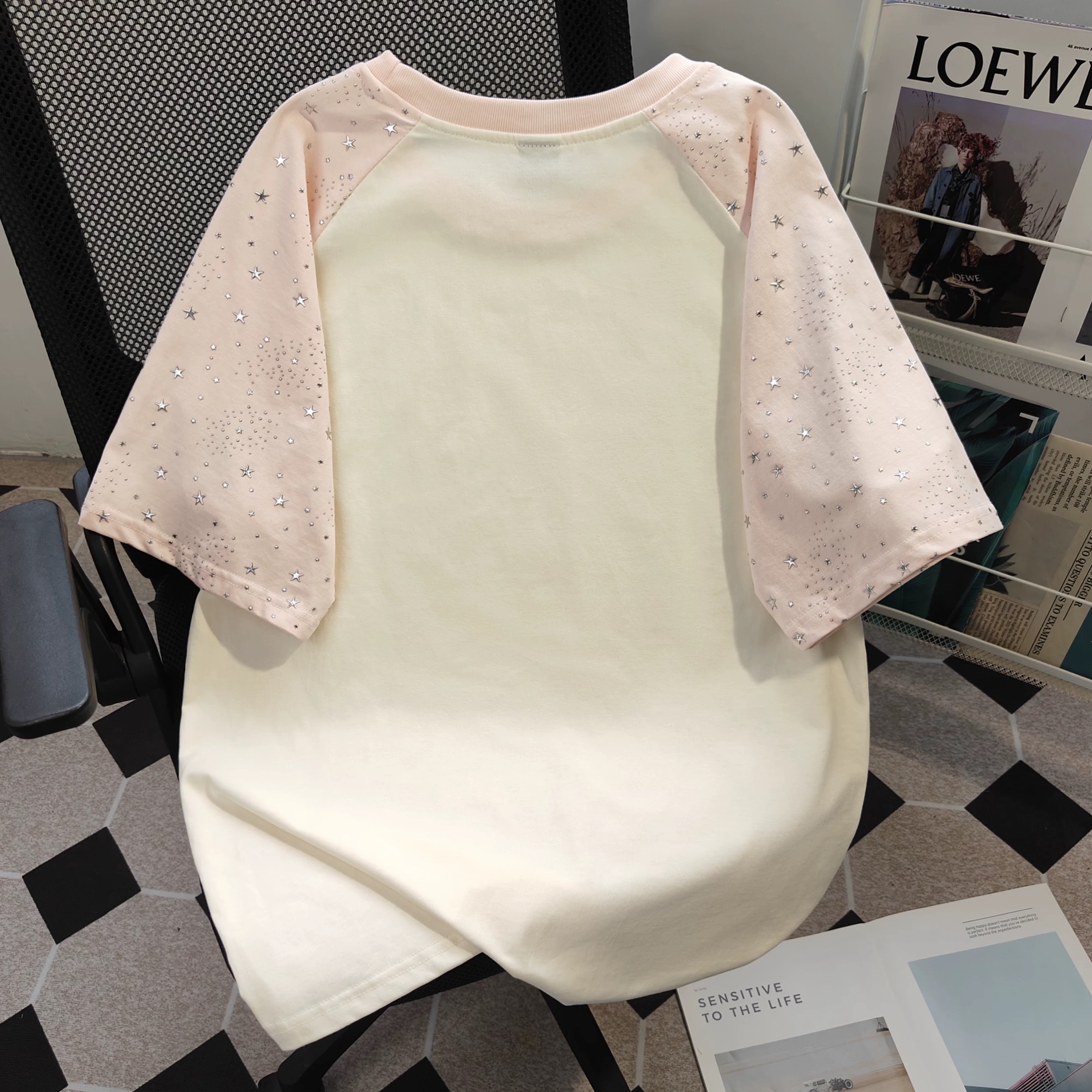 谁懂啊!这件粉白插肩袖T恤直接把少女心焊死了💖 奶白底色+柔粉插肩袖,软乎乎的巨显嫩,黄皮穿也完全不踩雷! 插肩袖是带细闪烫钻的设计,阳光下blingbling的,甜而不腻;正面手绘风早餐涂鸦(咖啡+面包+牛奶),元气感拉满,减龄又可爱! 宽松版型对身材包容度超高,腰腹肉肉直接藏住,夏天穿清爽不闷汗,日常、上学、约会都能搭~ 配牛仔裤是元气甜妹,搭百褶裙秒变韩系学妹,闭眼入的夏日甜妹刚需款!