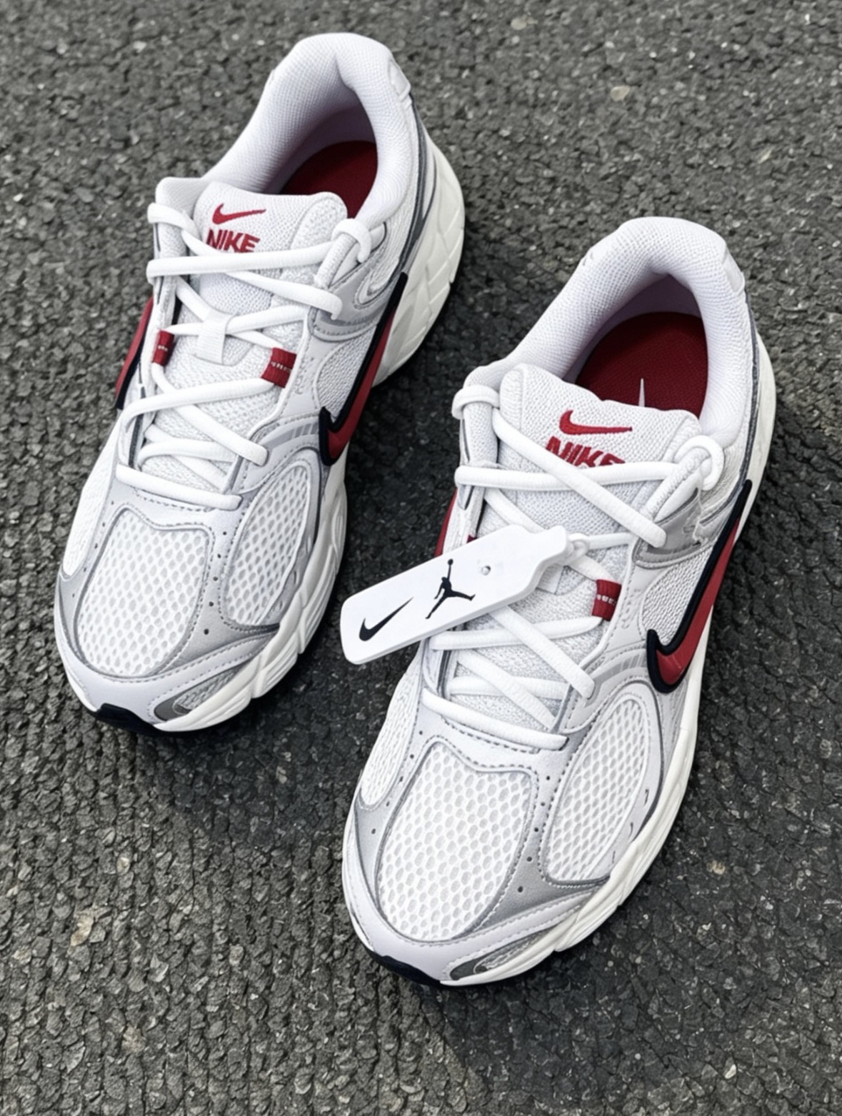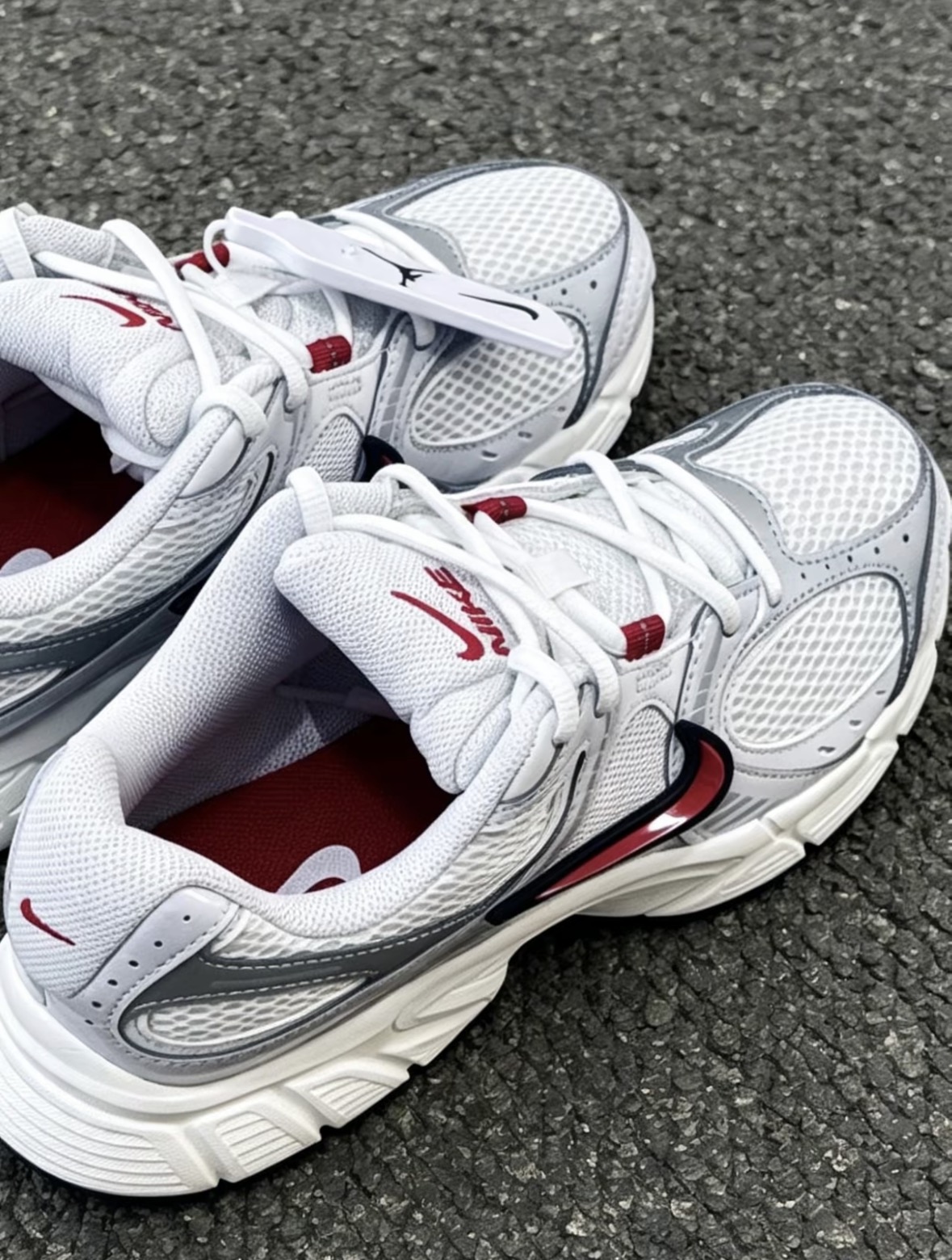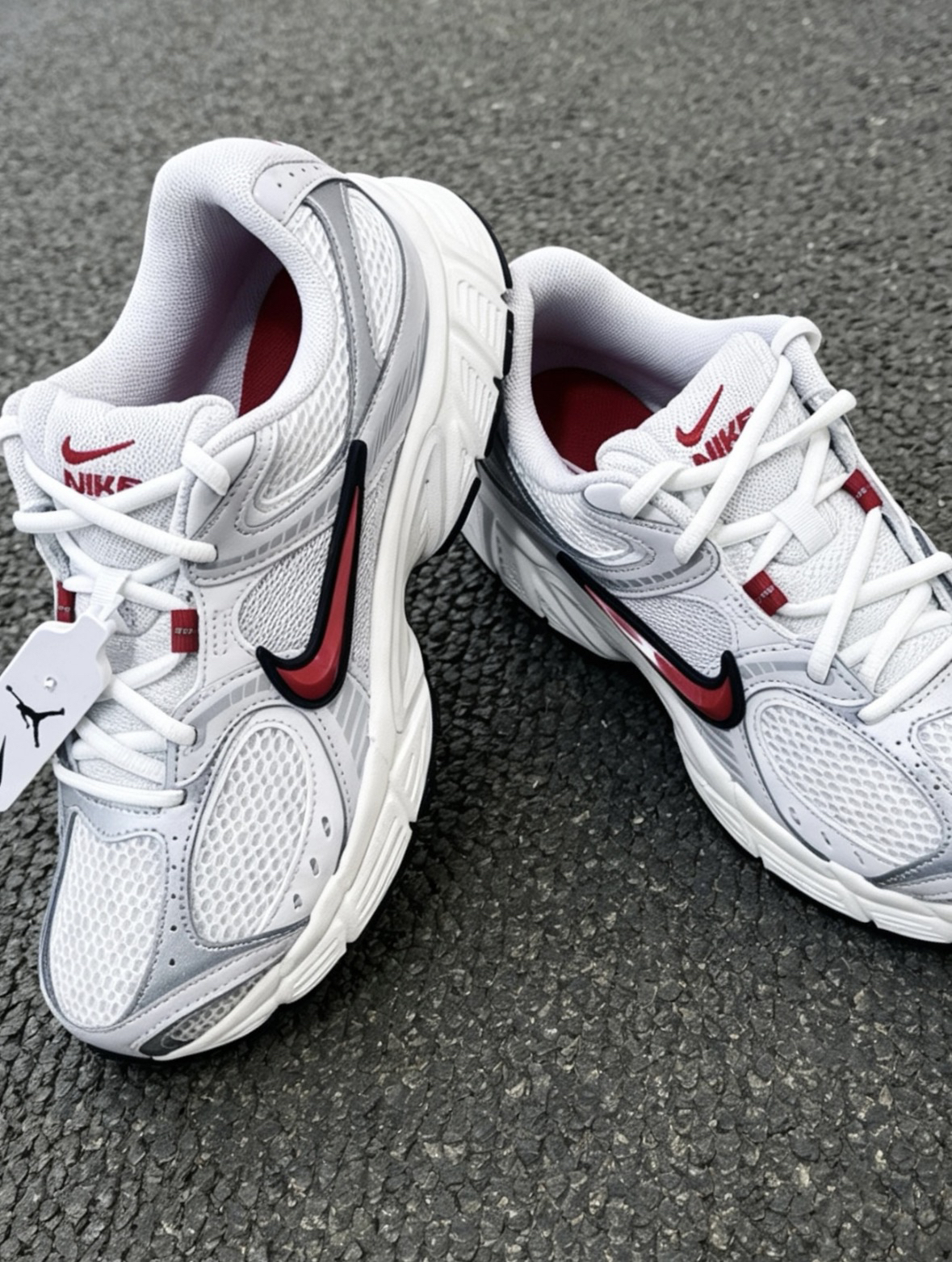 红白灰配色的复古网面鞋,单只280g左右,上脚没负重感。中底是软弹适中的泡棉,通勤走一天脚不累,橡胶大底在雨天瓷砖上也能防滑。侧边的红色Swoosh带点微反光,搭配牛仔裤或工装裤去上班都很合适,开春日常穿这双挺省心