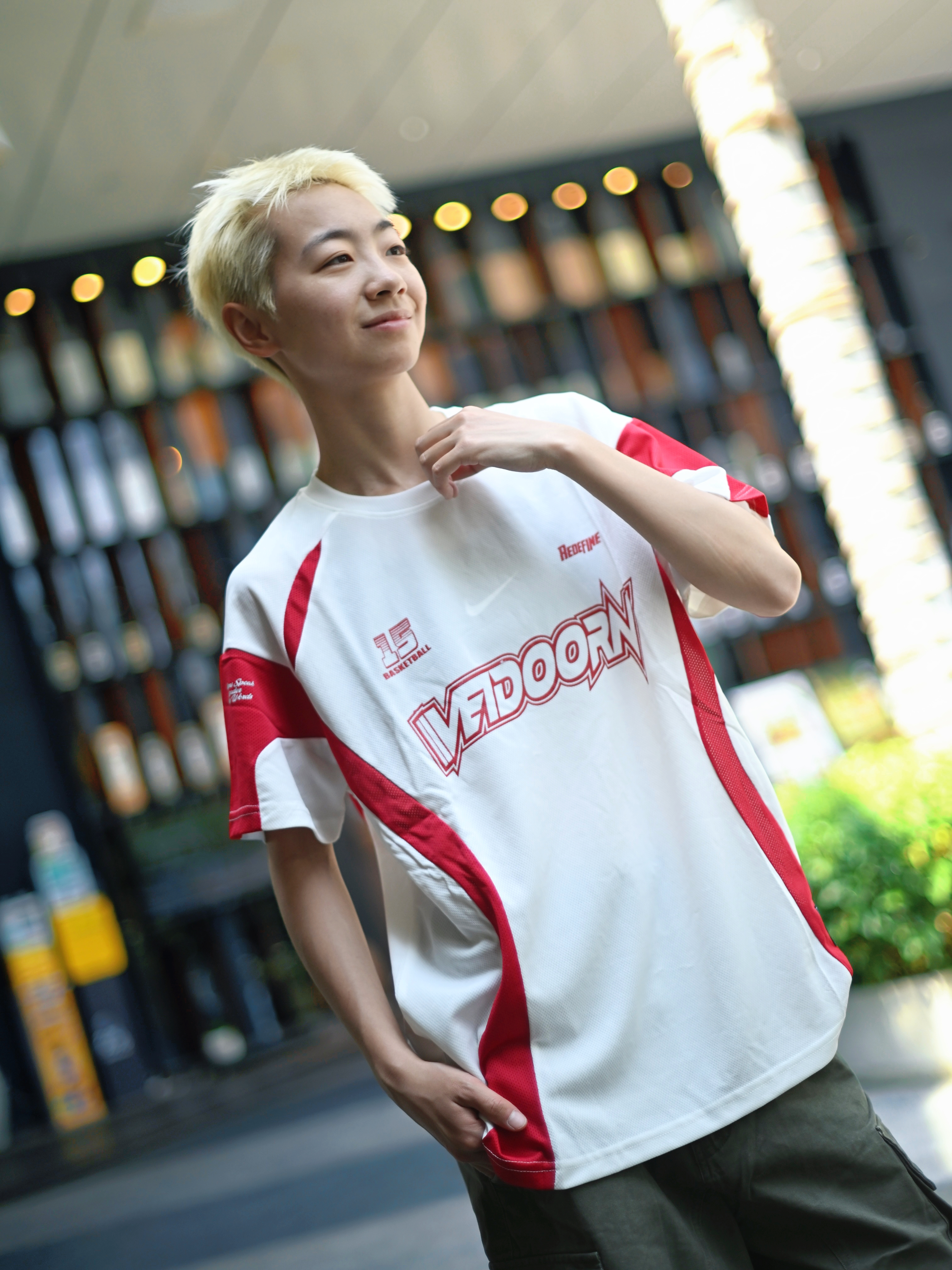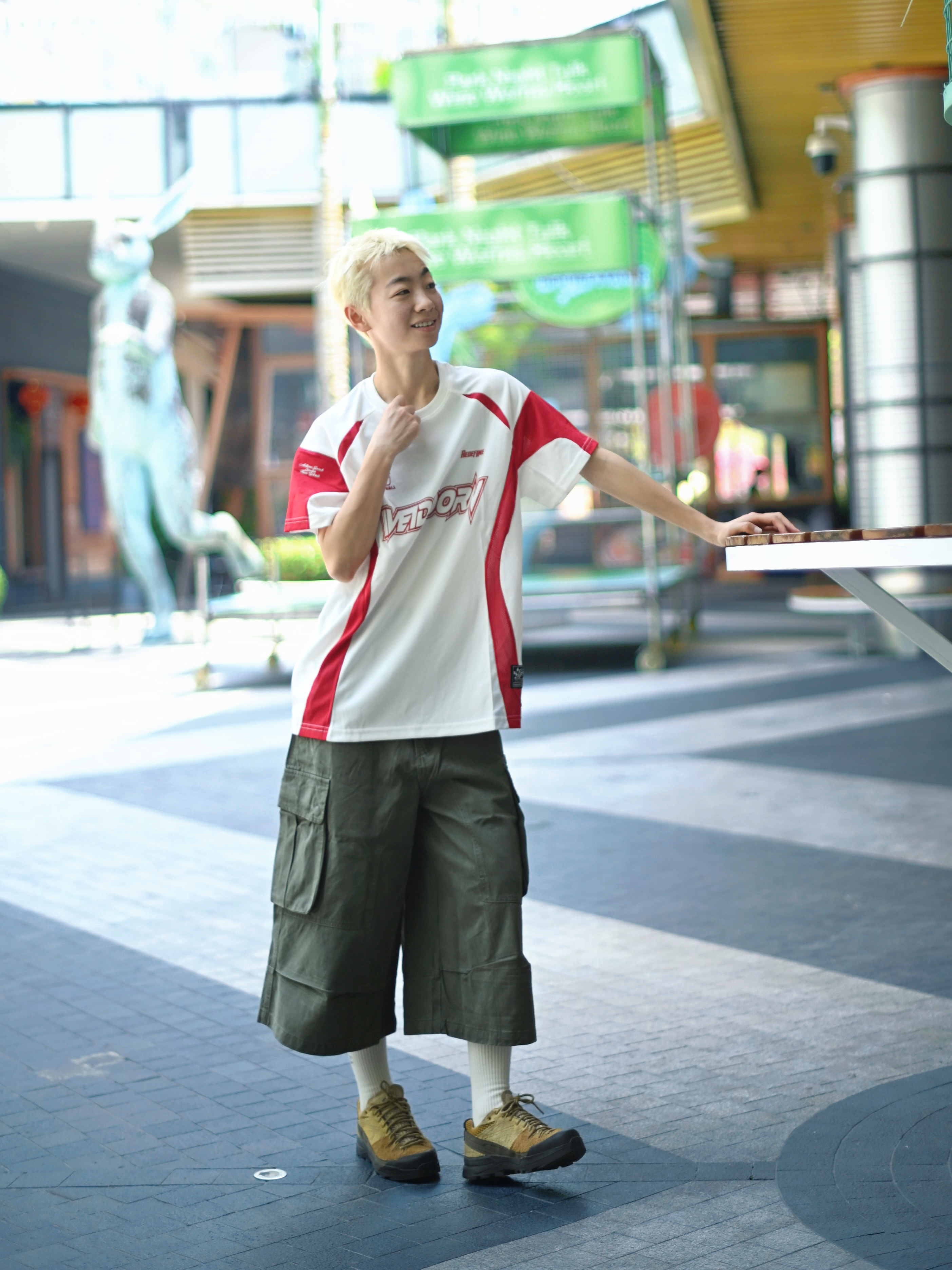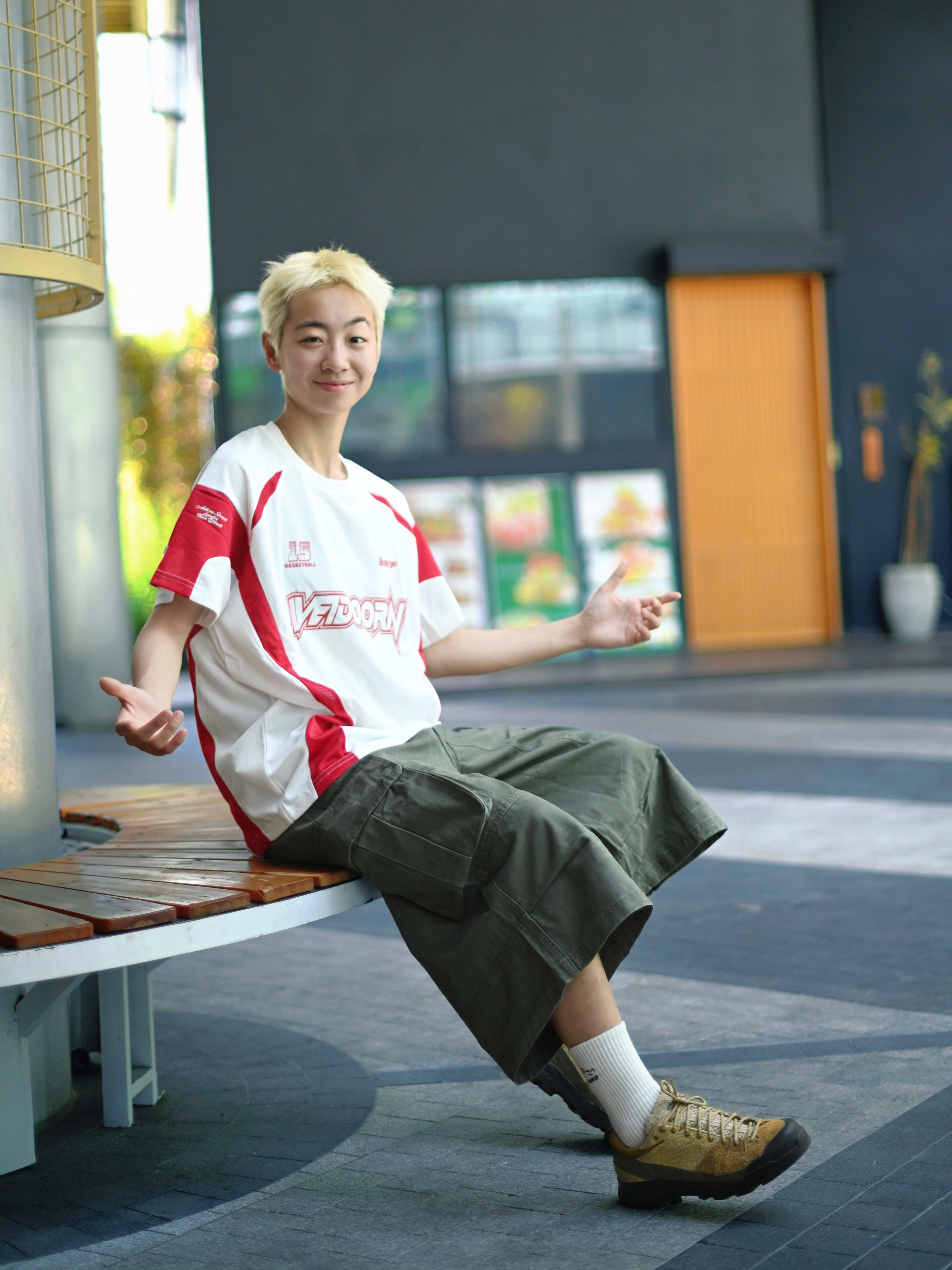 172CM|55KG 👔:m👖:m|👟:39码 上身维动「瞬息」撞色拼接篮球短袖~红白撞色+美式字母印花 宽松圆领适配各种身形 速干面料透气不闷 春夏运动、街头出片都能hold住 中性风格超百搭耶✌️ 下装选军绿工装阔腿裤 脚上踩棕黄登山靴 搭配白色中筒袜,复古运动感拉满~