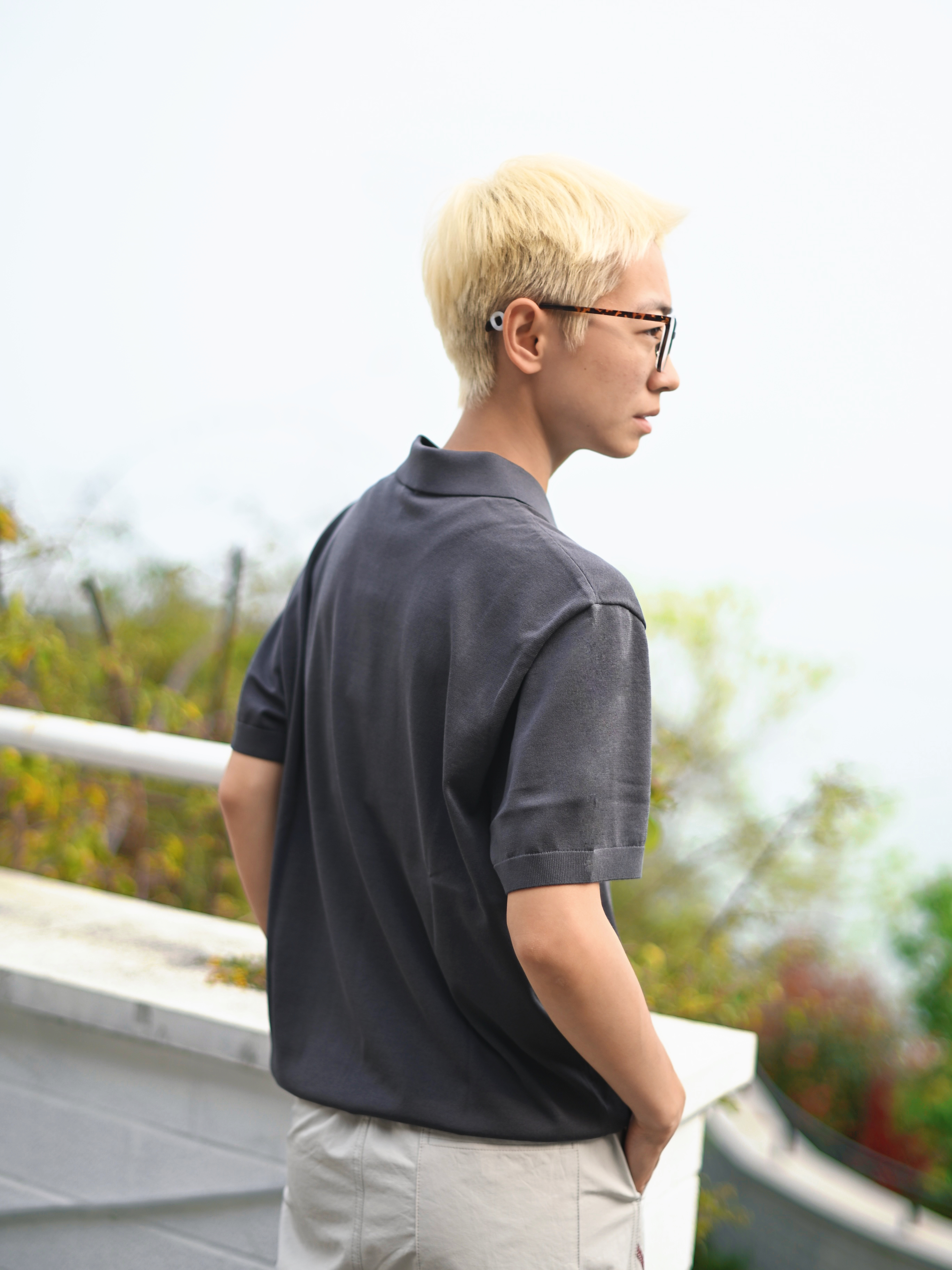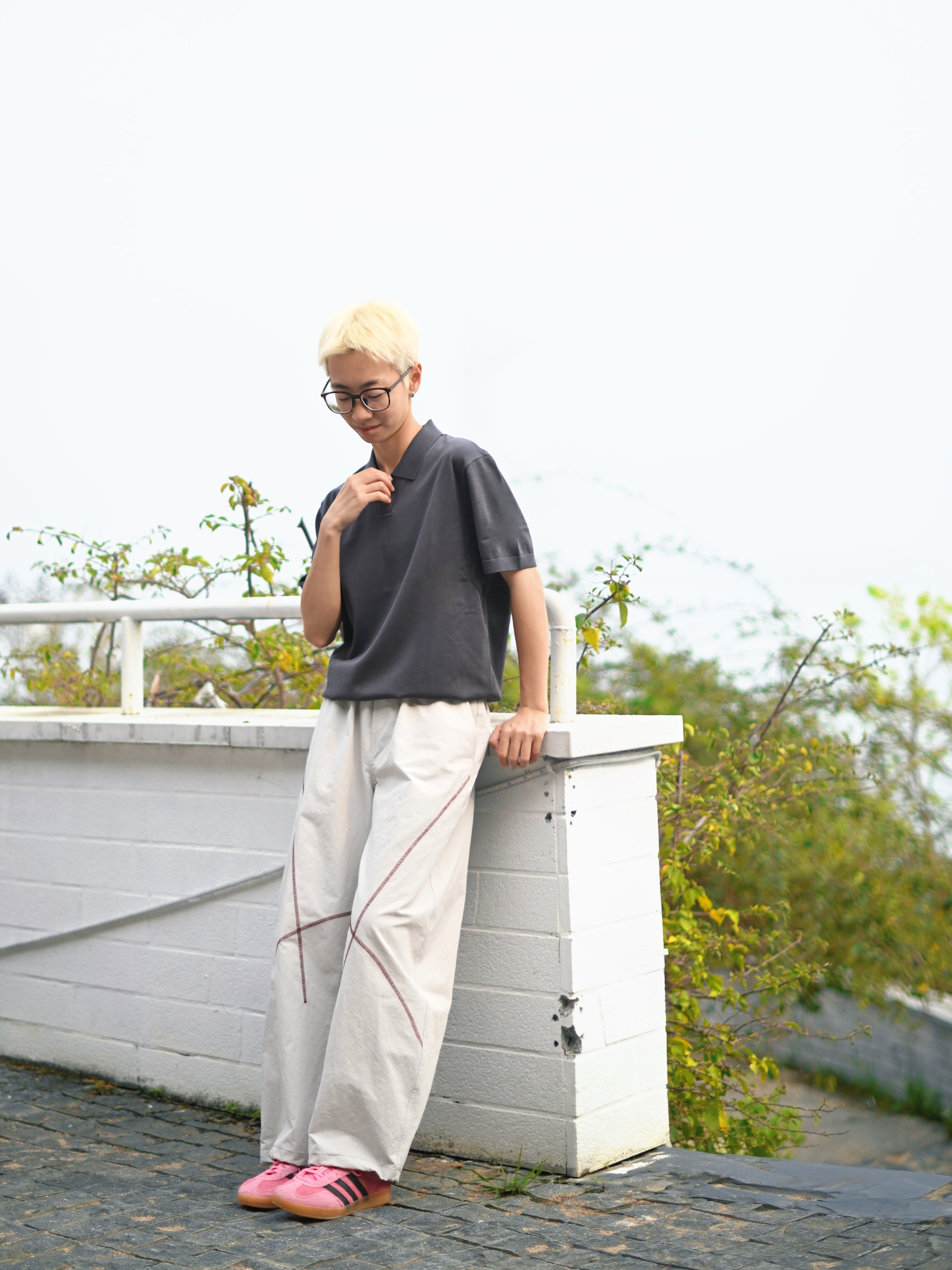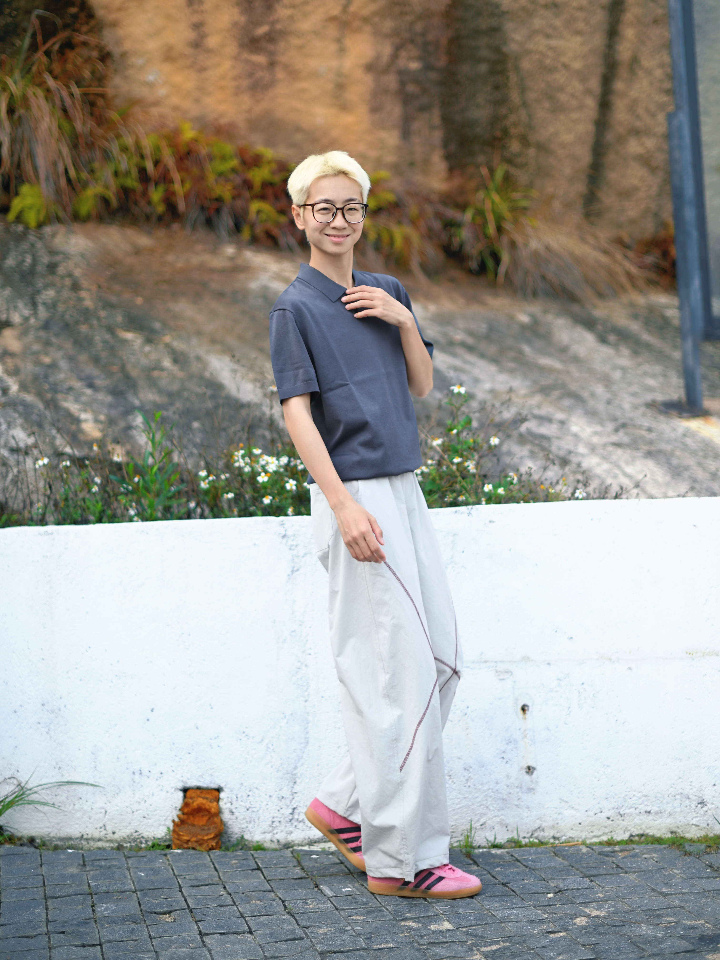 172CM|55KG 👔:m👖:m|👟:39码 🌞春夏穿搭的灵魂,是一件「会呼吸」的Polo衫~ 上身布先生意式海鸥领针织短袖 轻商务和休闲感揉得恰到好处。 春末夏初穿既透气又自在 运动或日常出街都无负担; 海鸥领弱化正式感,纯色+简约剪裁自带“老钱风”高级感 搭配米白宽松裤+粉色休闲鞋,浅发色和黑框眼镜加持,中性氛围感拉满!