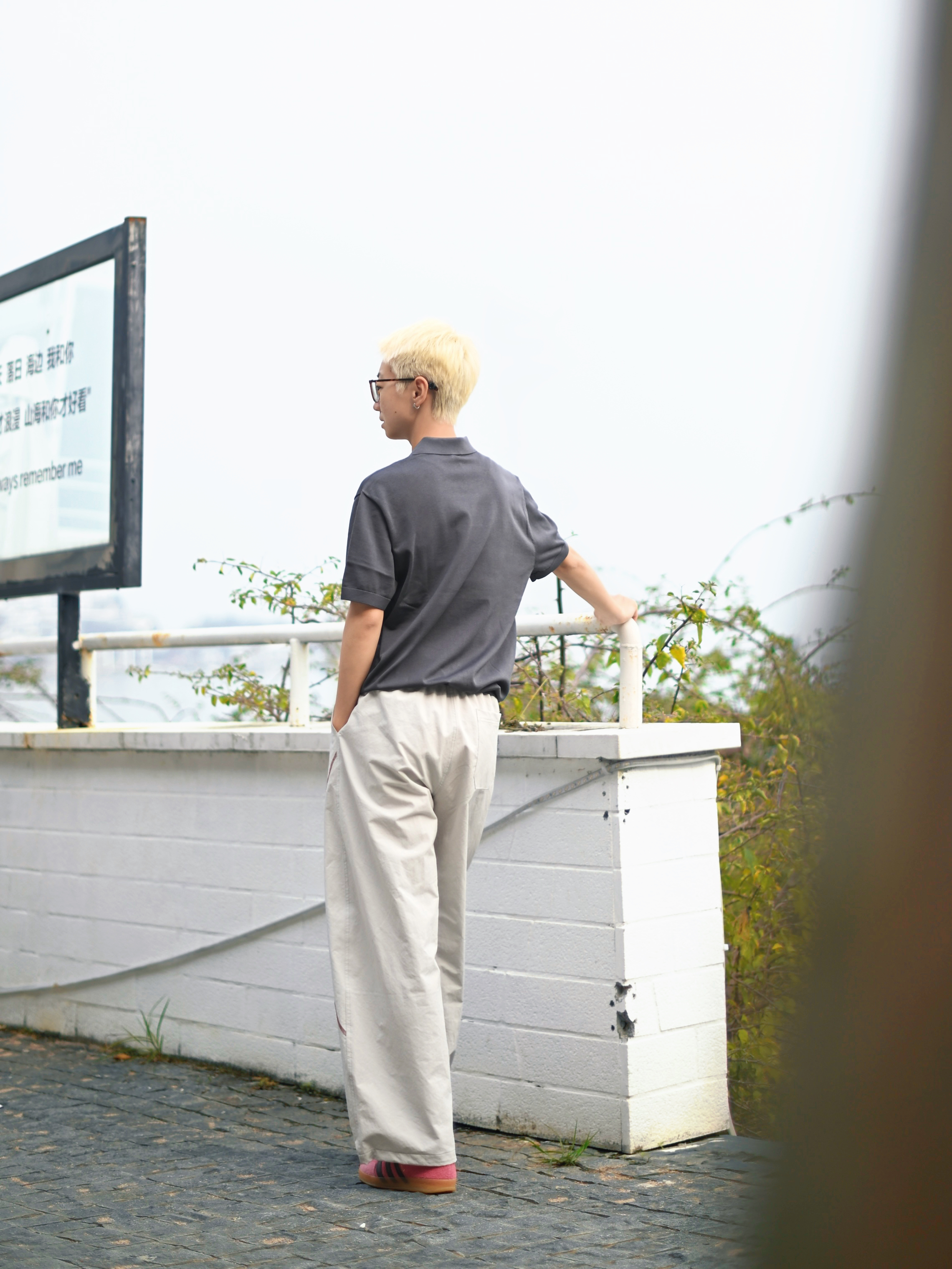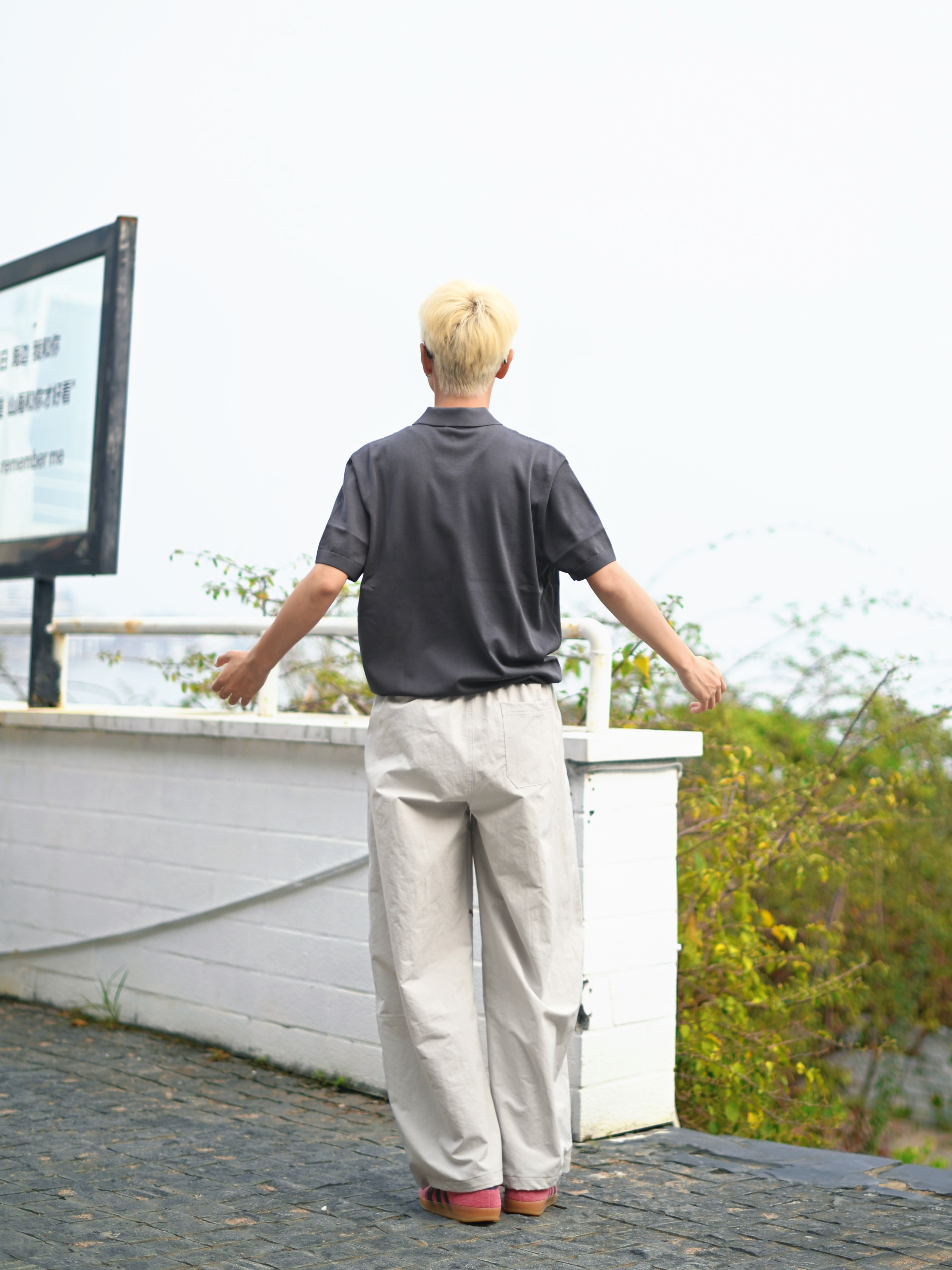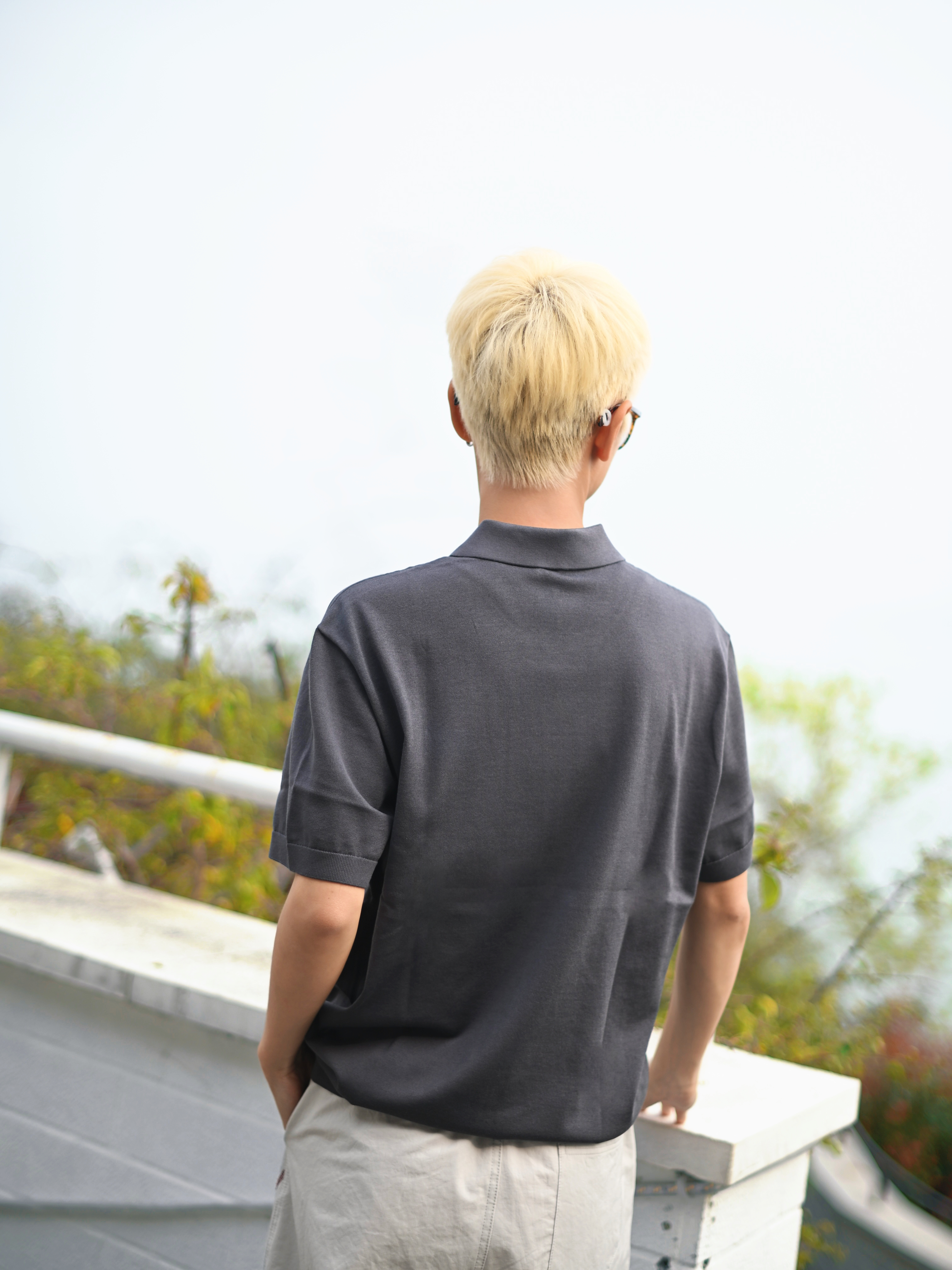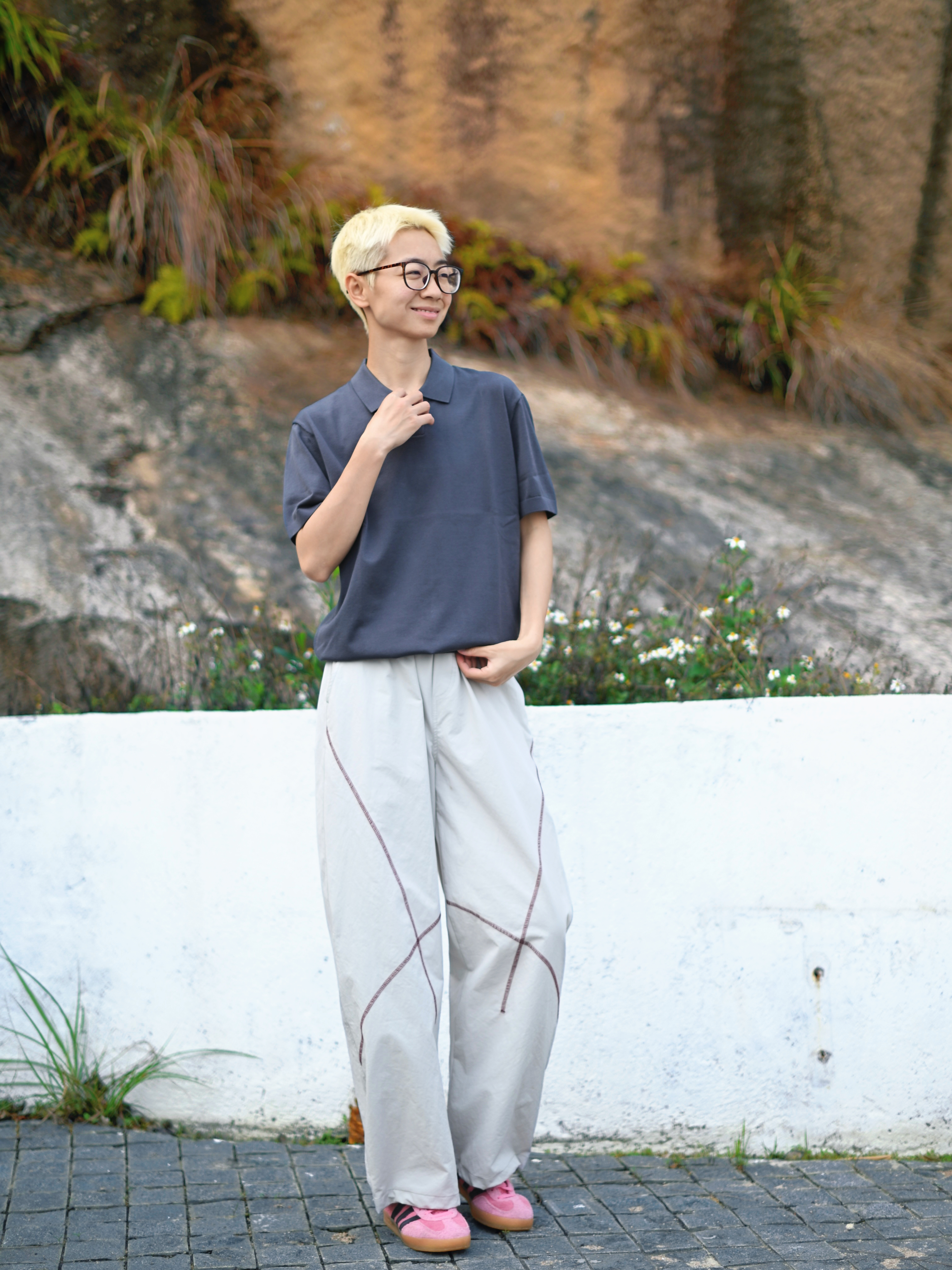 172CM|55KG 👔:m👖:m|👟:39码 🌞春夏穿搭的灵魂,是一件「会呼吸」的Polo衫~ 上身布先生意式海鸥领针织短袖 轻商务和休闲感揉得恰到好处。 春末夏初穿既透气又自在 运动或日常出街都无负担; 海鸥领弱化正式感,纯色+简约剪裁自带“老钱风”高级感 搭配米白宽松裤+粉色休闲鞋,浅发色和黑框眼镜加持,中性氛围感拉满!