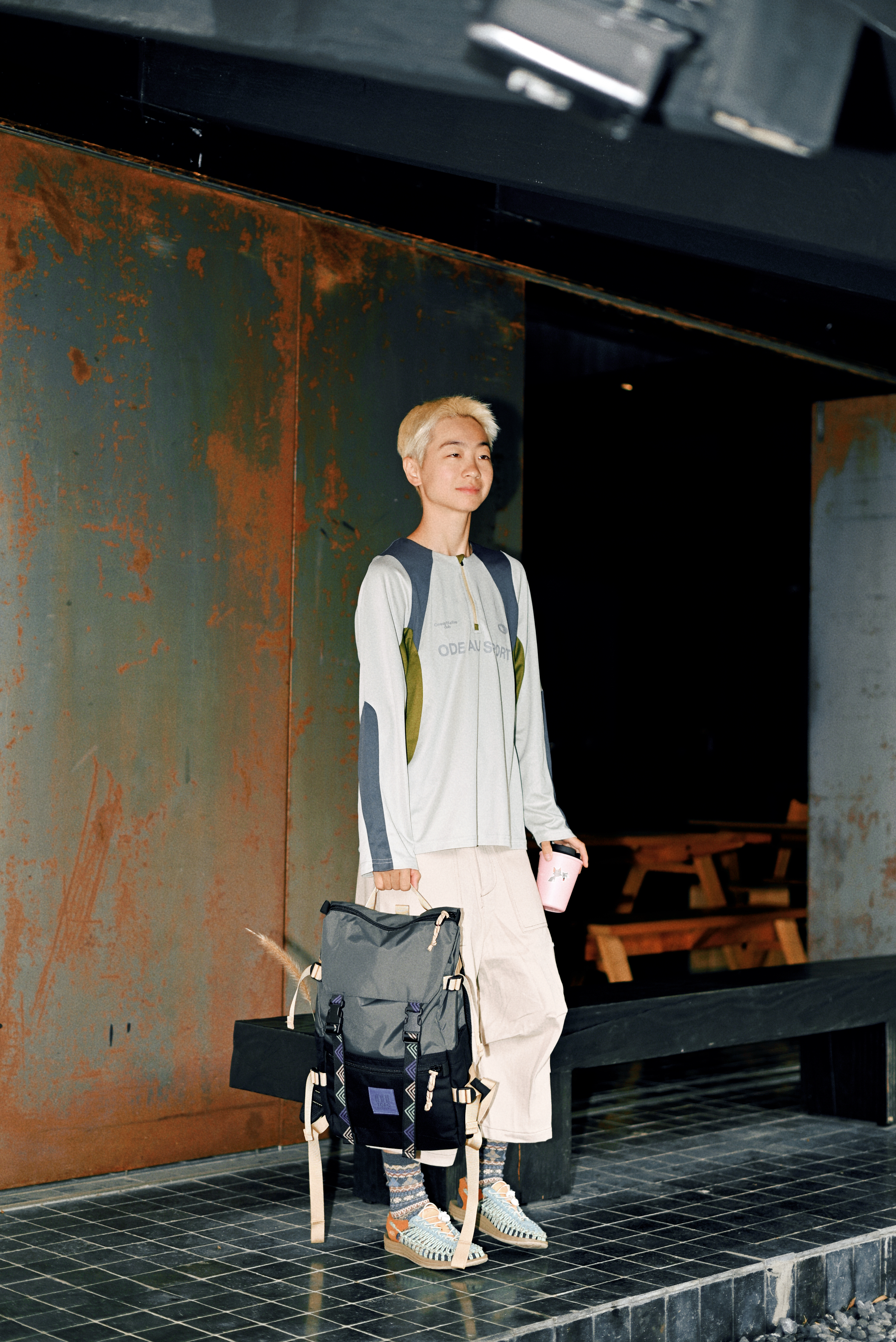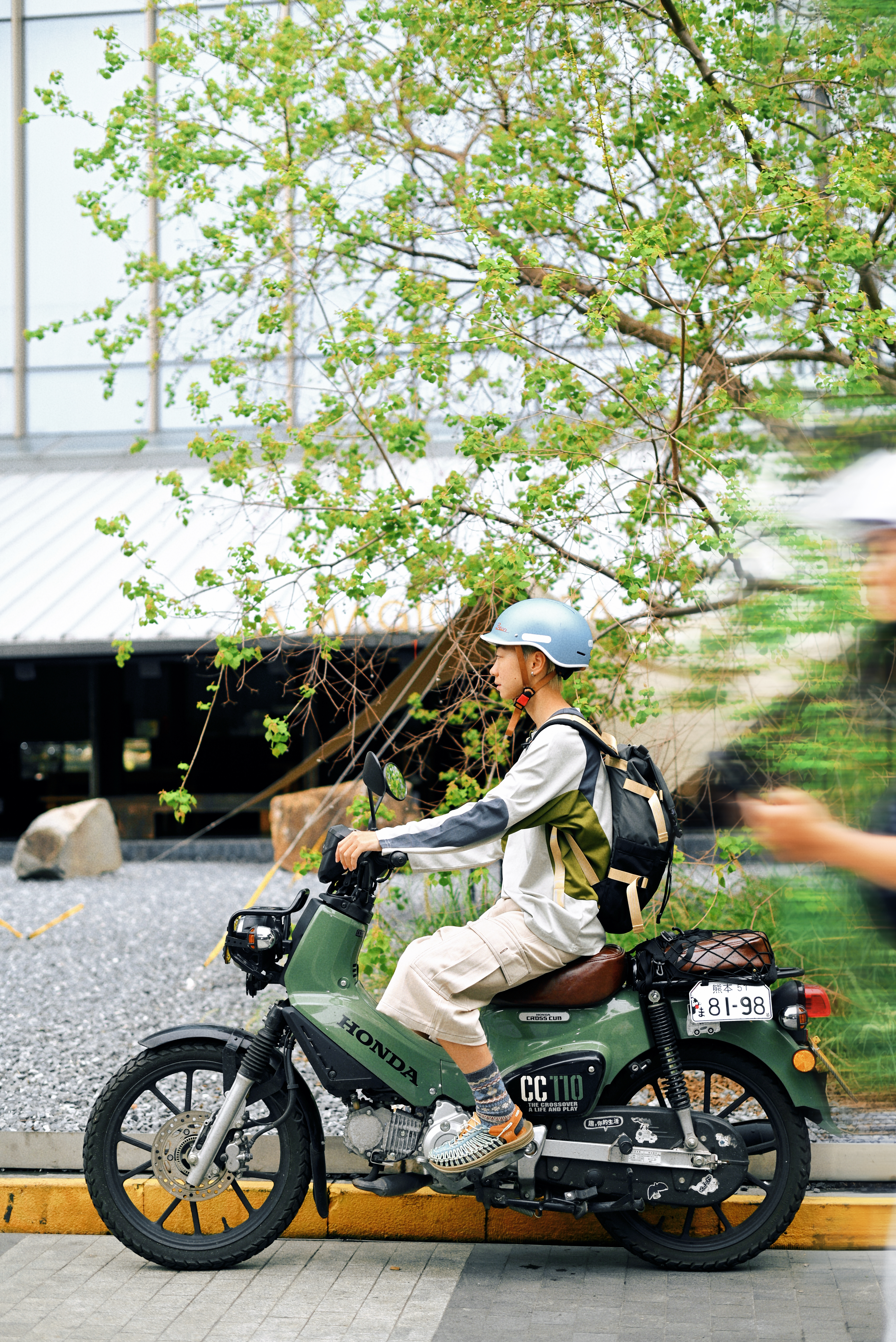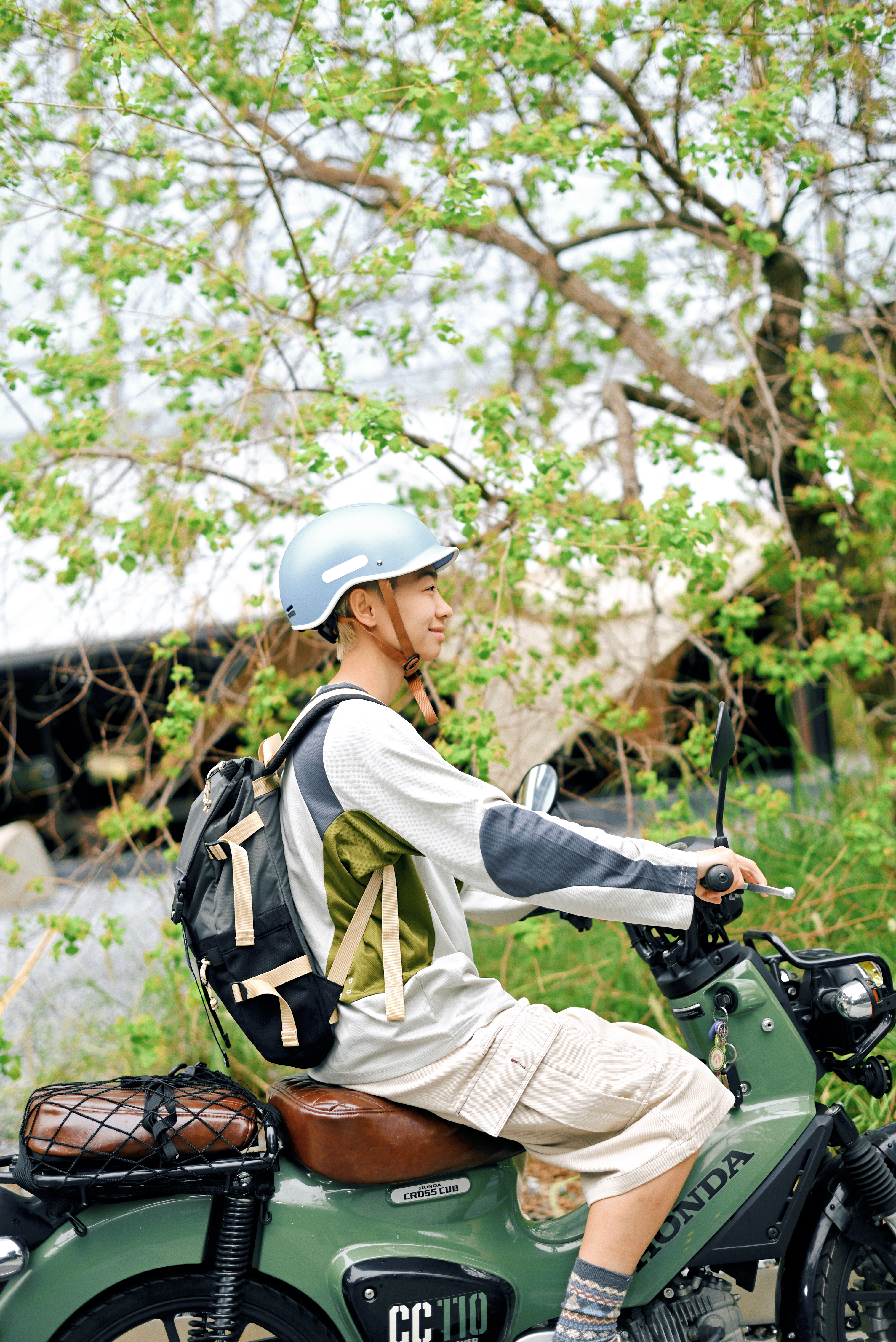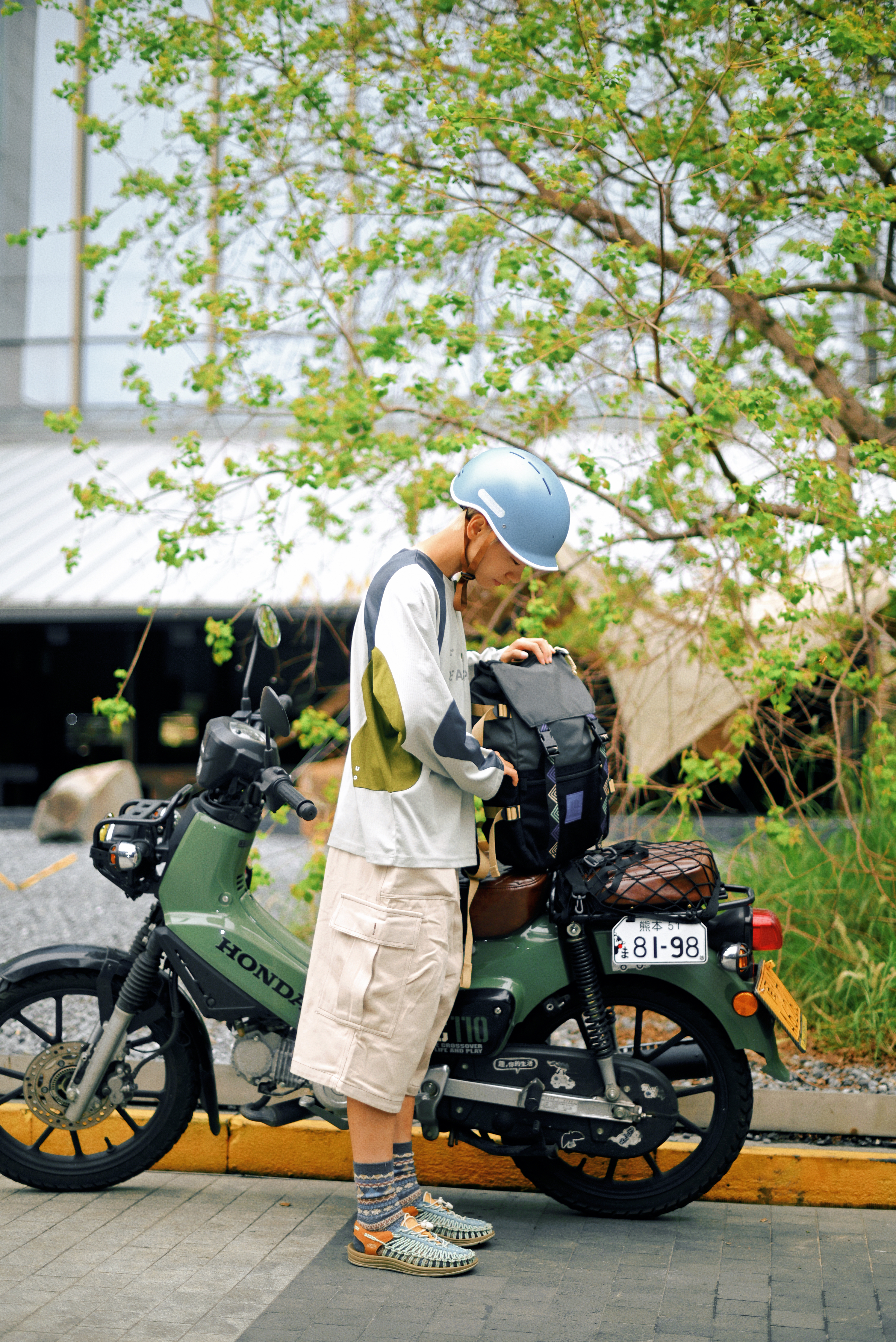 一顶浅蓝复古头盔,解锁骑行仪式感; 拼色长袖T恤+卡其工装裤 宽松廓形藏肉又随性 行走间自带日系少年气 脚踩编织凉鞋配撞色袜 细节处透出户外慵懒美学 背负多功能战术背包,实用与造型兼得 通勤露营一键切换 绿色Honda CC110复古摩托作伴 用一身松弛感,把日常过成诗。