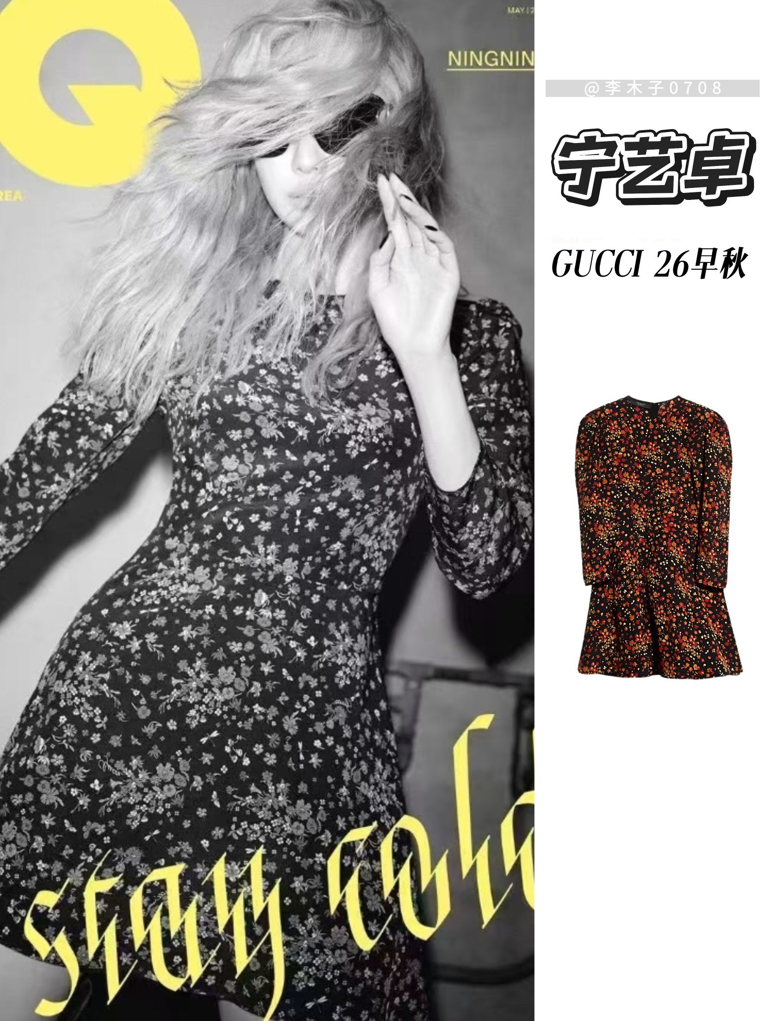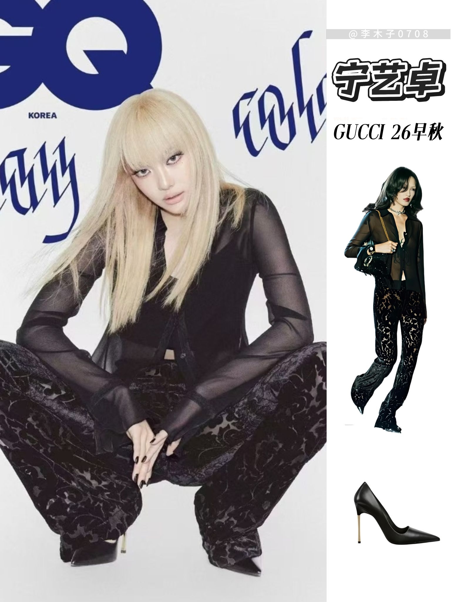 宁艺卓首次登上韩版《GQ》实体刊,也是首位登上该刊的中国籍艺人,GUCCI全程为其保驾护航推封。 三套造型分别对应GUCCI 26早秋的不同风格:酷飒皮衣辣妹风、透视纱衫慵懒风、复古碎花裙氛围感,完整演绎了品牌当季的设计语言。