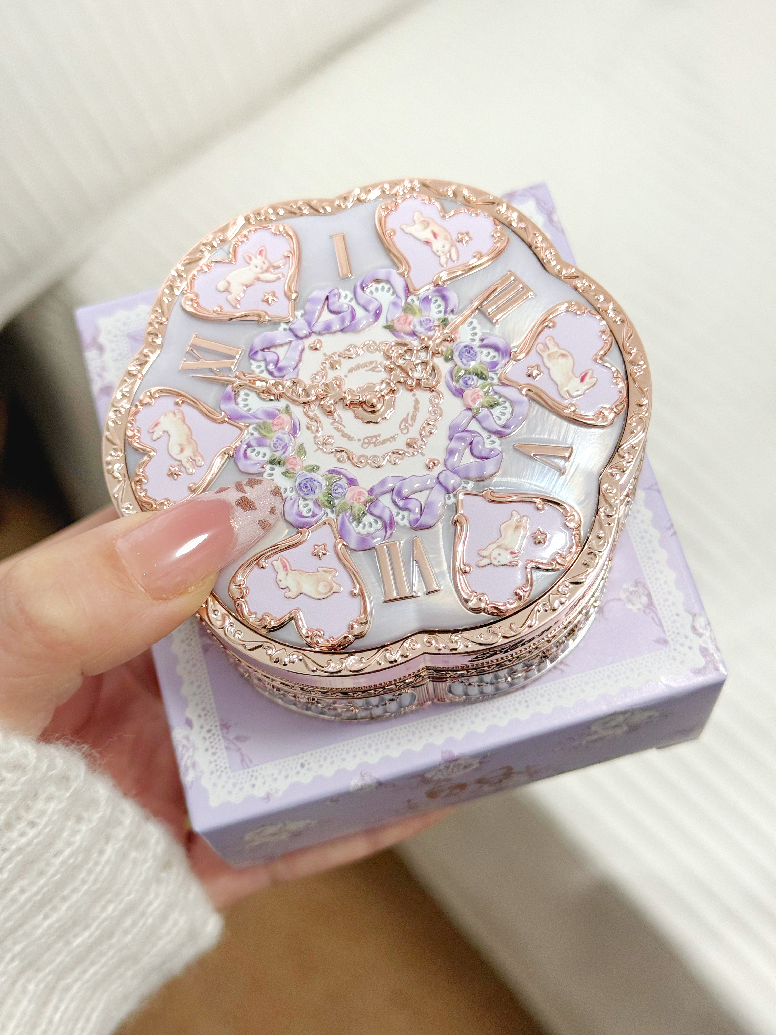 又是被花知晓美貌打动的一天 这个紫色💜外壳着实有韵味 搭配上钟表造型还有浮雕小兔做点缀 细节拉满了 我入的是N02喔 平时冬混干夏混油的肤质 上脸后自然服帖 也不会假白 一整天下来妆感还蛮完整的 越看越喜欢耶 整个妆面轻薄又滋润 颜值和实力均在线~